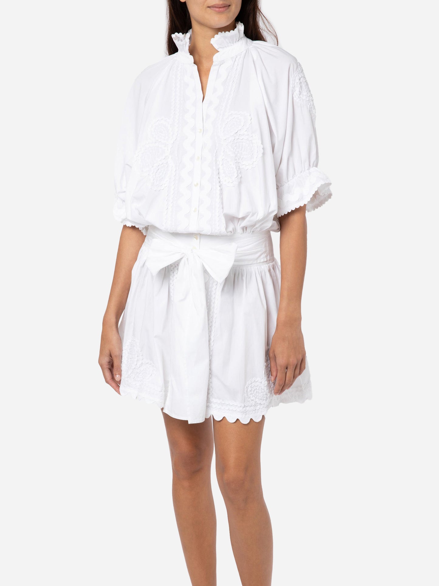 A blouson dress made from lightweight poplin with scalloped trim and ric-rac embroidered designs.