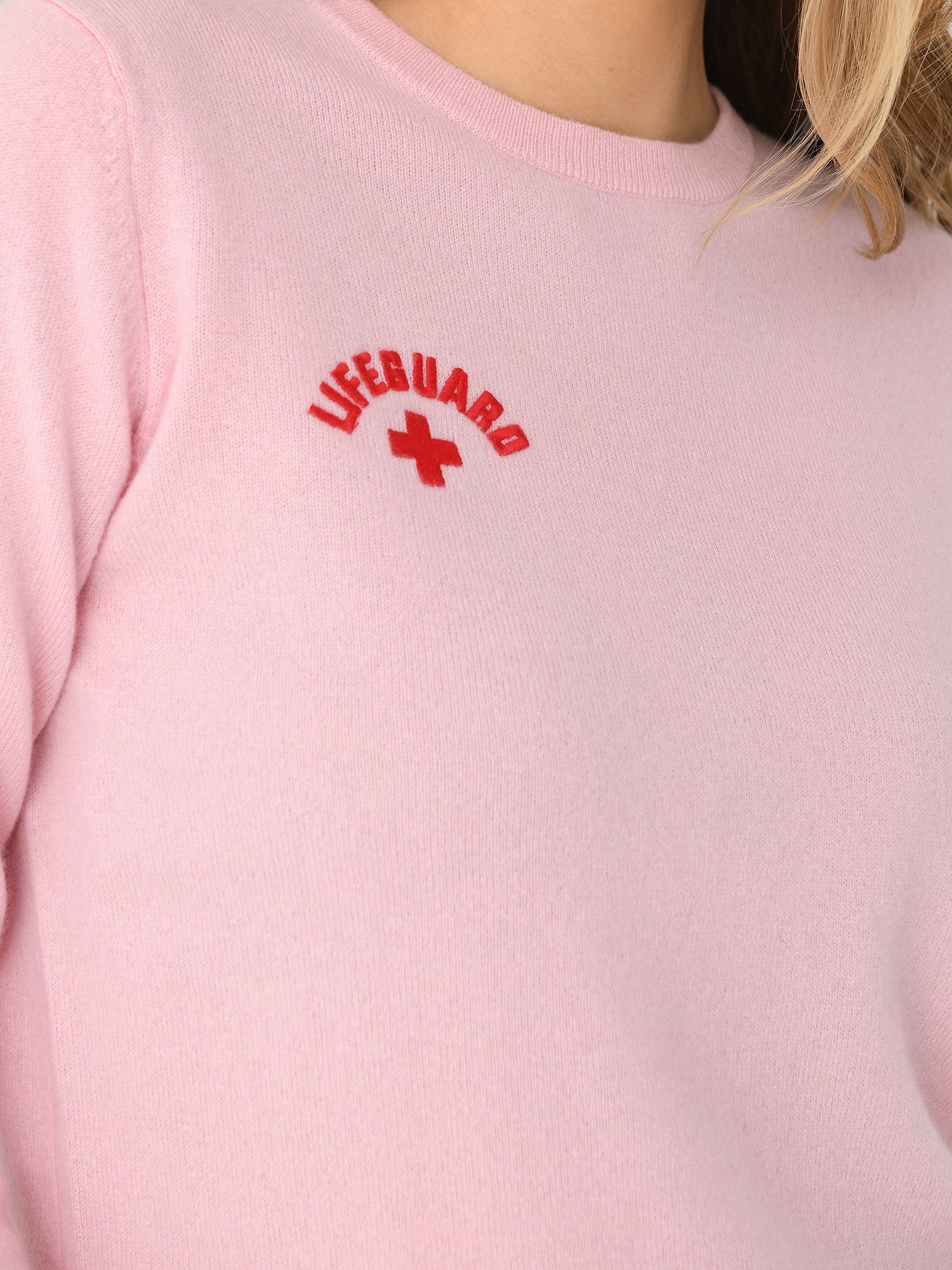 A super soft cashmere sweater featuring a red embroidered lifeguard graphic.