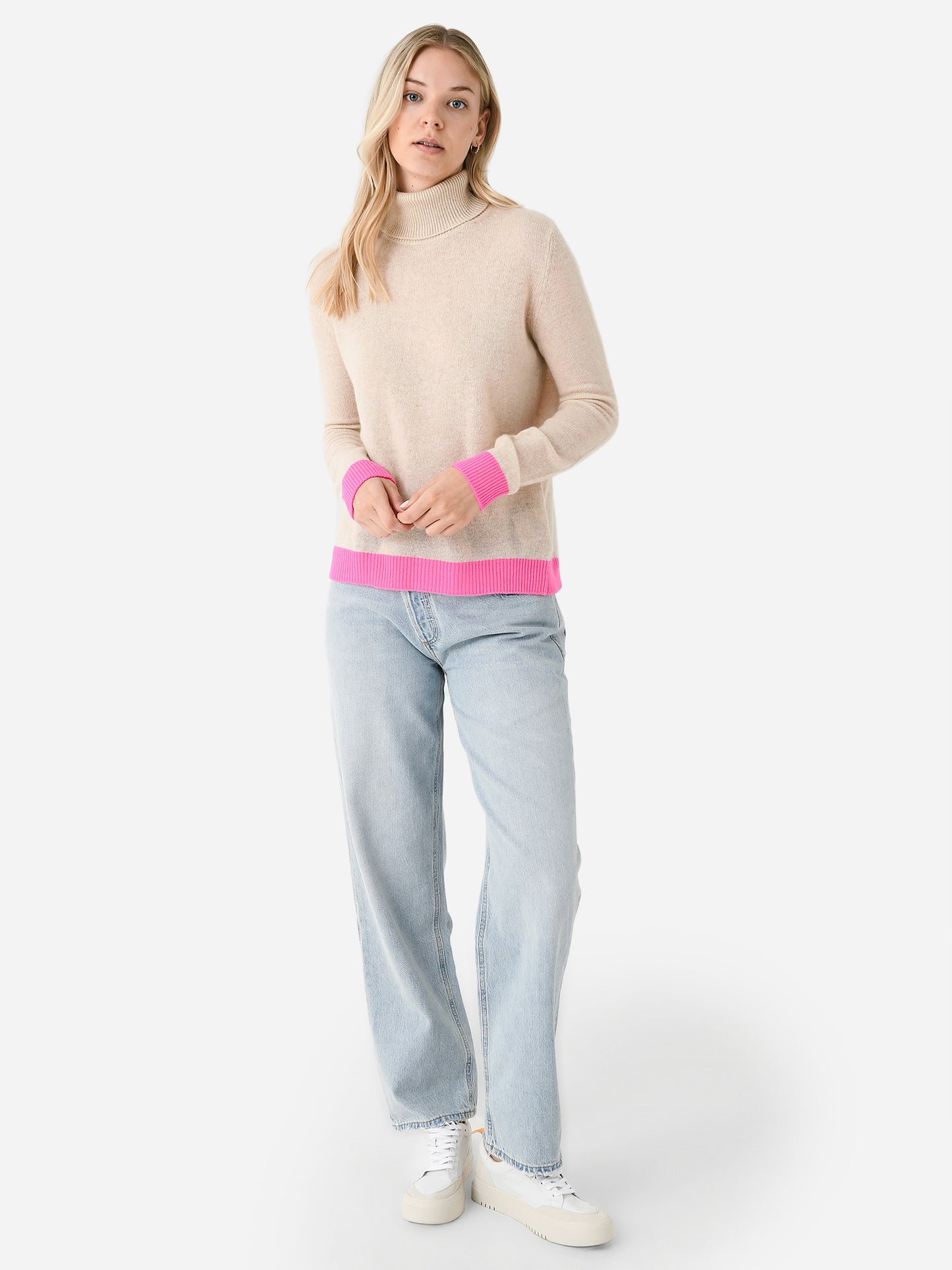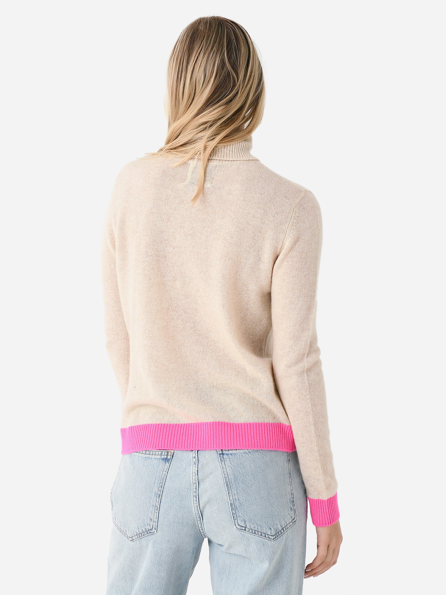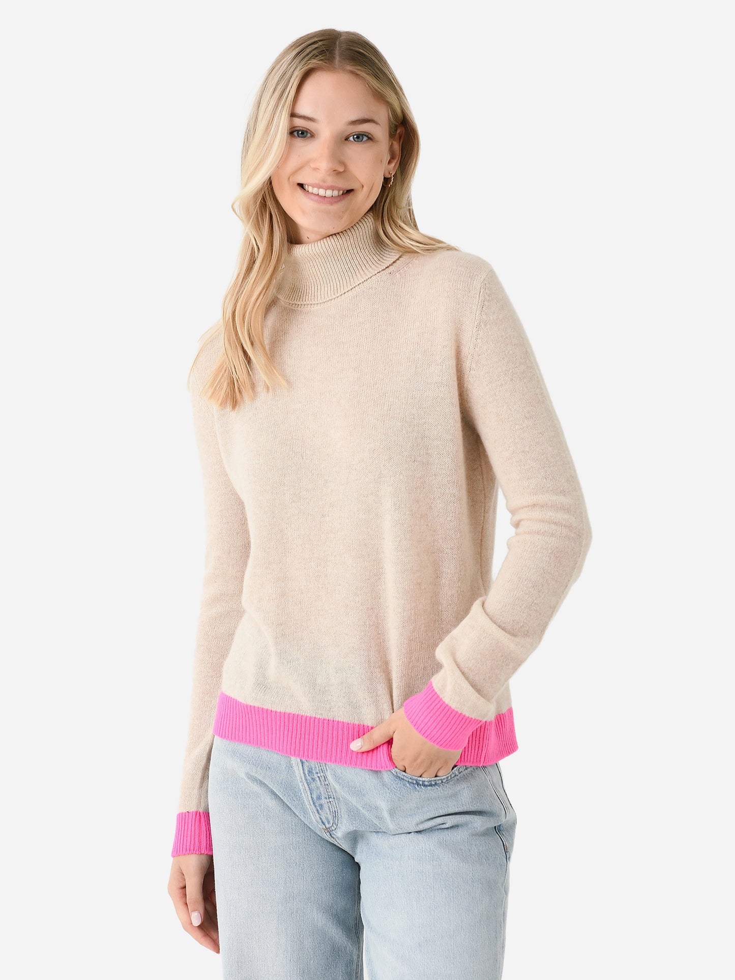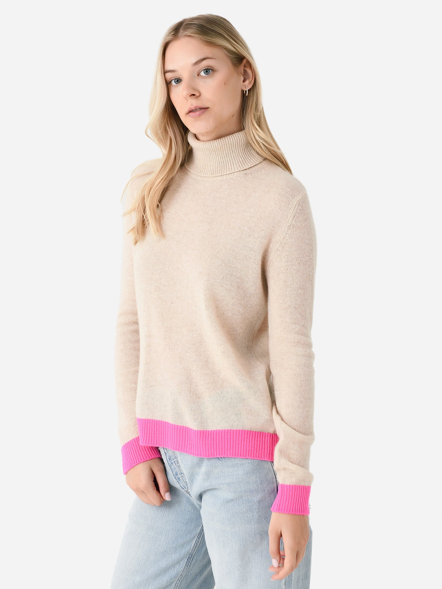 An incredibly soft cashmere turtleneck sweater with contrast cuffs and hem.