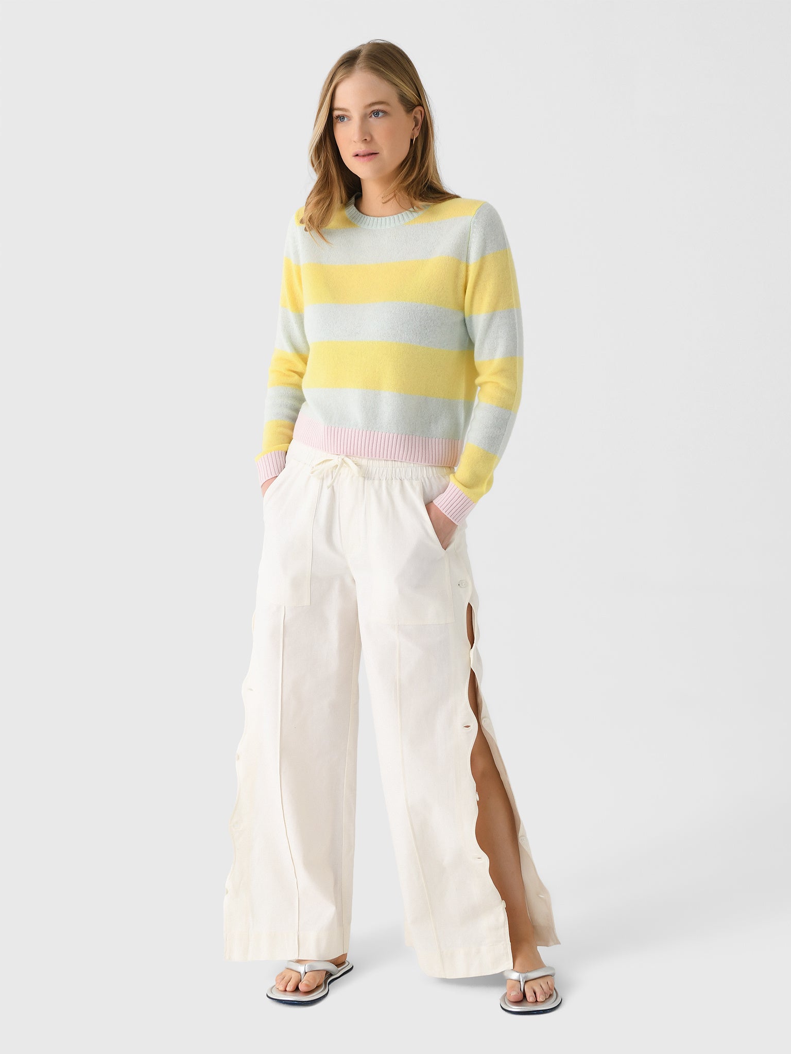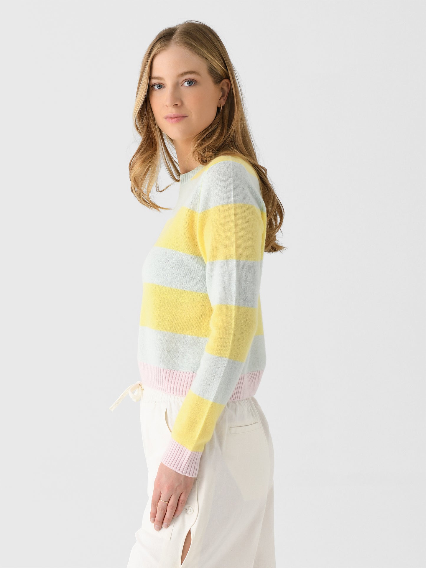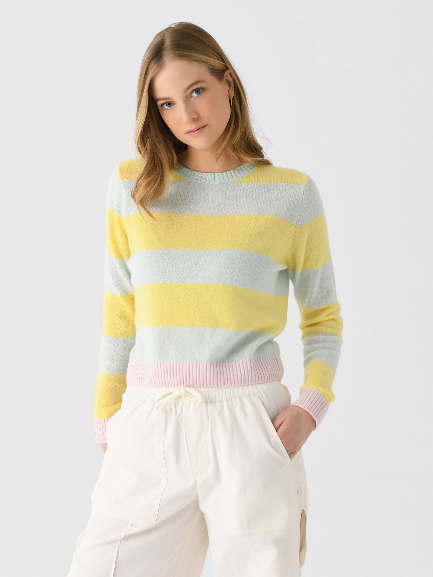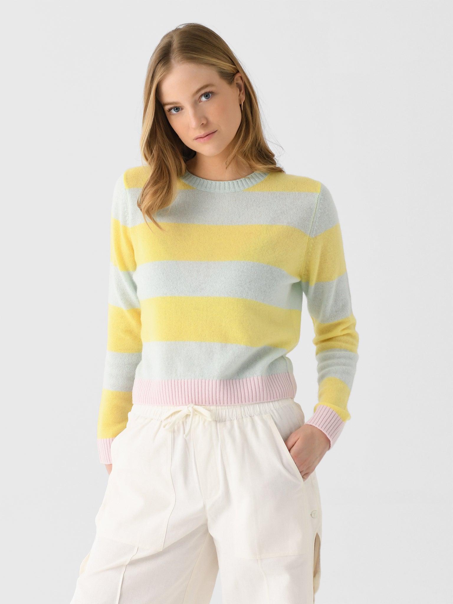 A lightweight knit cashmere sweater featuring a pretty pastel stripe design.