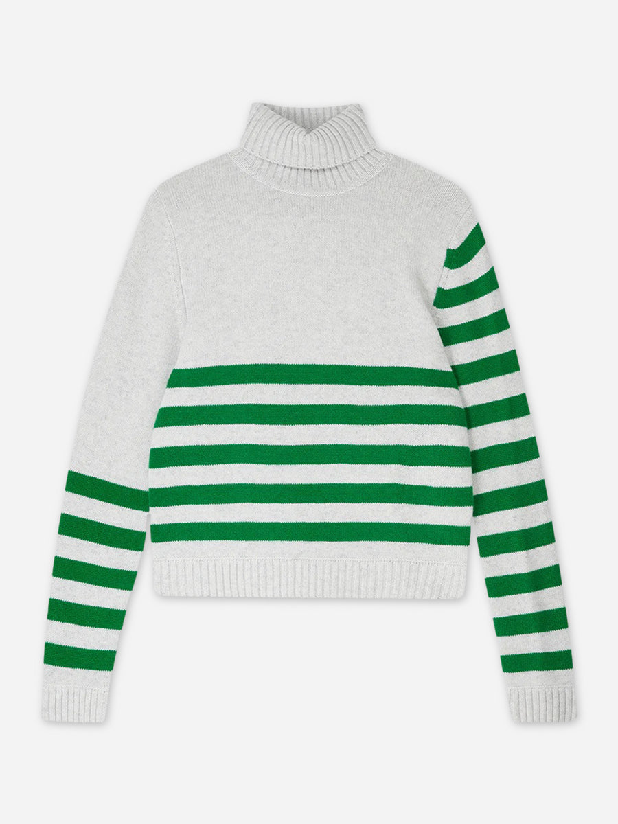 A soft wool cashmere turtleneck sweater with a unique inverted stripe pattern.