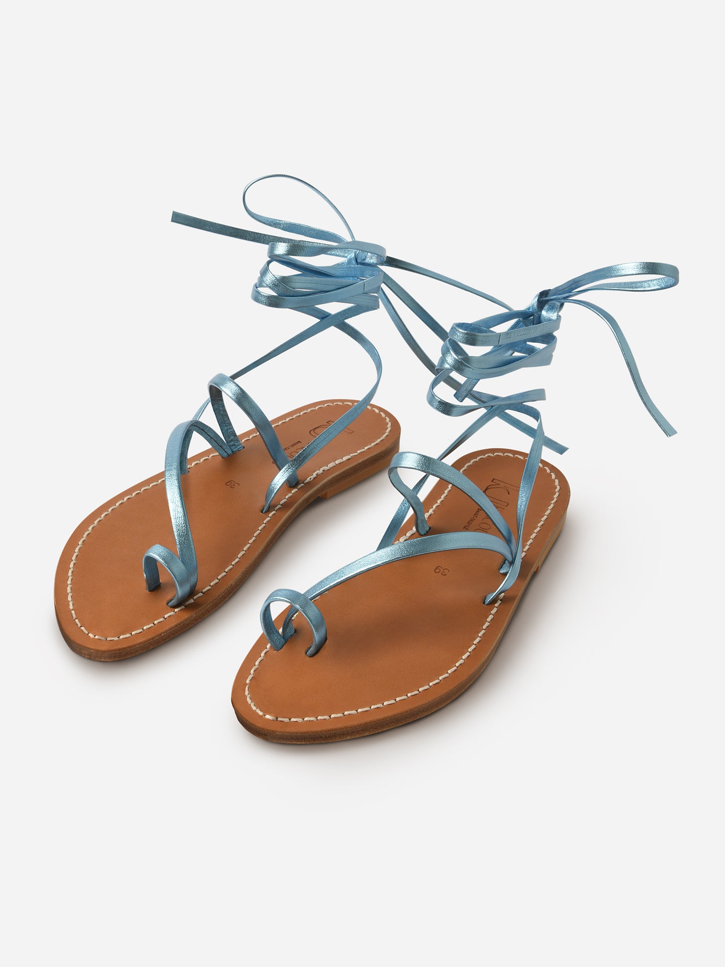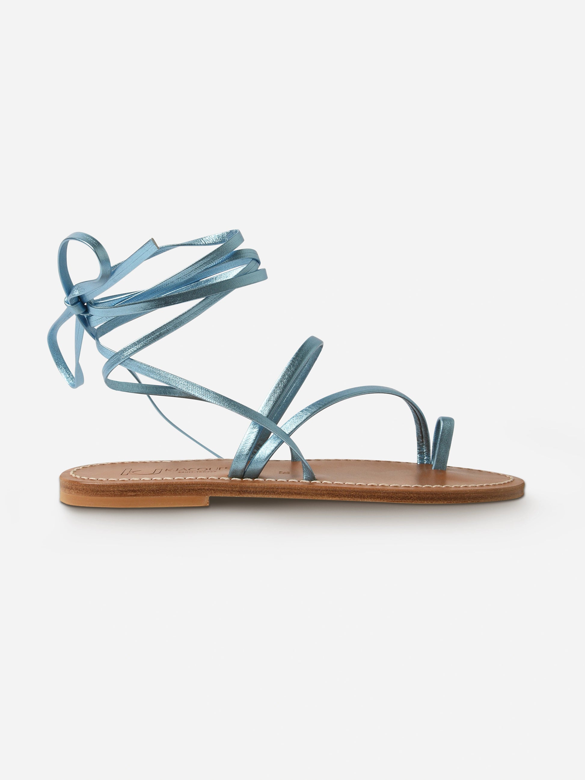 A slim, flat sandal with a strappy upper made from beautiful blue metallic leather.
