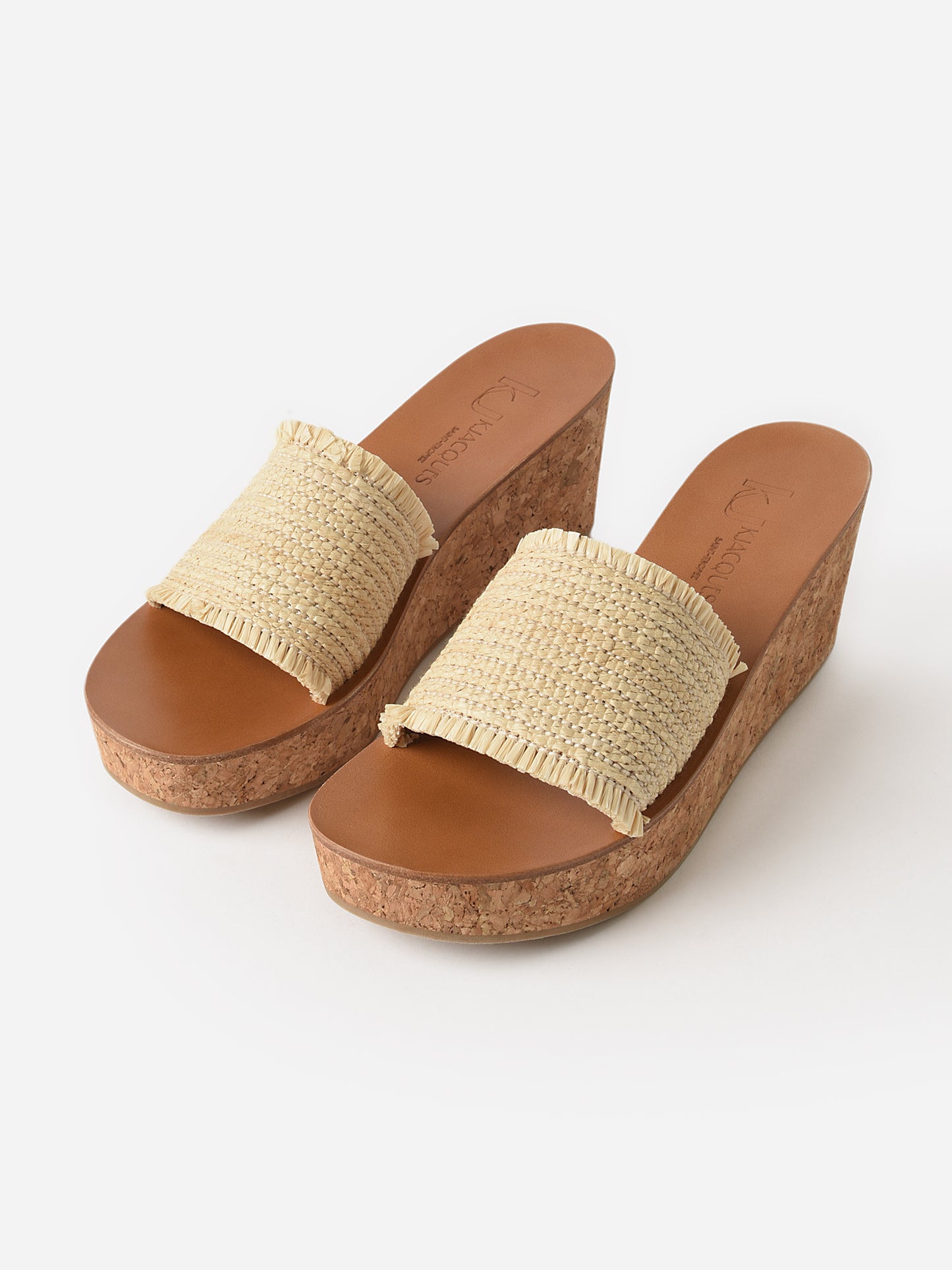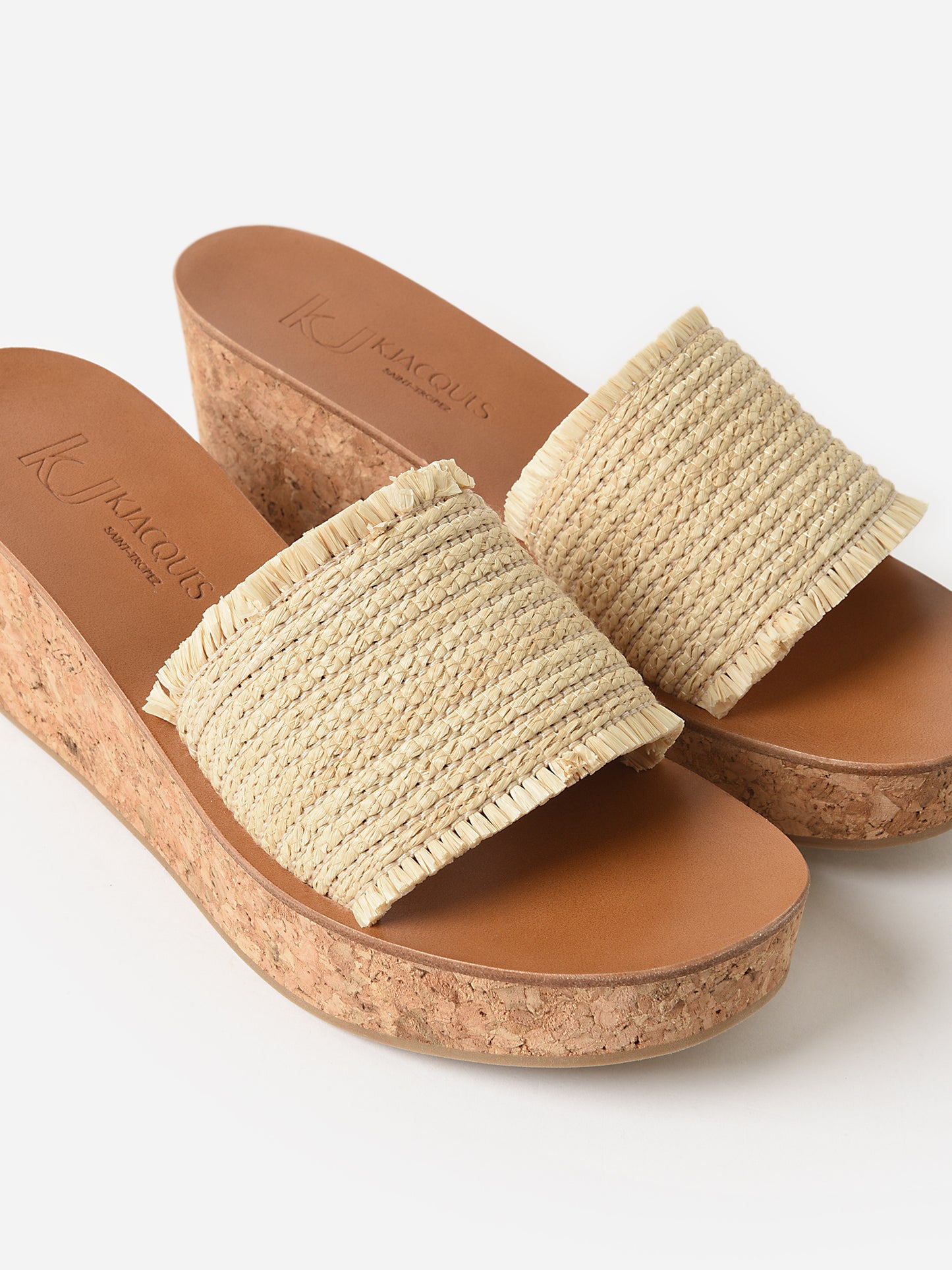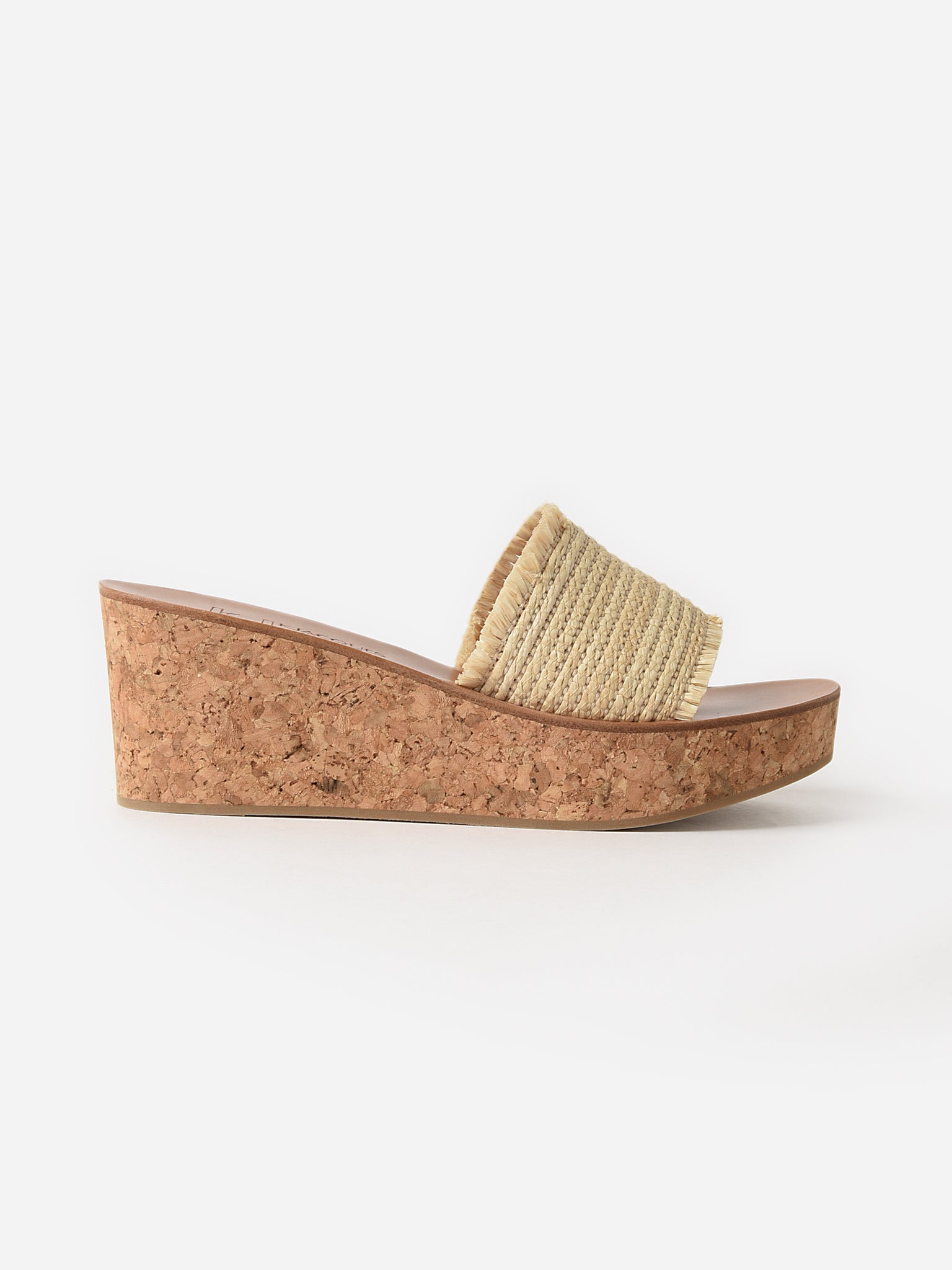 A stylish cork wedge with a leather lining and synthetic raffia woven strap.