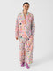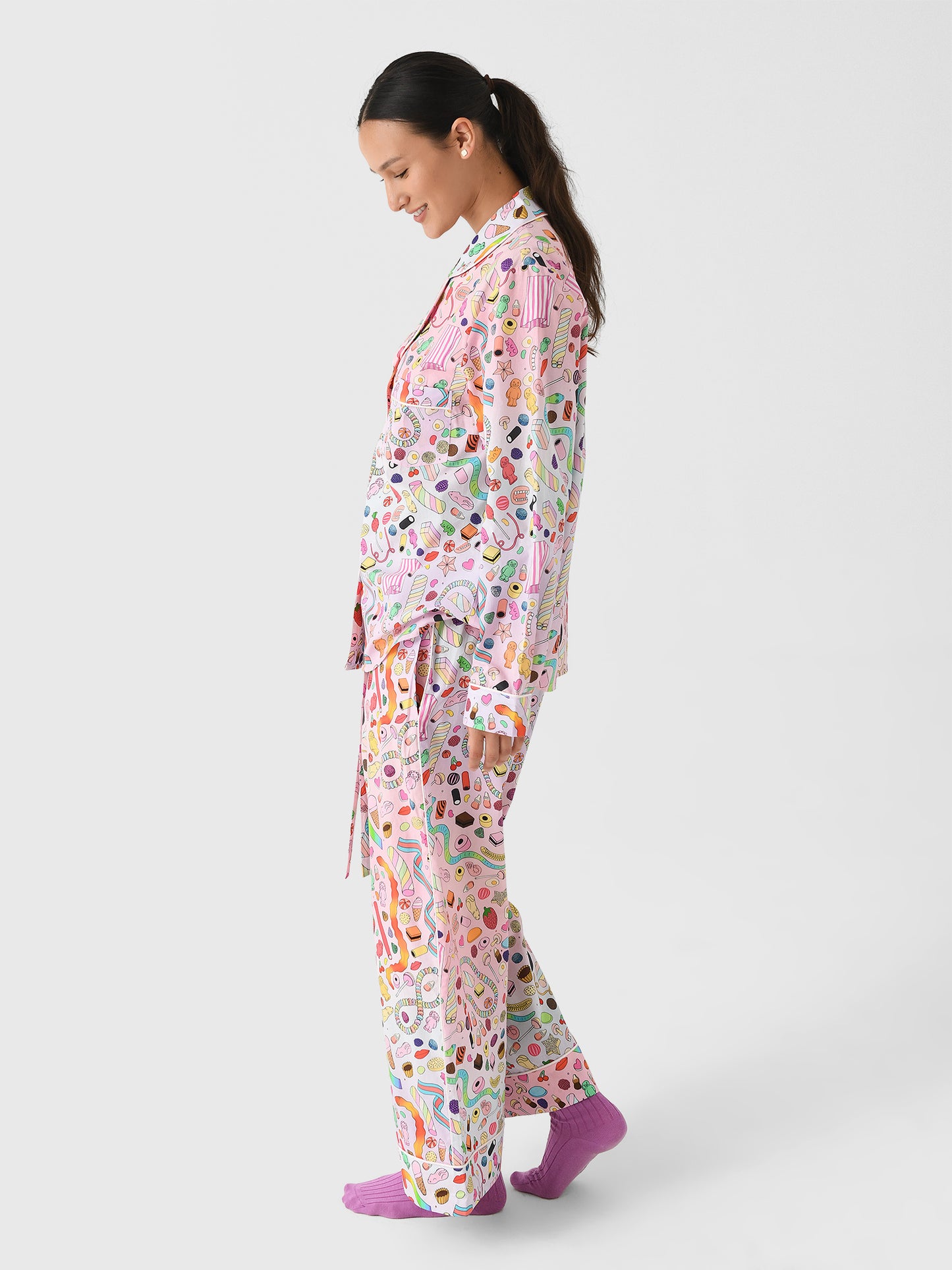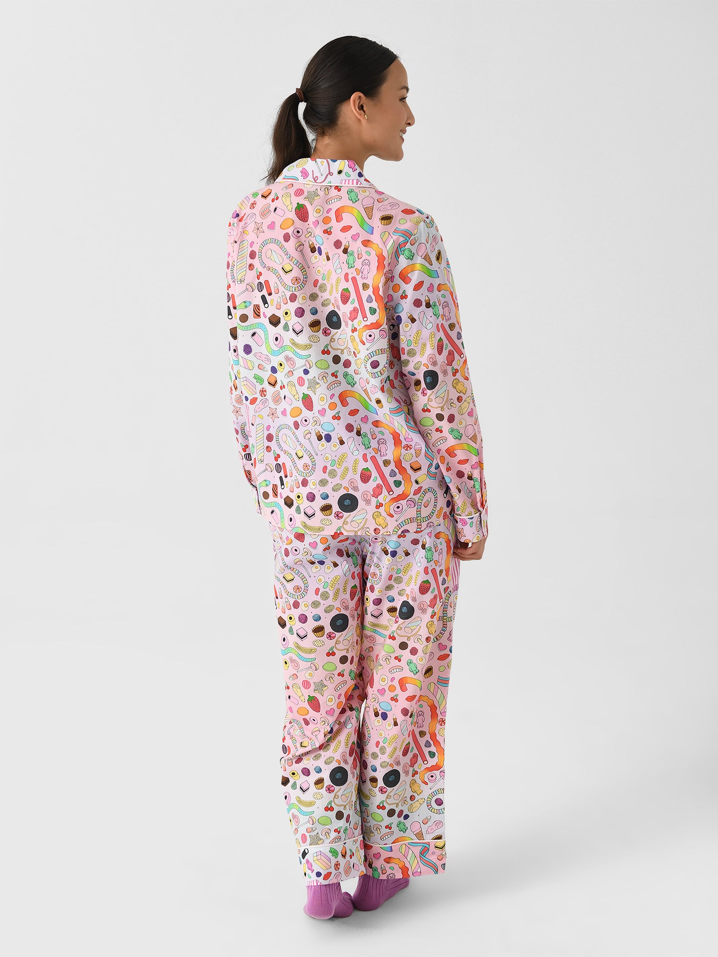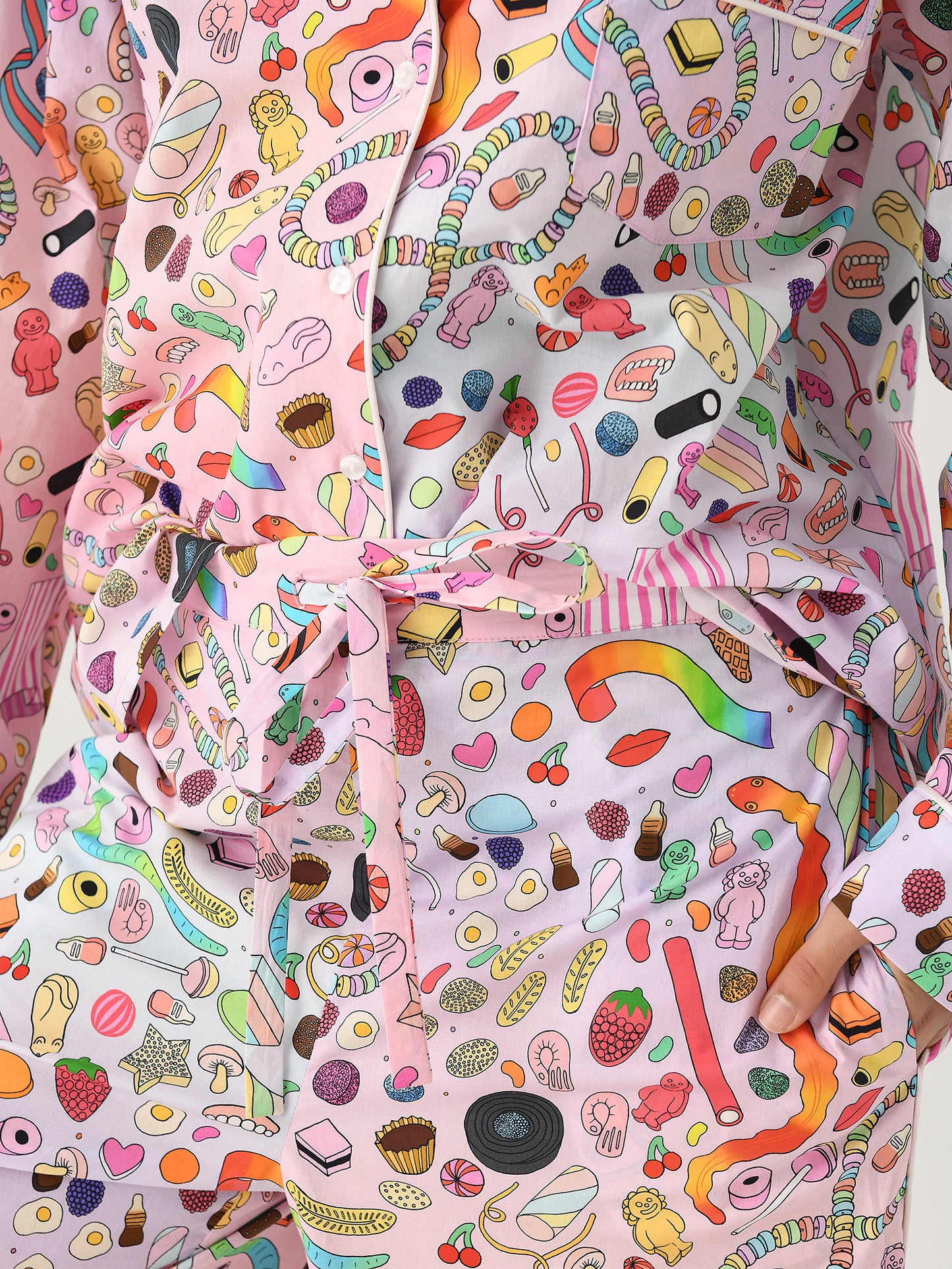 A vibrant pajama set made from certified organic cotton featuring a nostalgic sweet treats-inspired print.