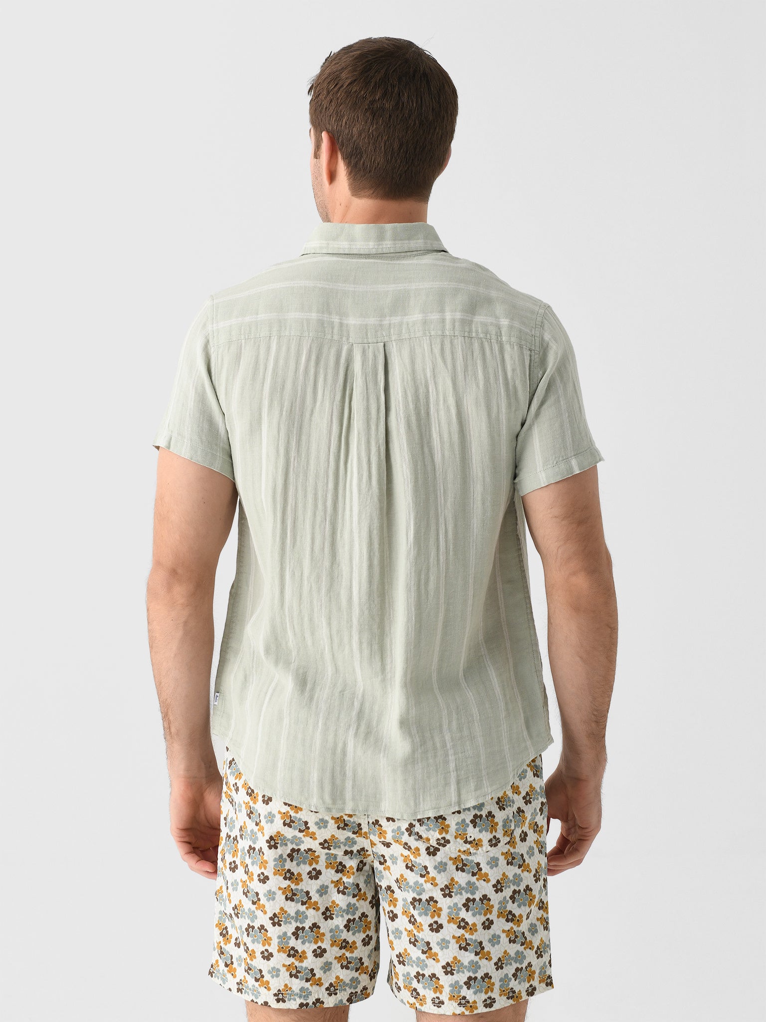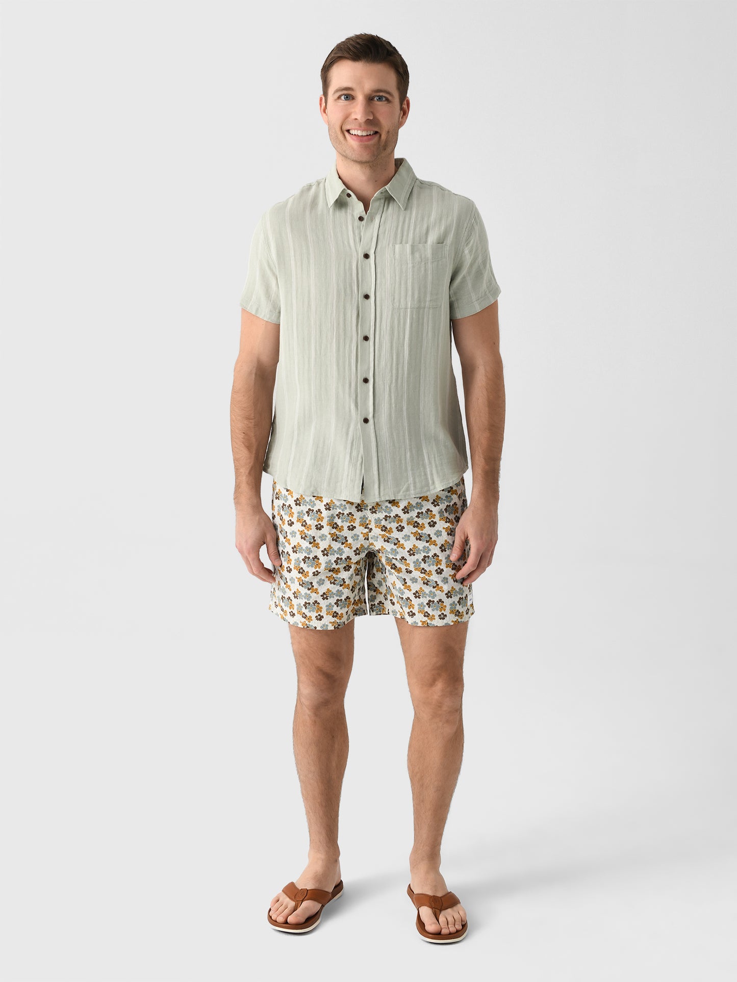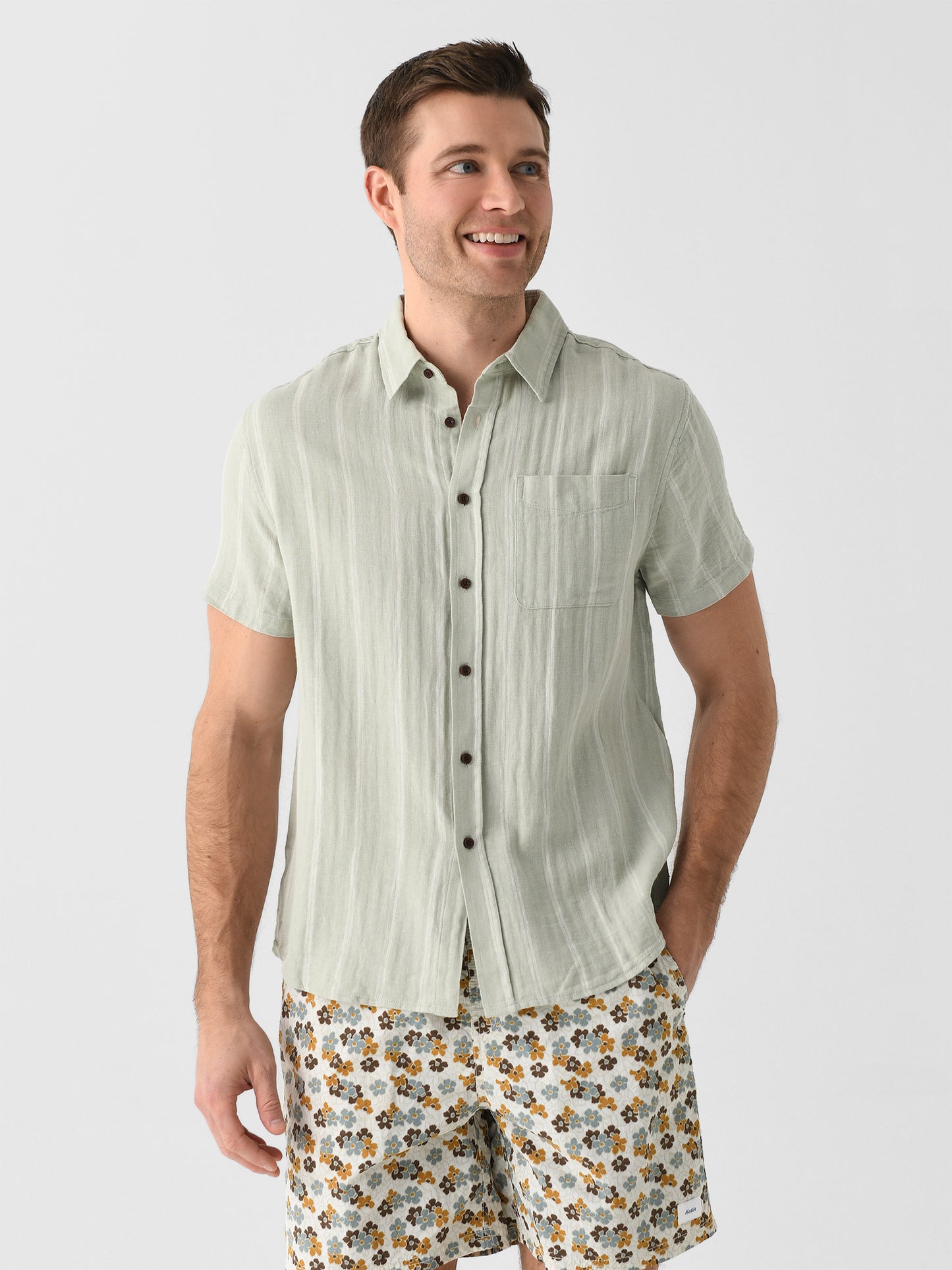 The best-selling Alan Shirt is made from a soft, breathable cotton linen herringbone blend. Its comfortable yet polished look and airy design make it perfect for warm weather.