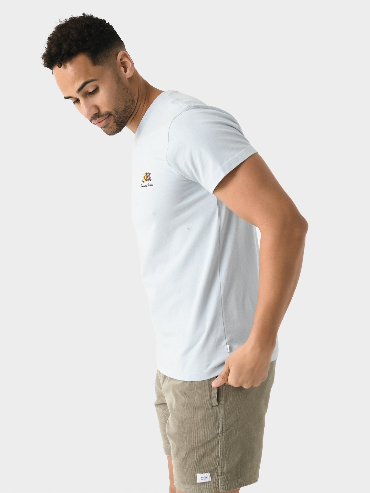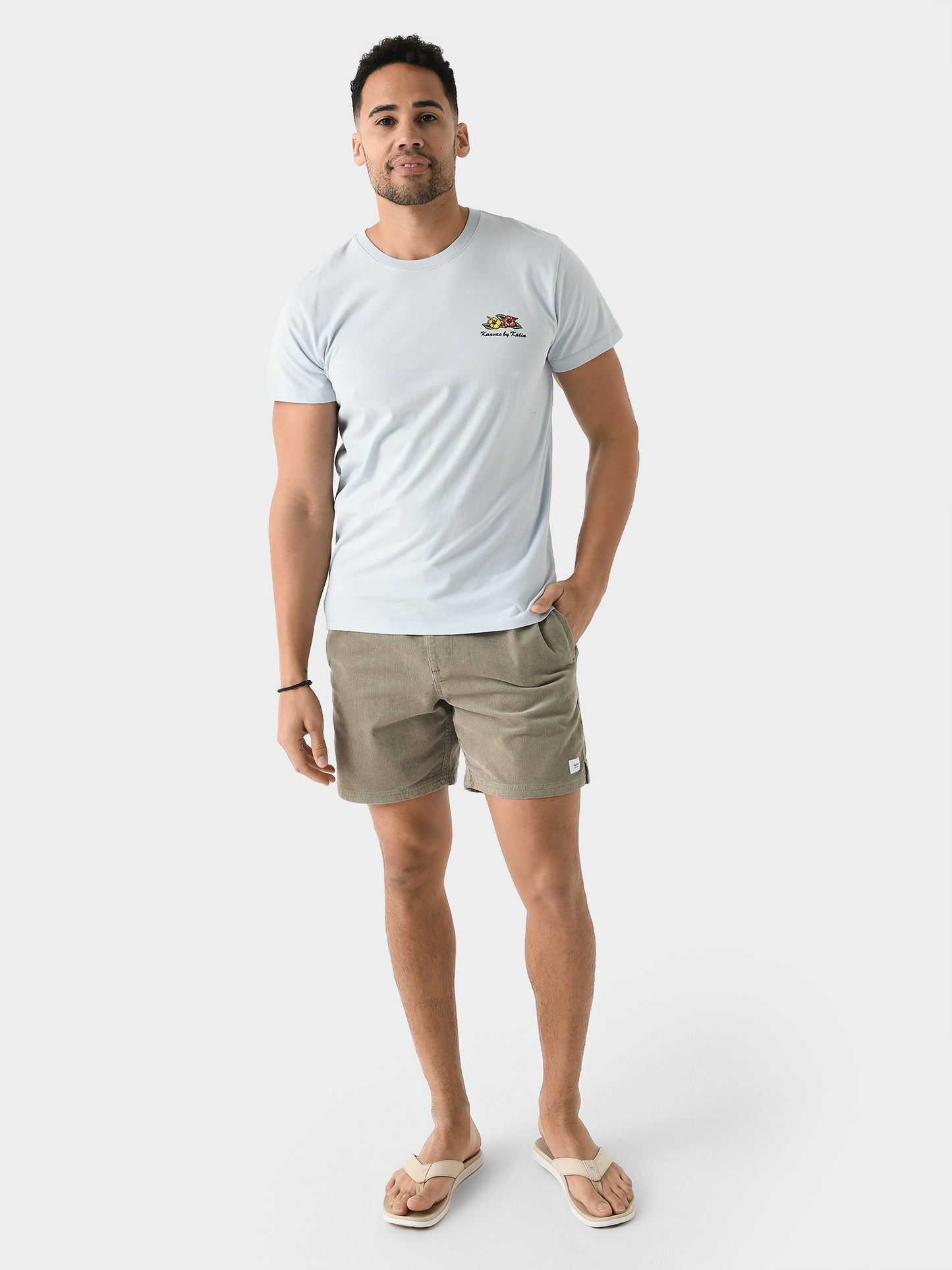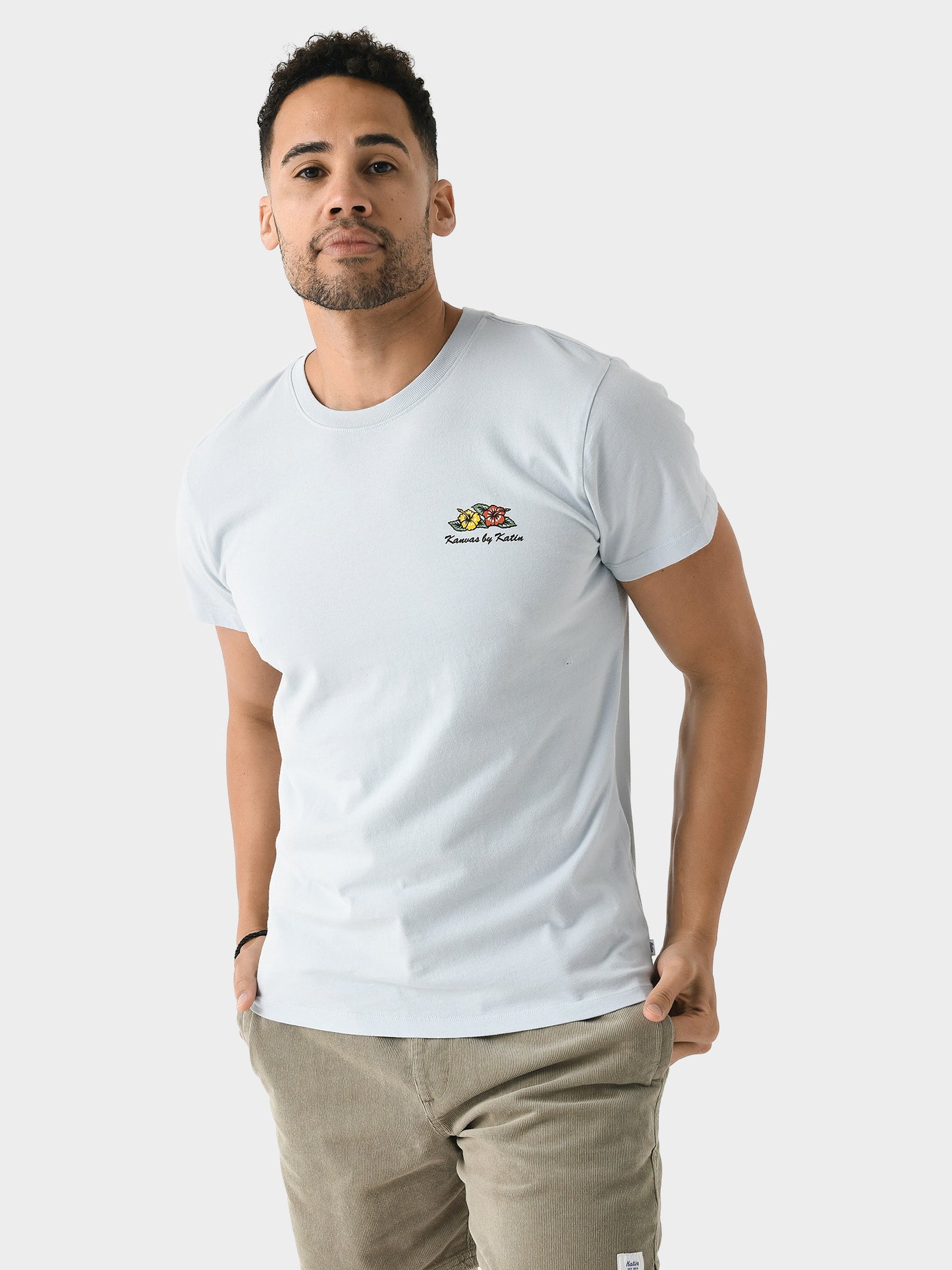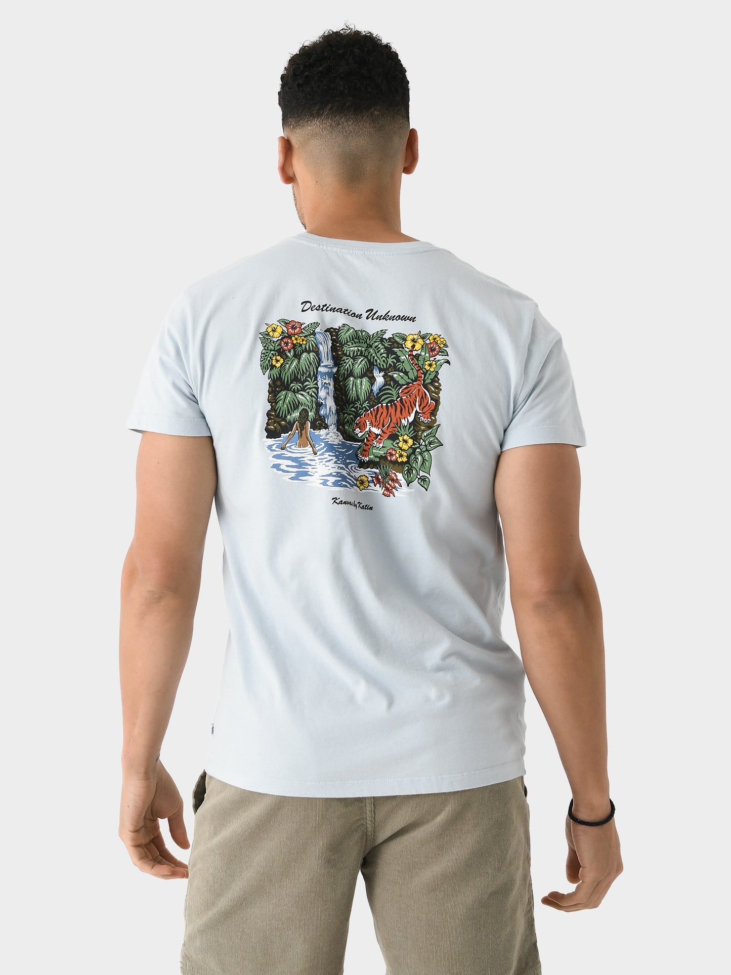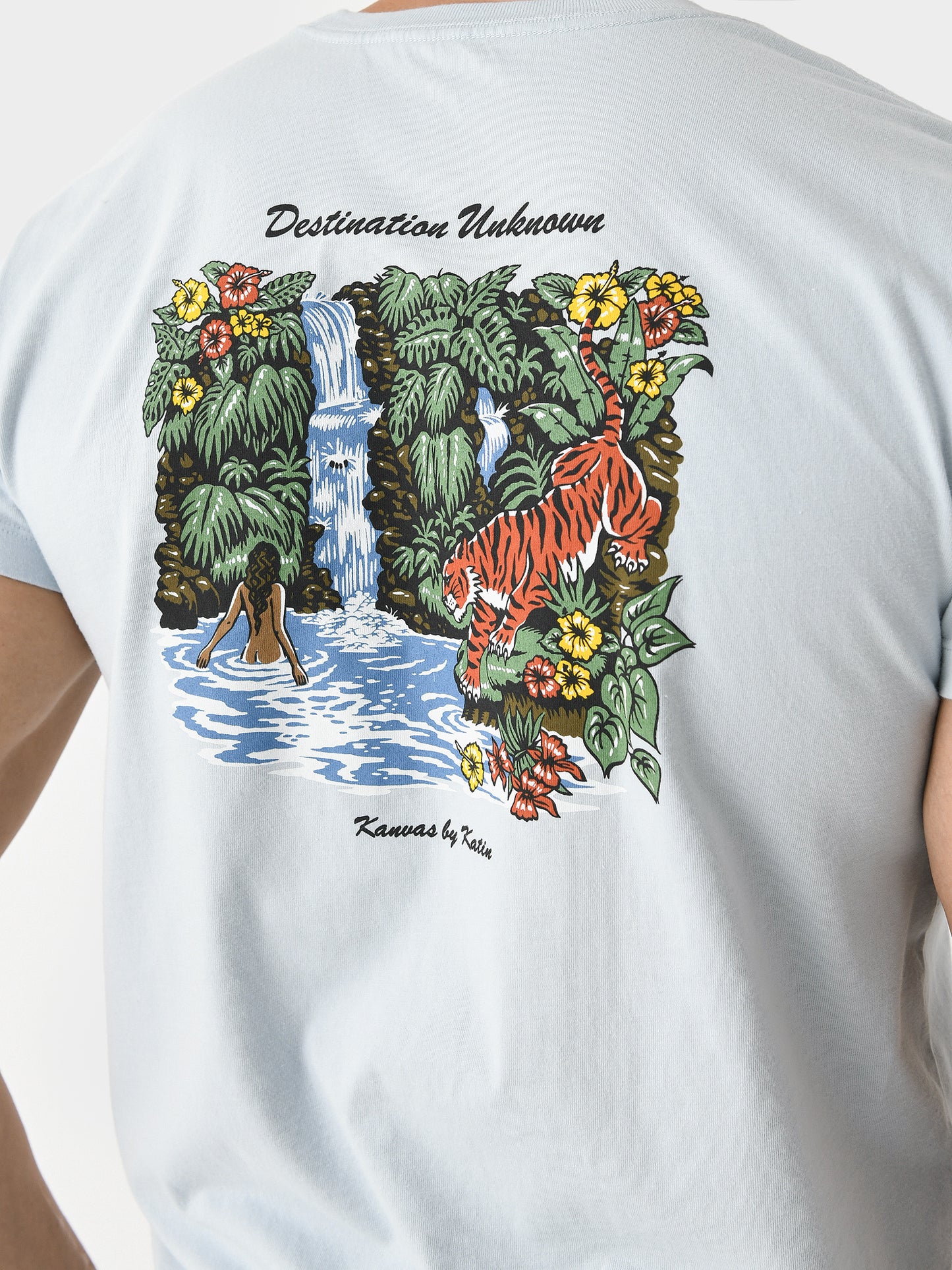 A custom-dyed organic cotton tee featuring a unique tropical jungle graphic.