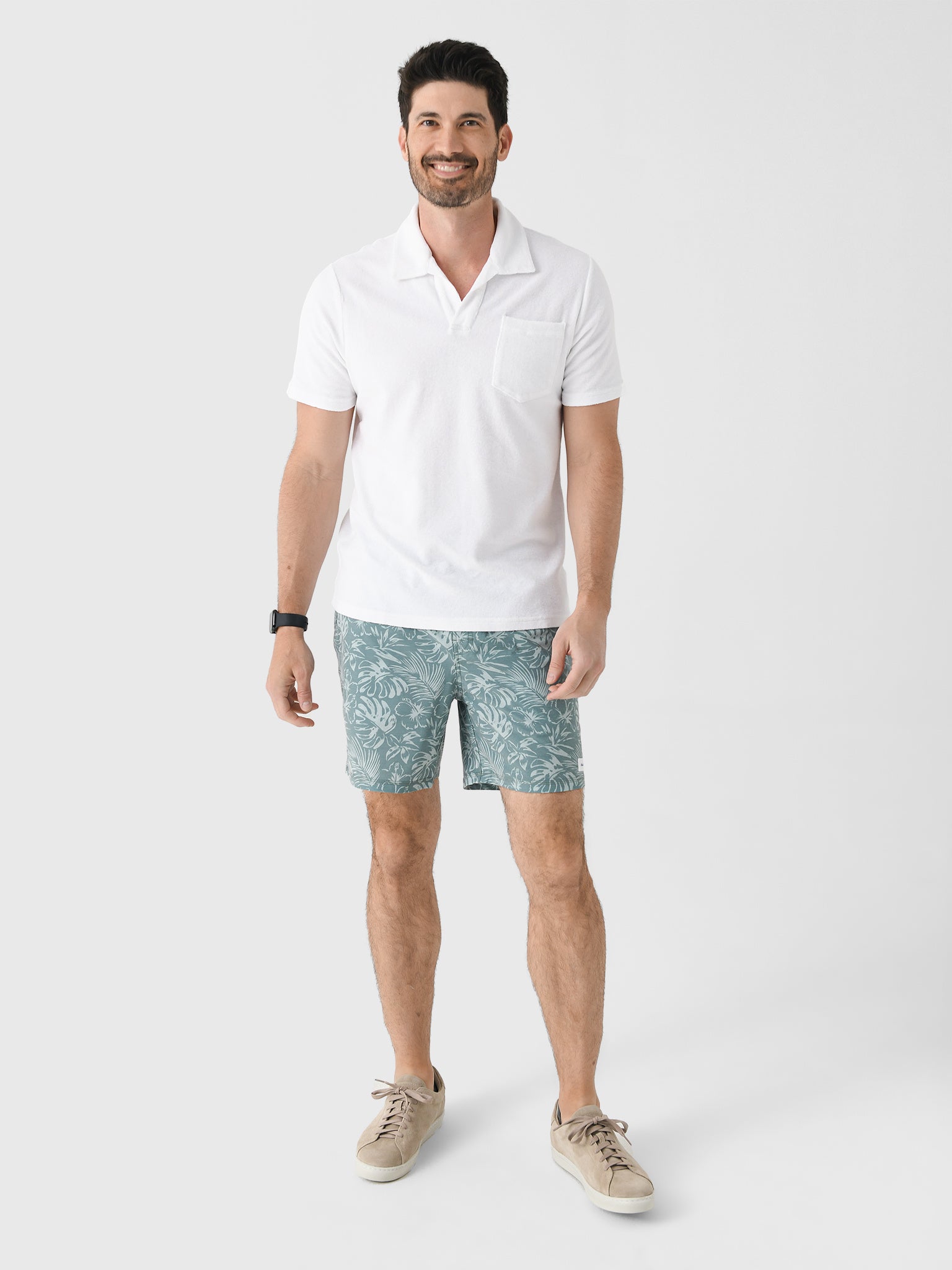 Made from a sustainable fabric blend, this swim trunk is stylish and boasts a unique floral pattern inspired by the islands.