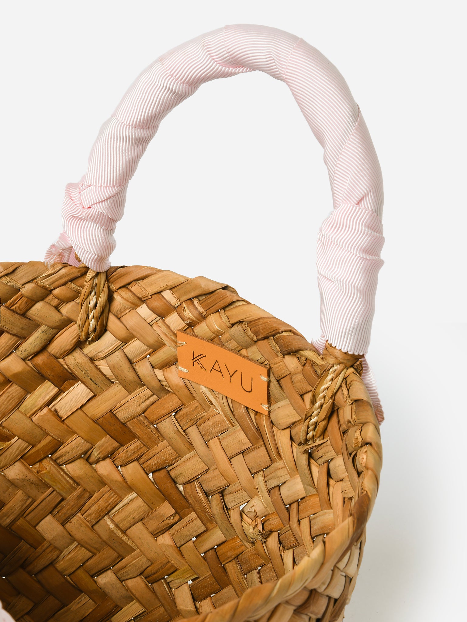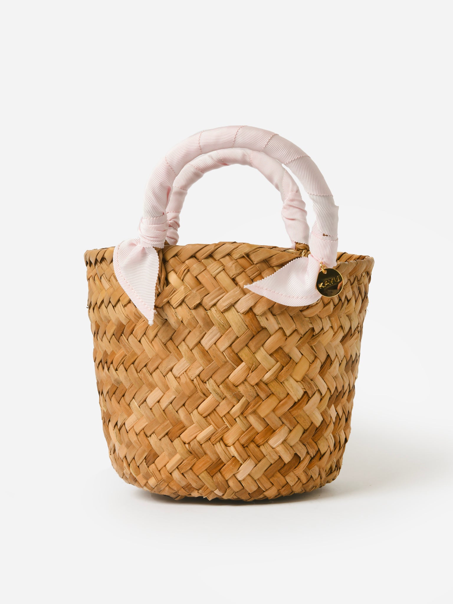 Woven straw mini tote bag with grosgrain ribbon handles.