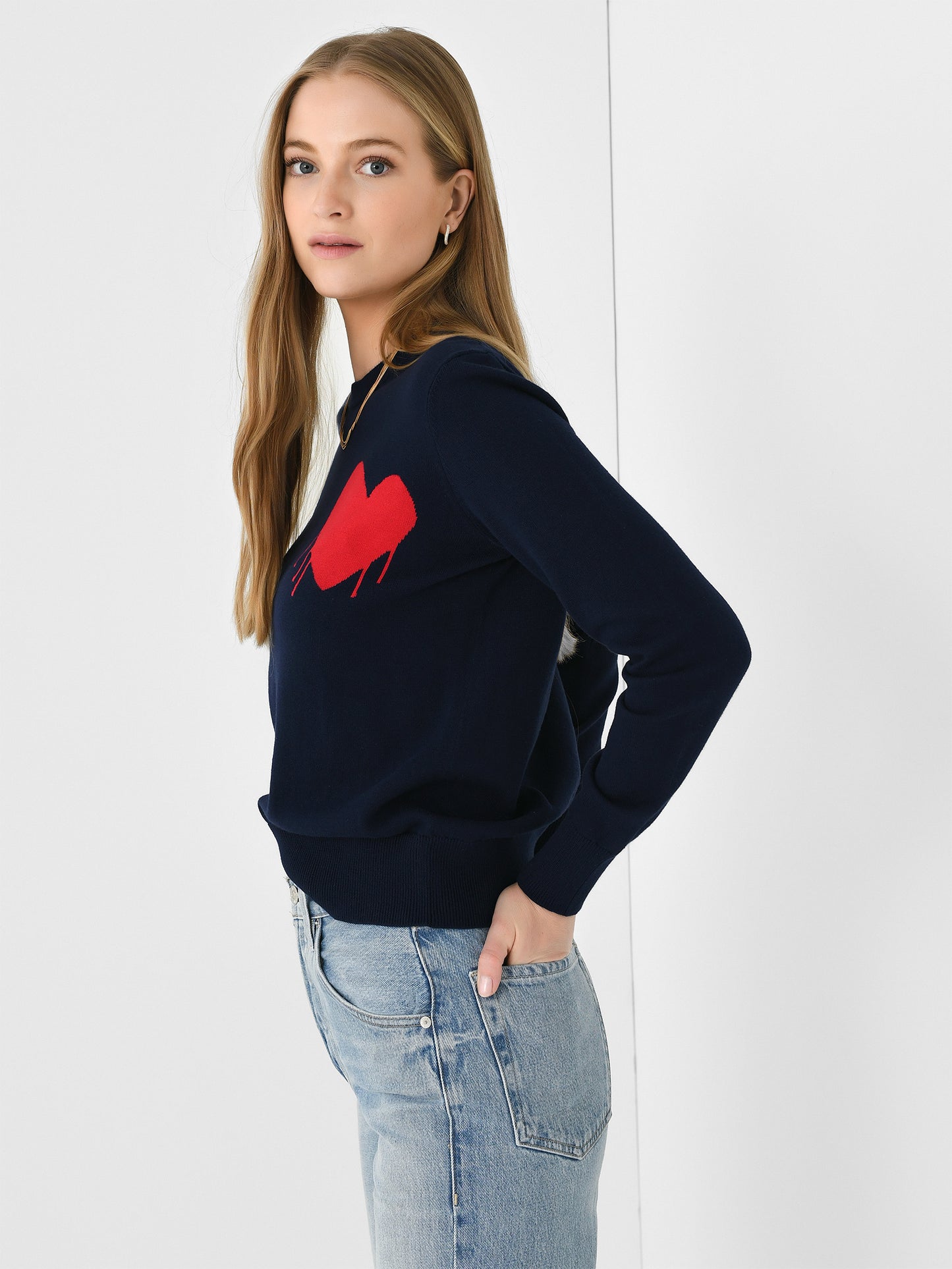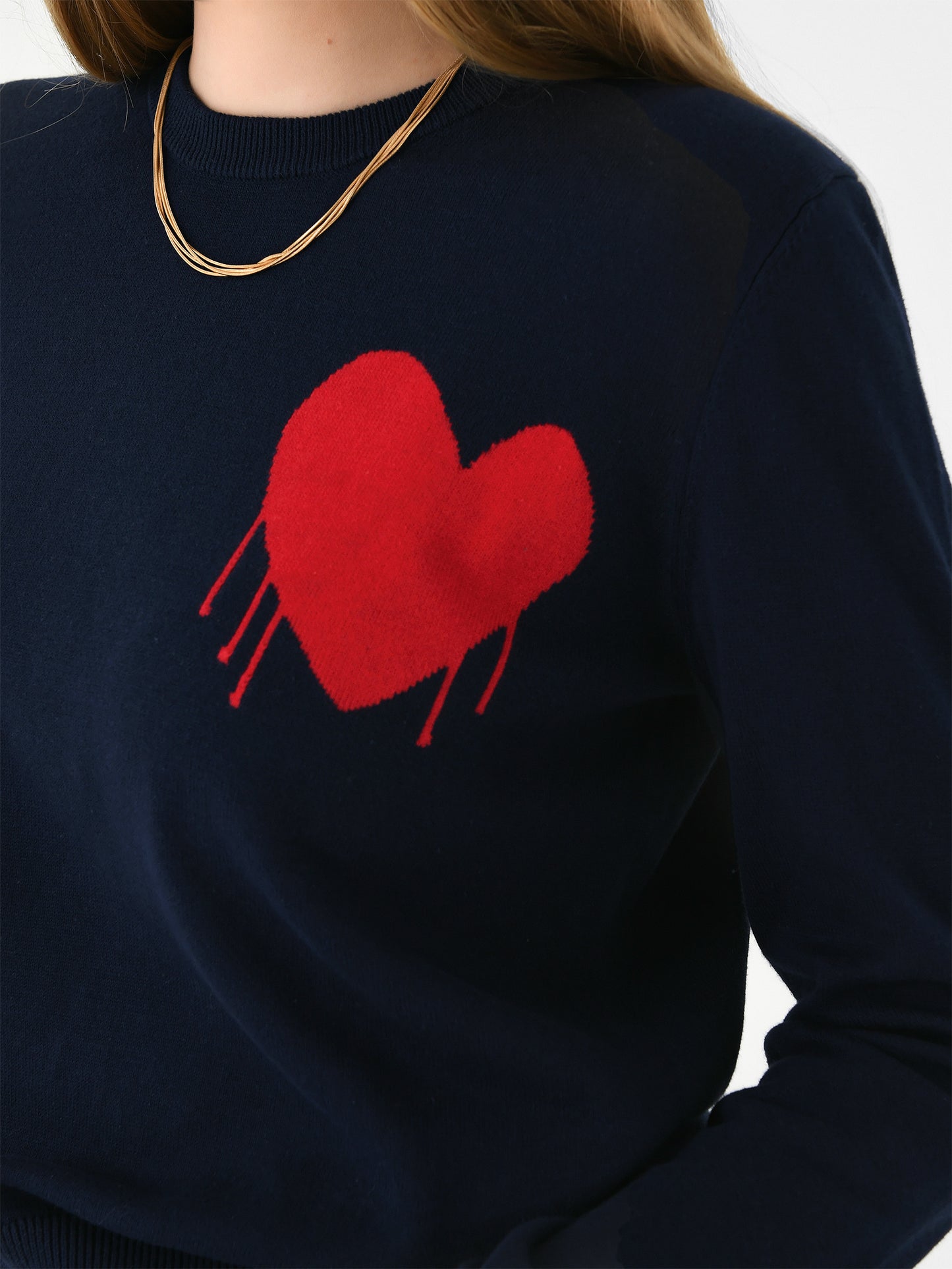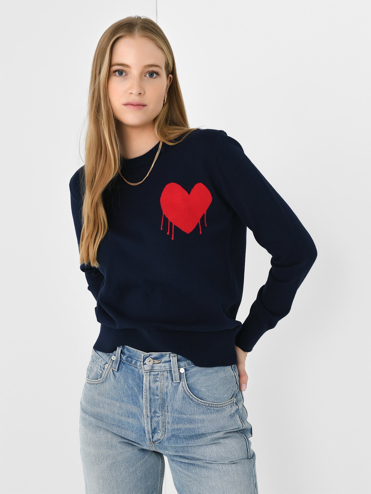 A soft cotton knit sweater featuring a contrast intarsia drippy heart graphic.