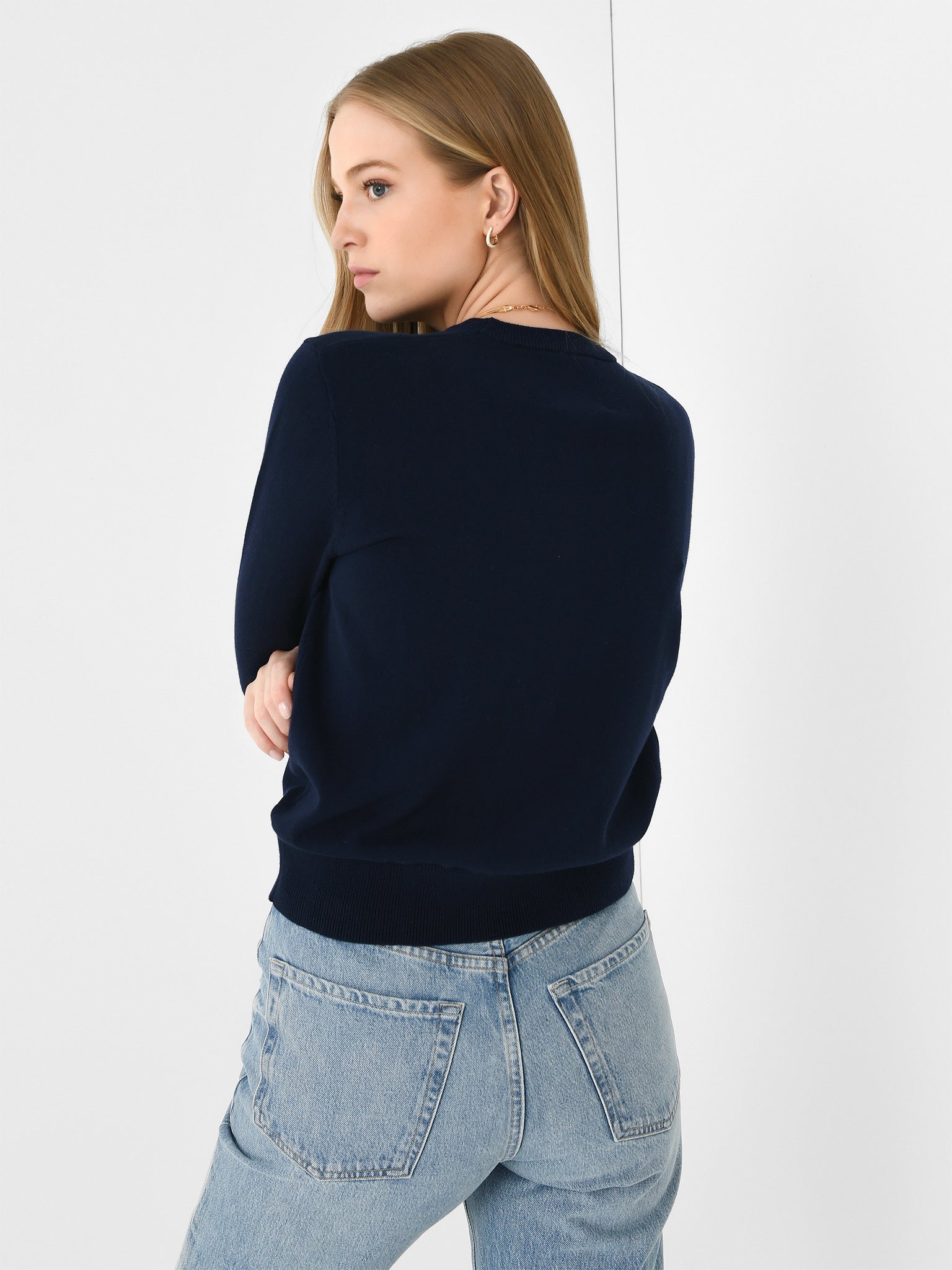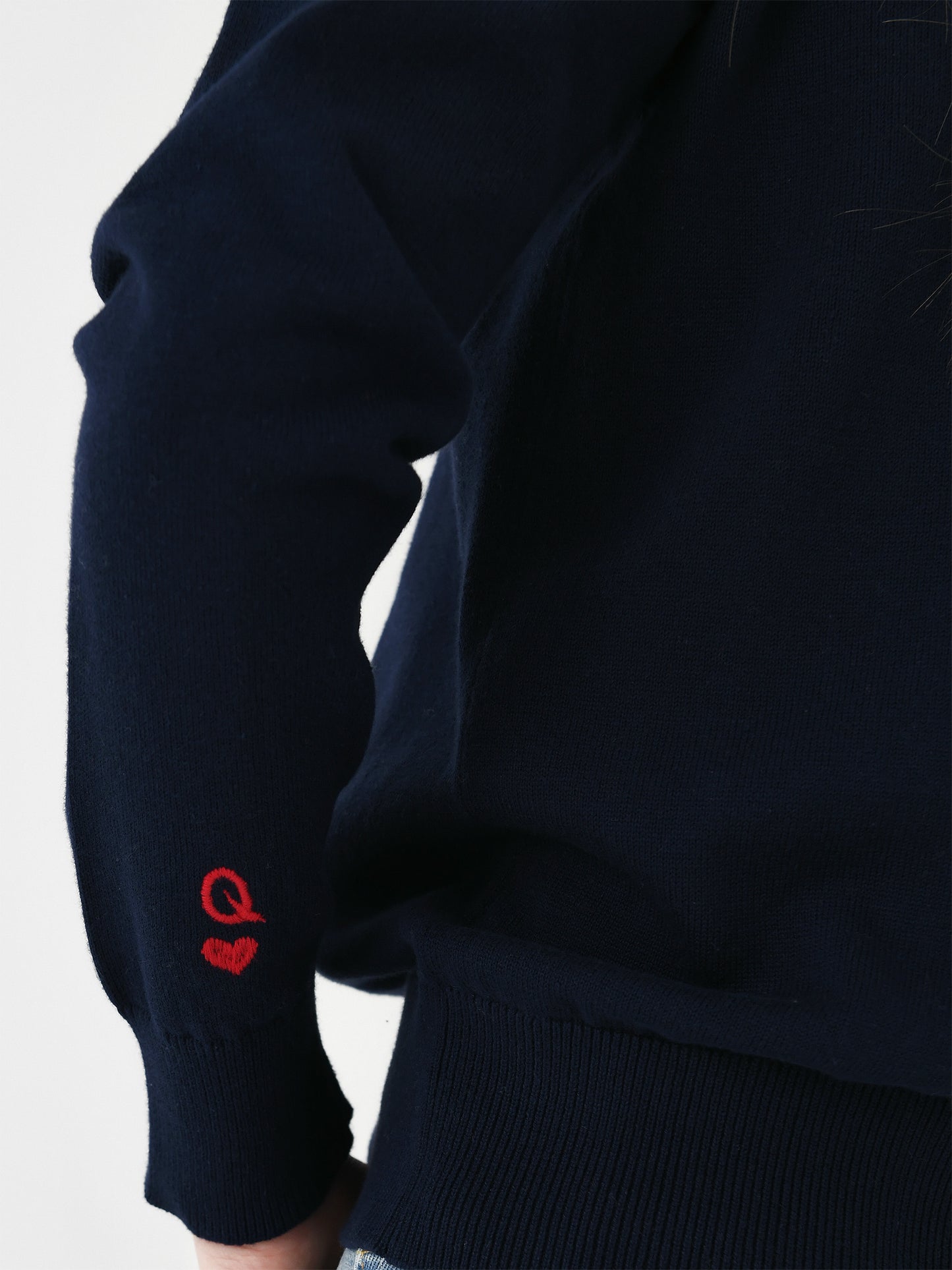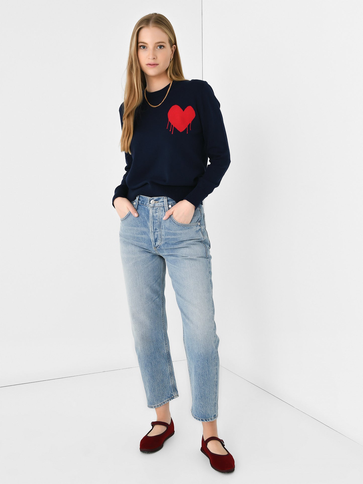 A soft cotton knit sweater featuring a contrast intarsia drippy heart graphic.
