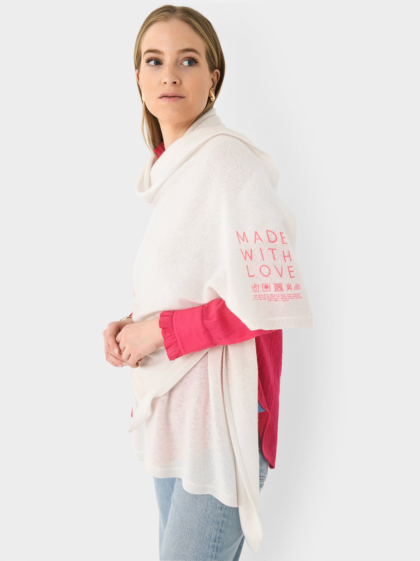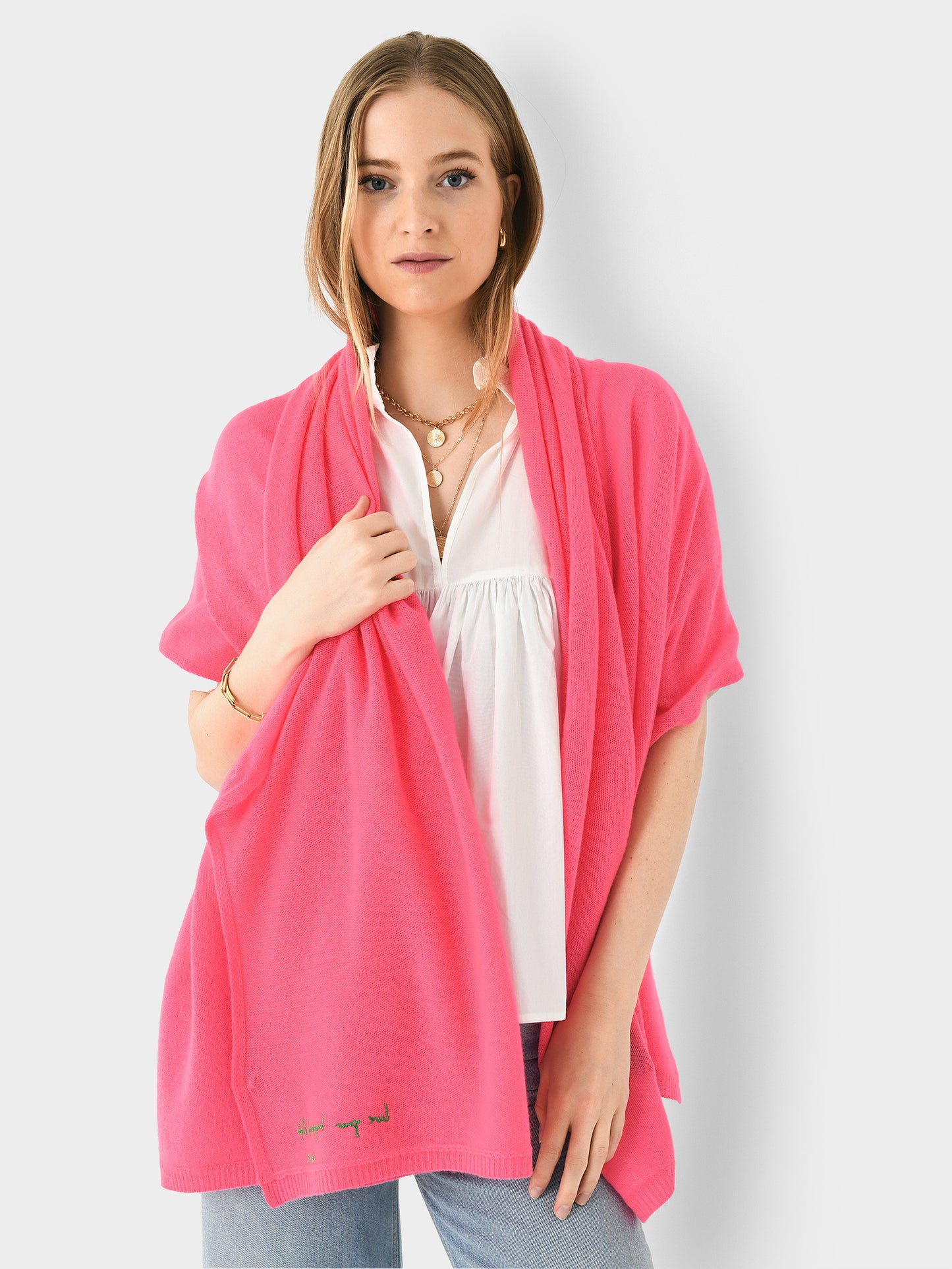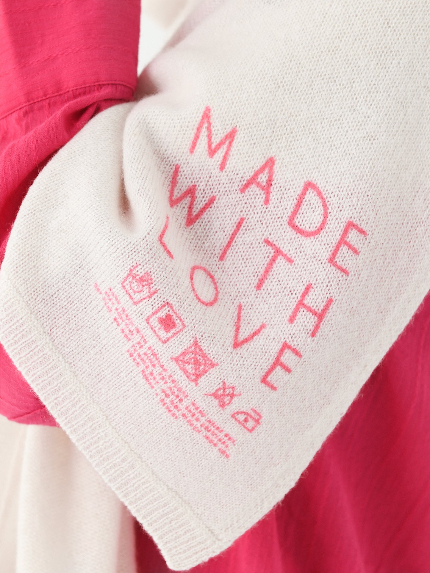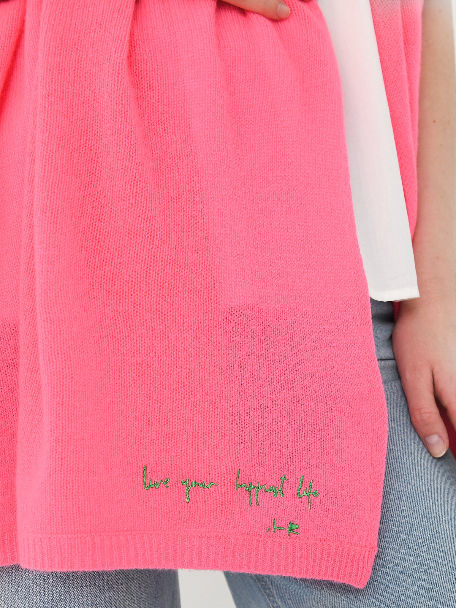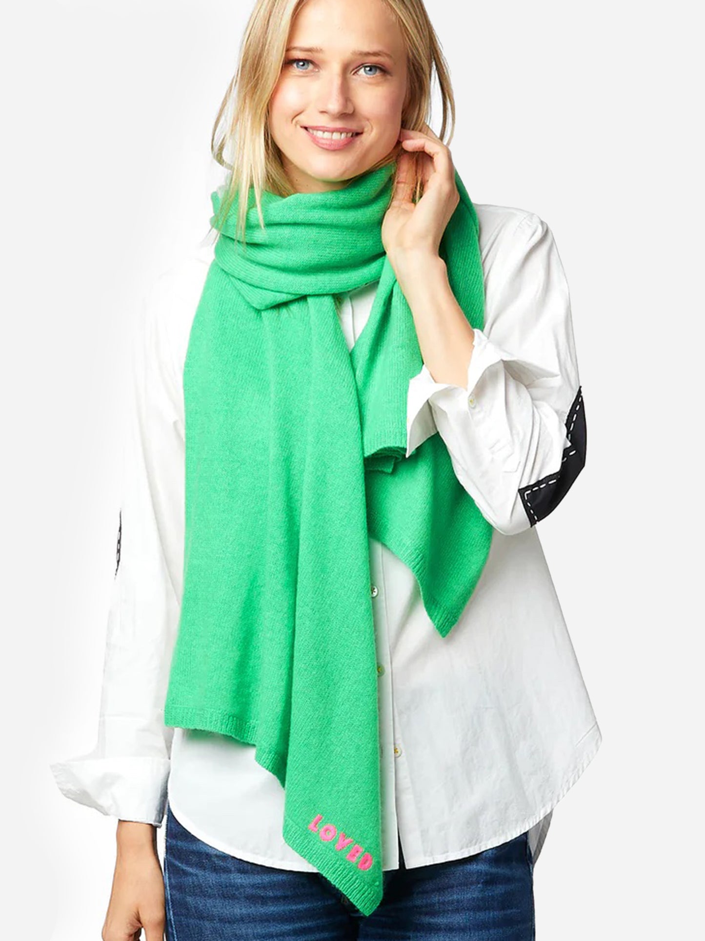 An ultra-soft scarf constructed from featherweight cashmere, each scarf features an embroidered or intarsia knit message.