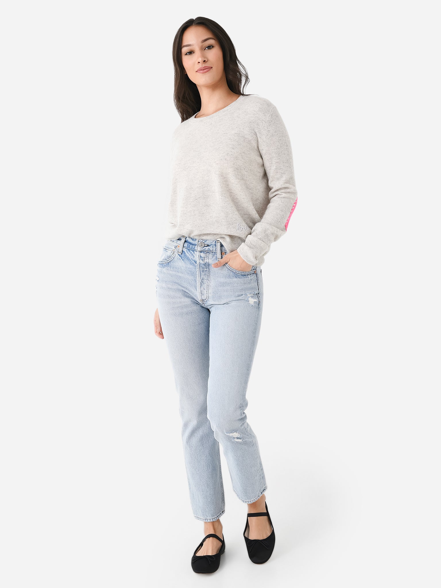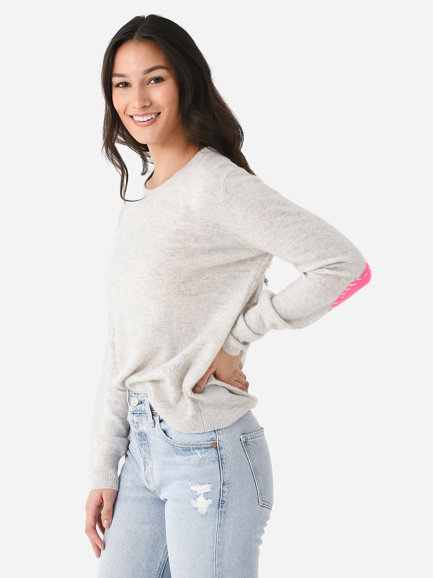 An ultra-soft lightweight cashmere sweater with contrast heart elbow patches.