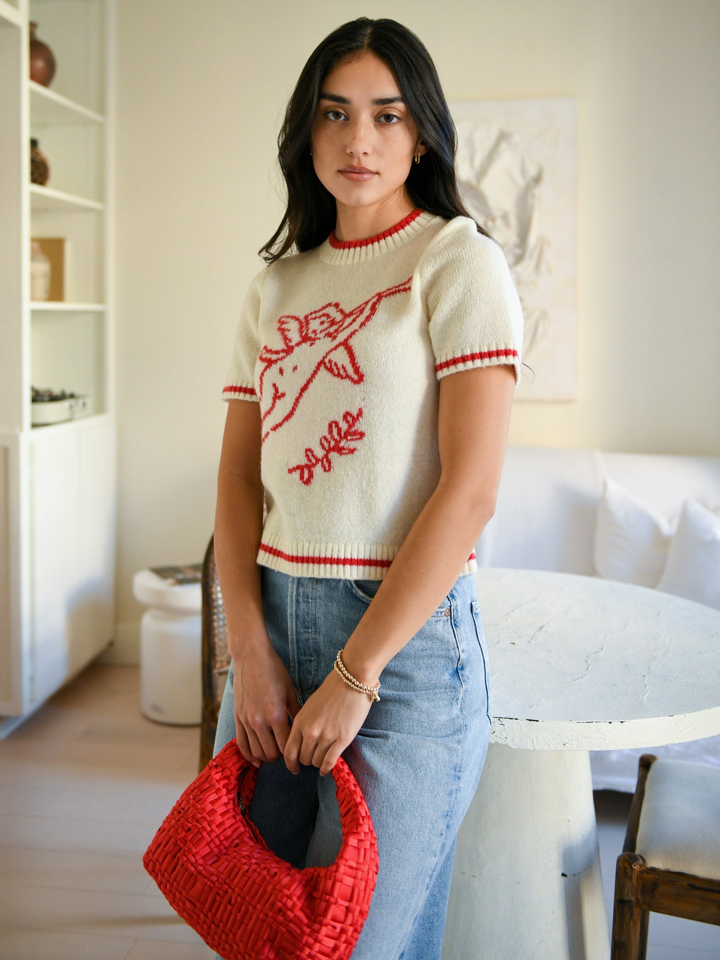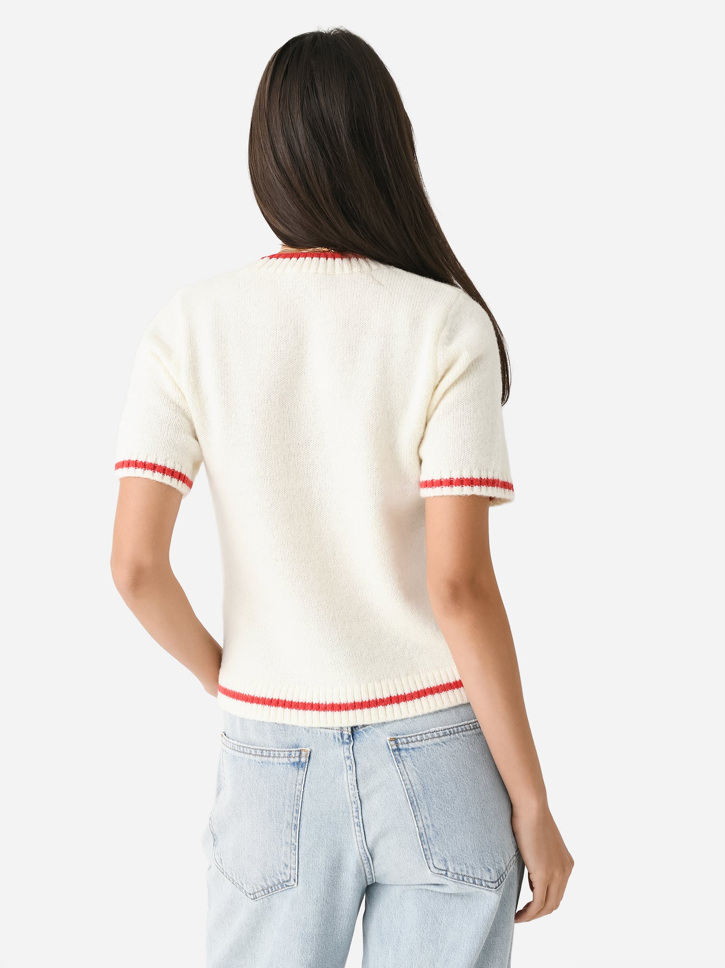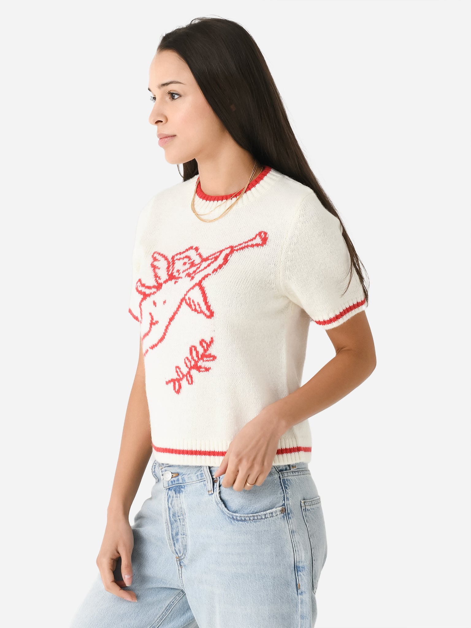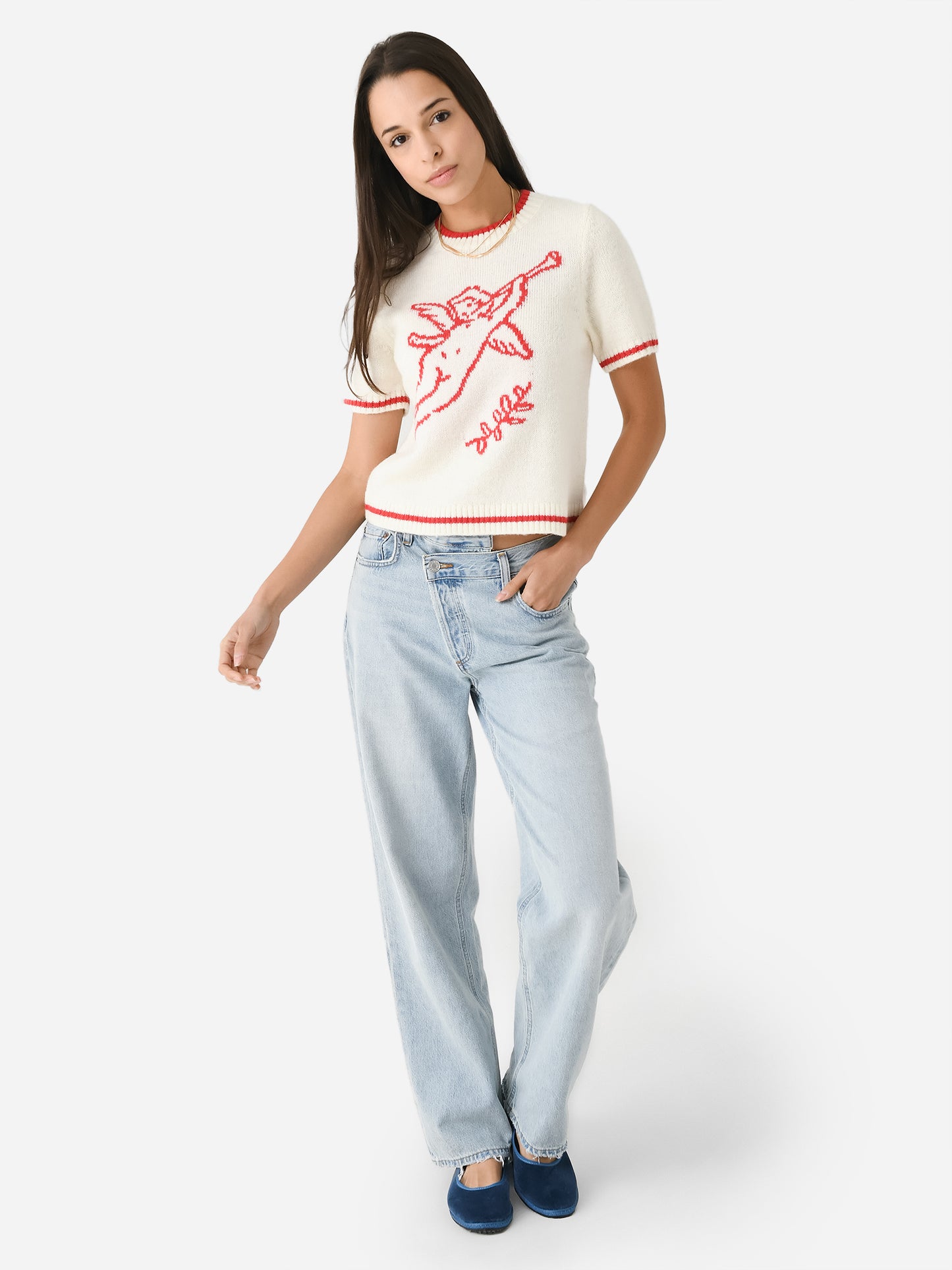 A short-sleeve knit sweater with contrast trims and a custom Cherub design.