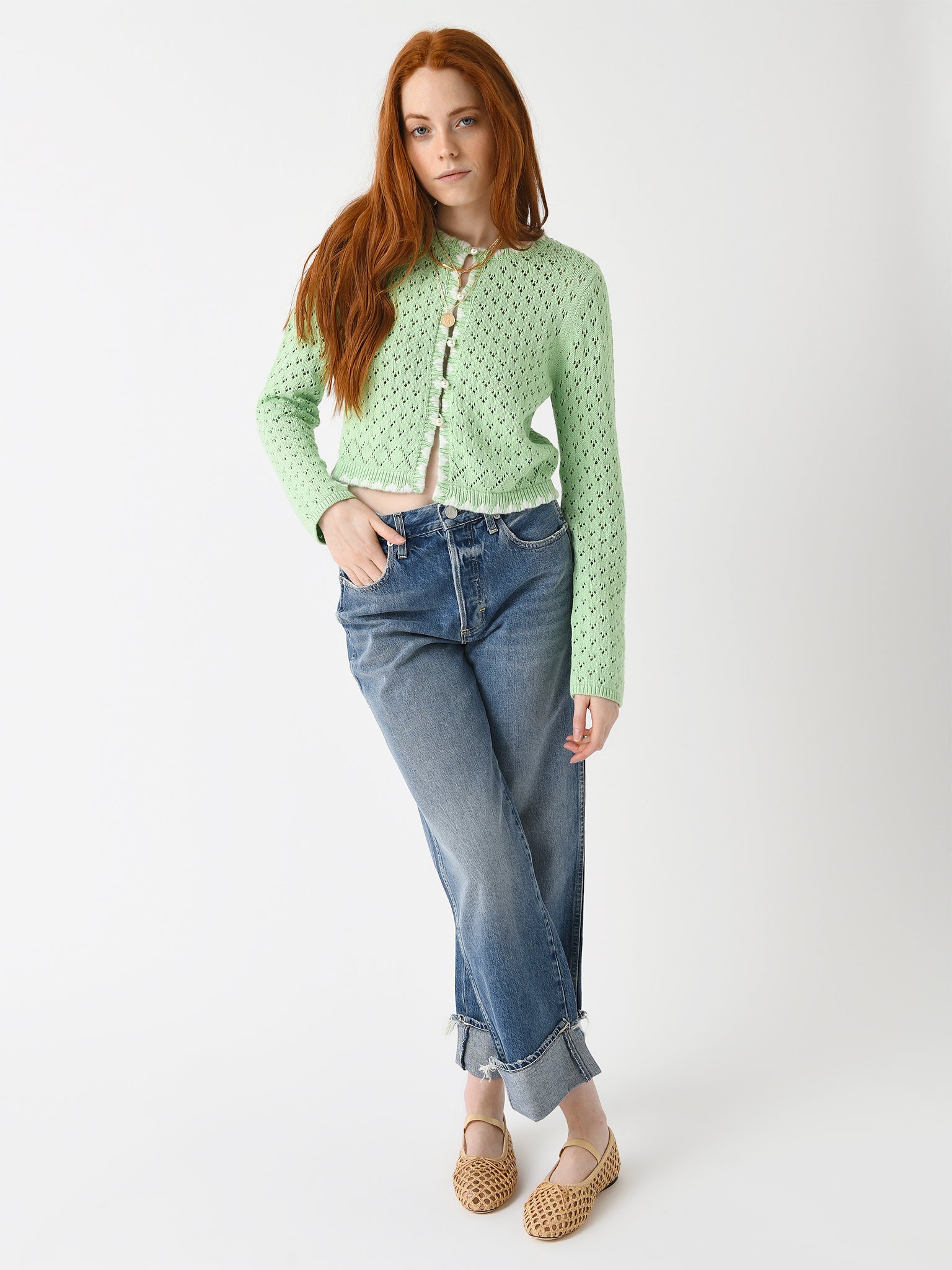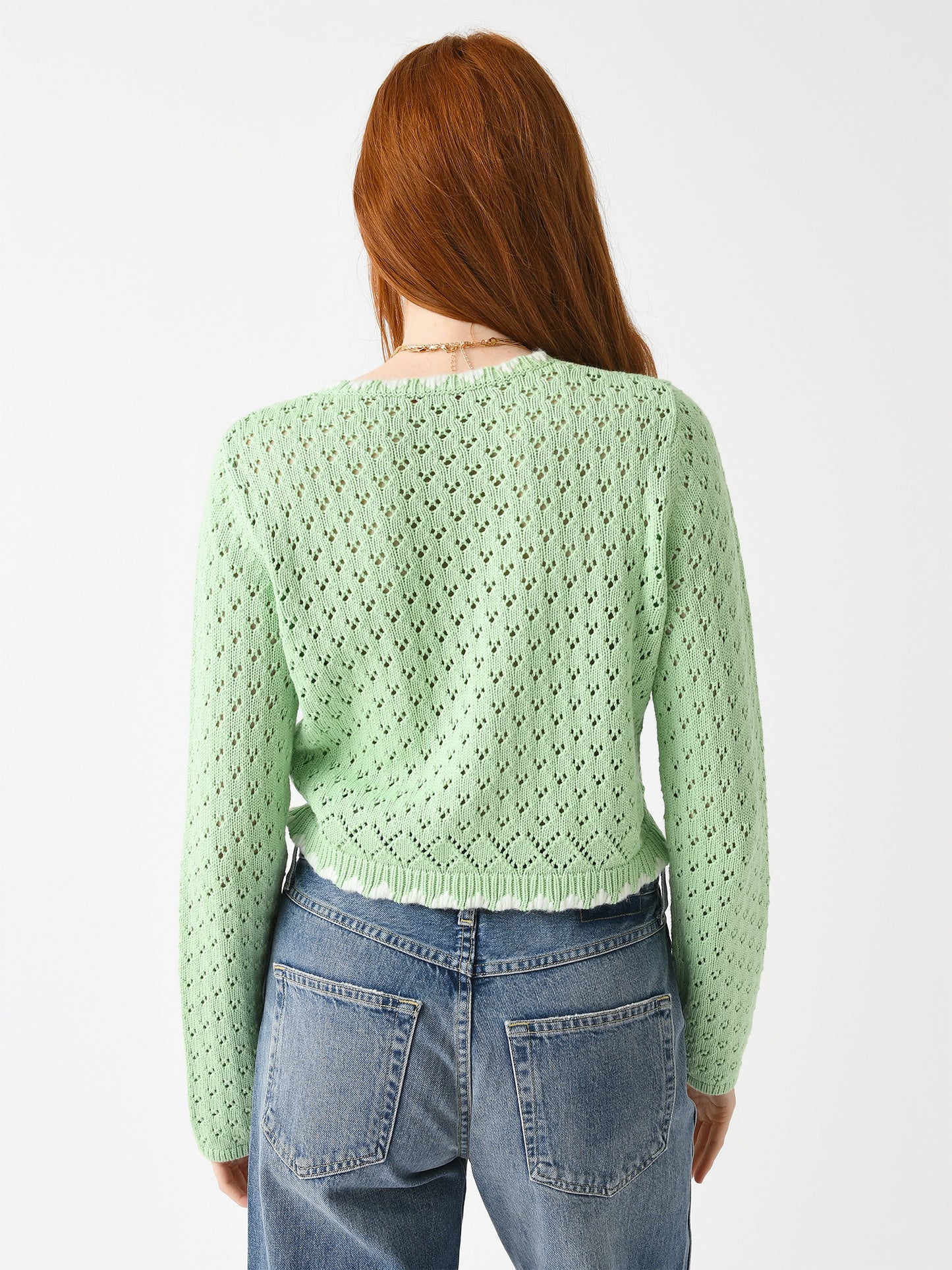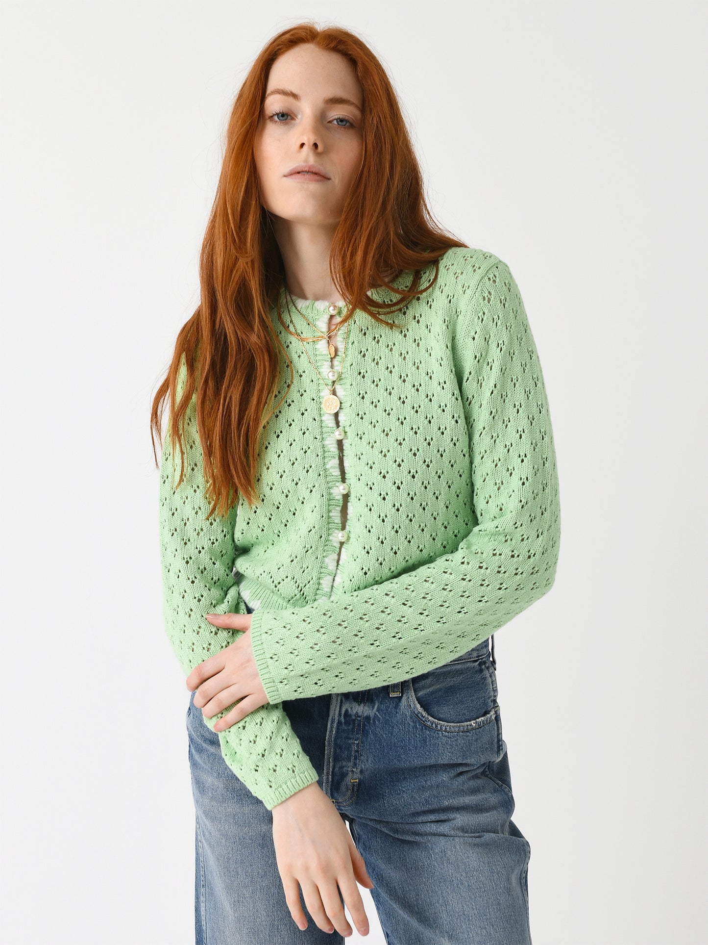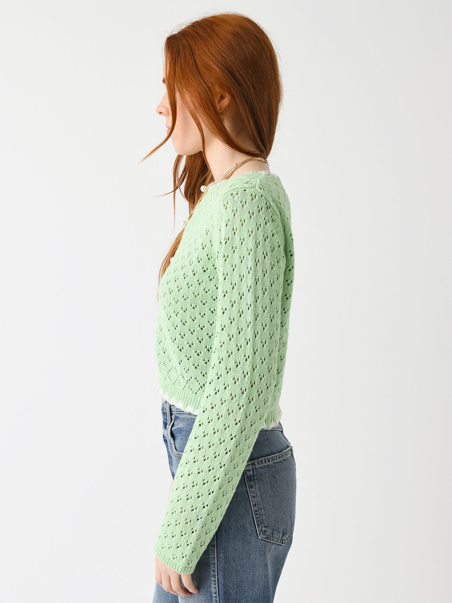 An intricate pointelle knit cardigan featuring hand-stitched trims with an ivory detail and pearl buttons.
