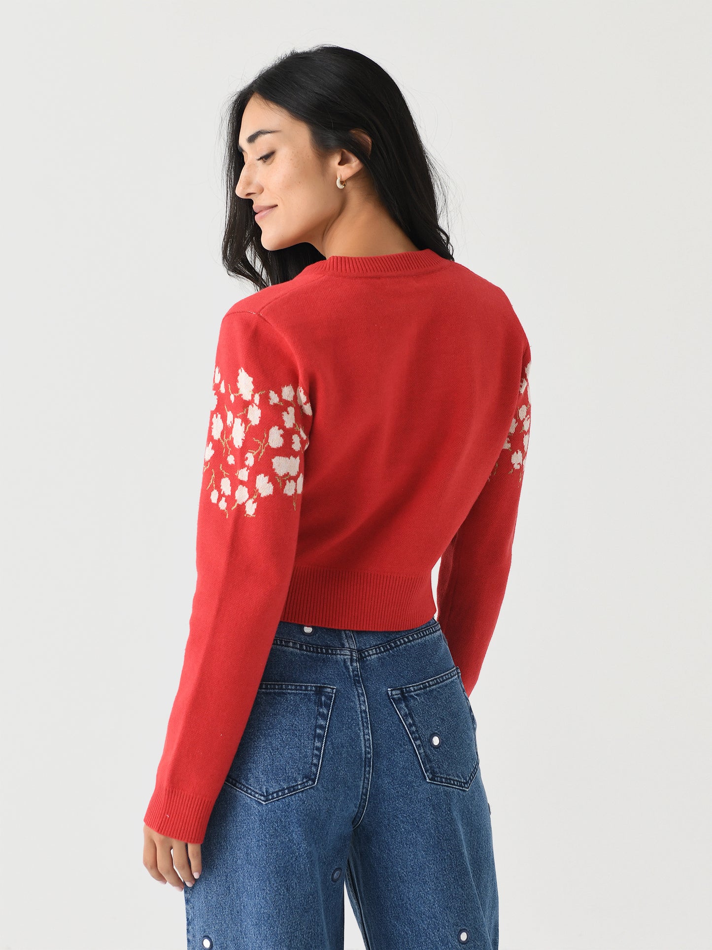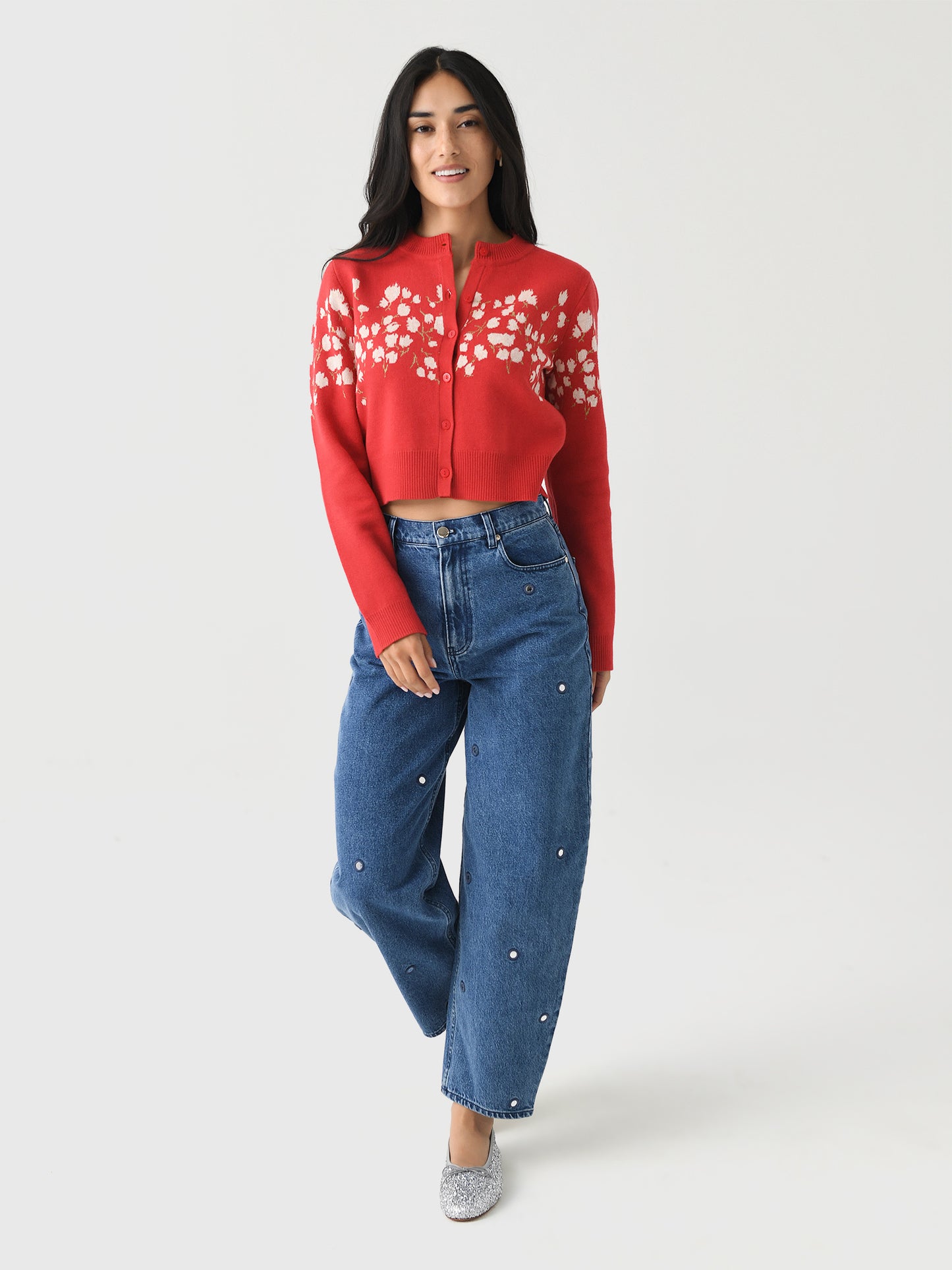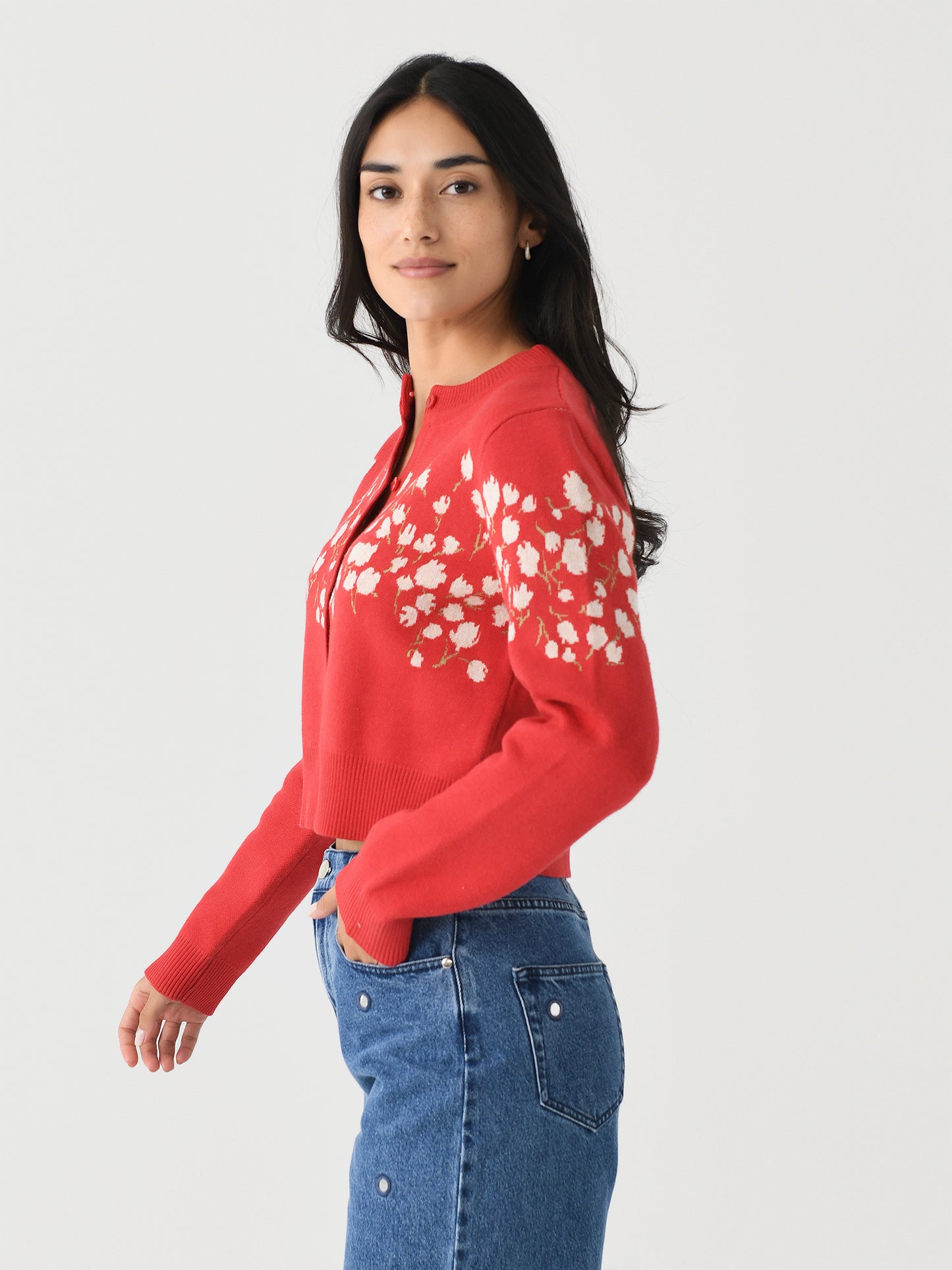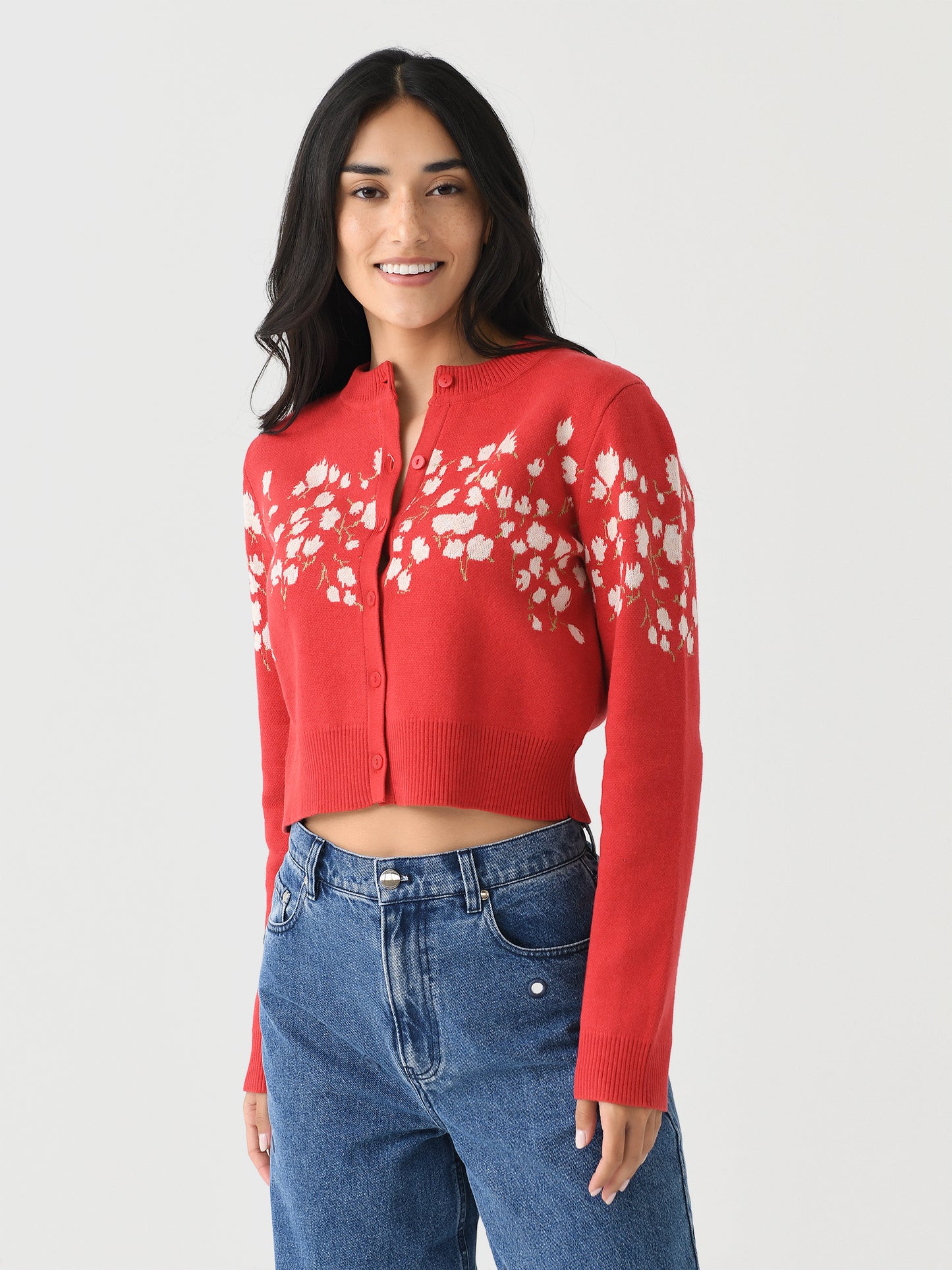 A button-down cardigan made from a cotton-wool blend with a contrast floral jacquard design.