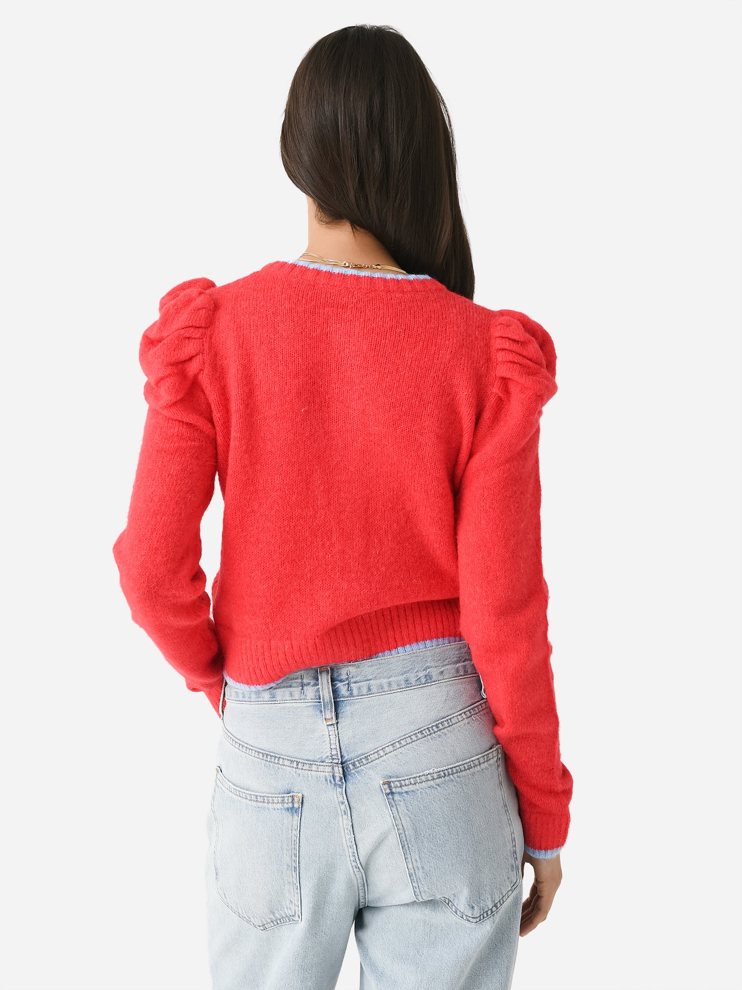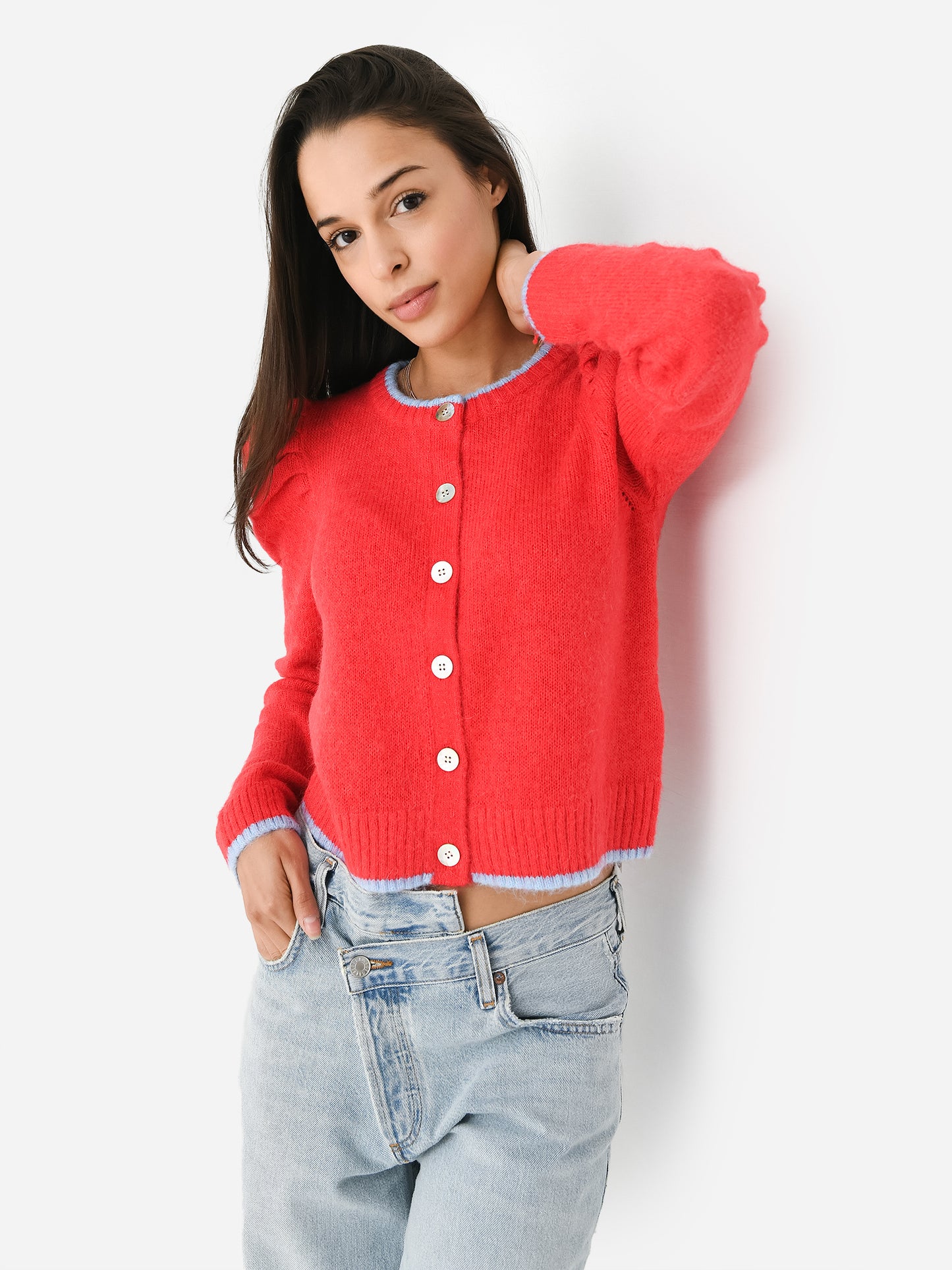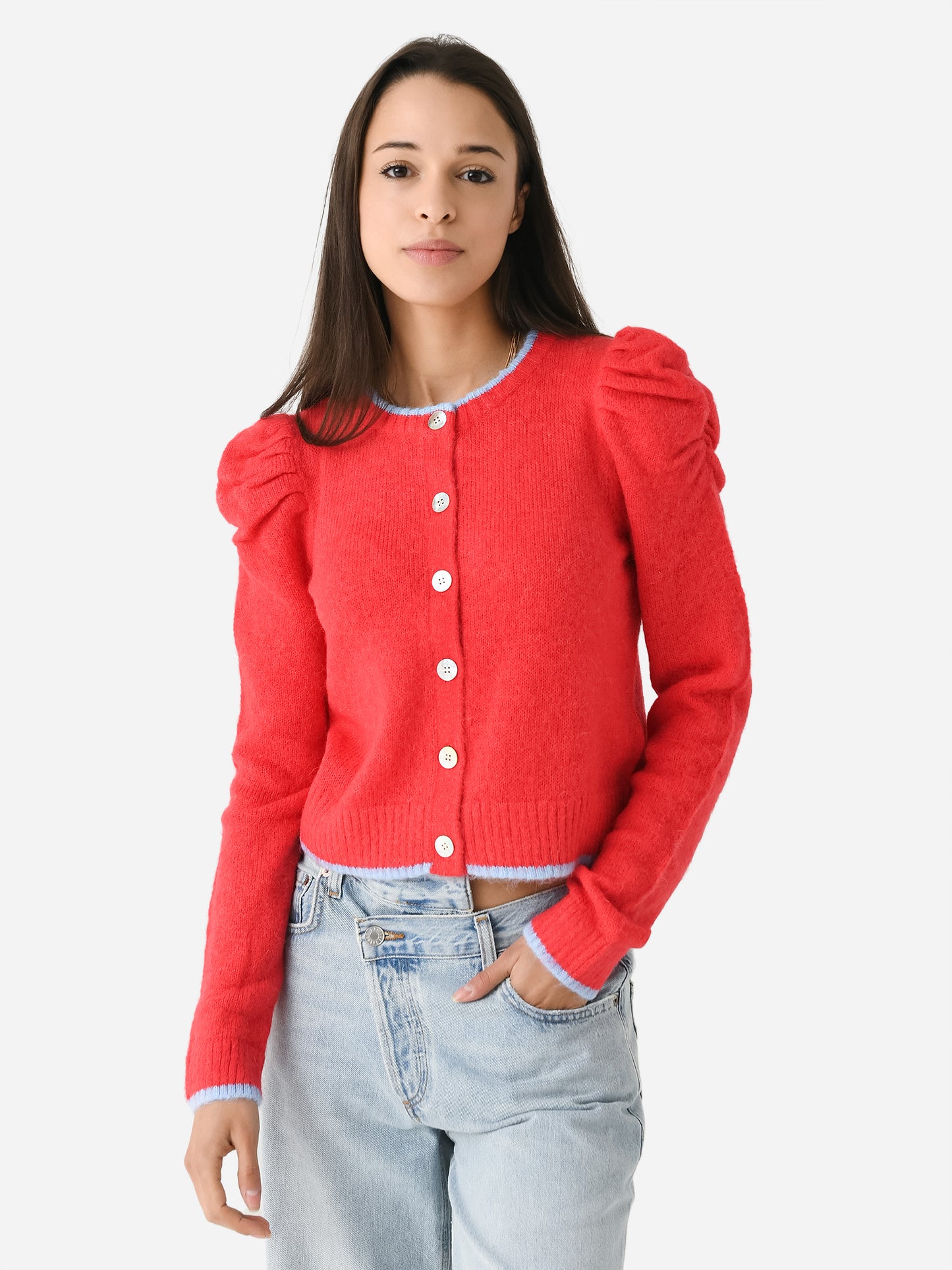 A form-fitting cardigan featuring gathered shoulders and contrast pale blue trims.