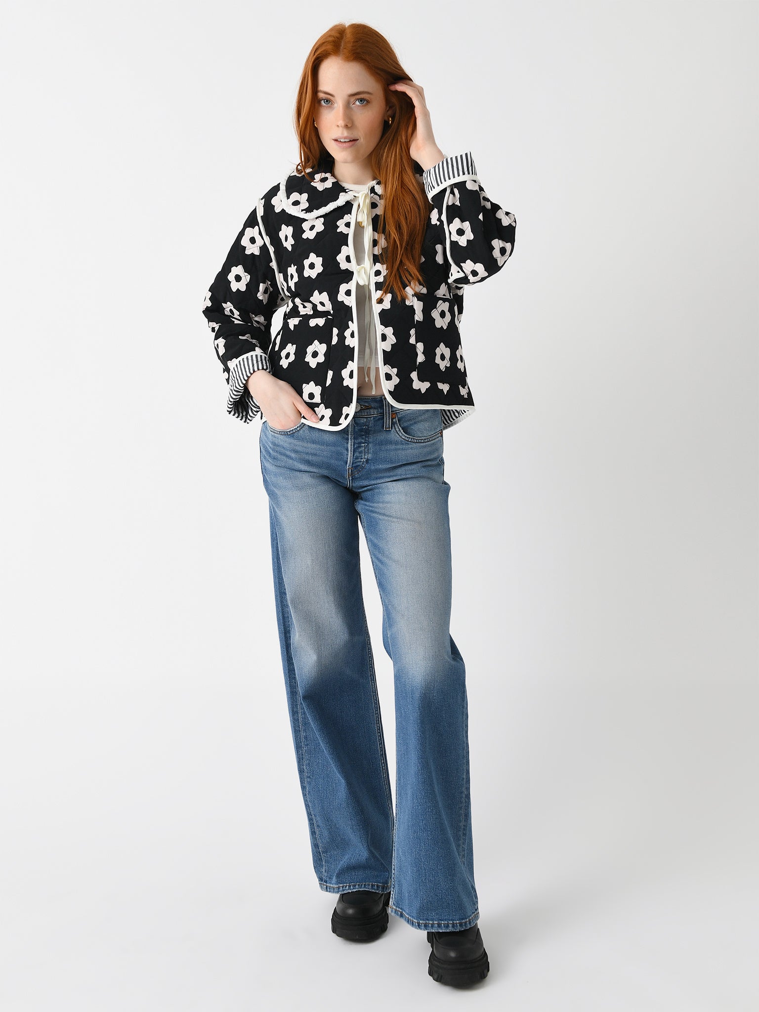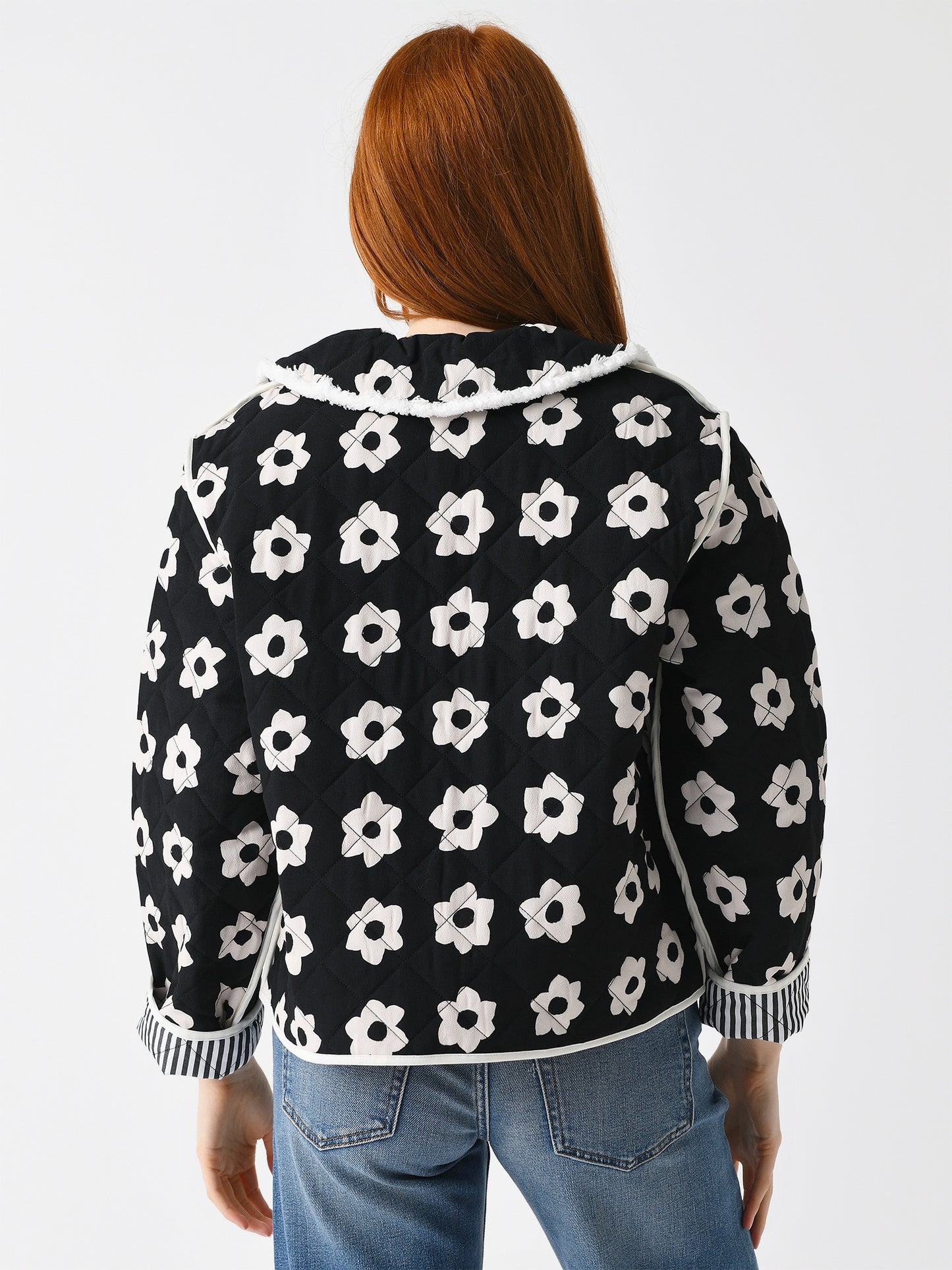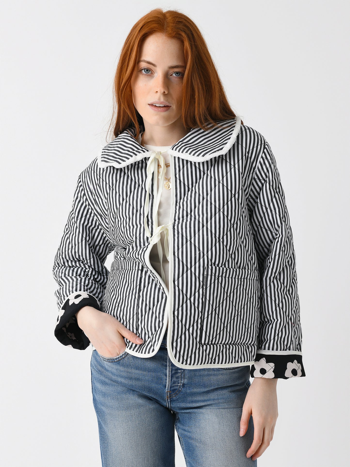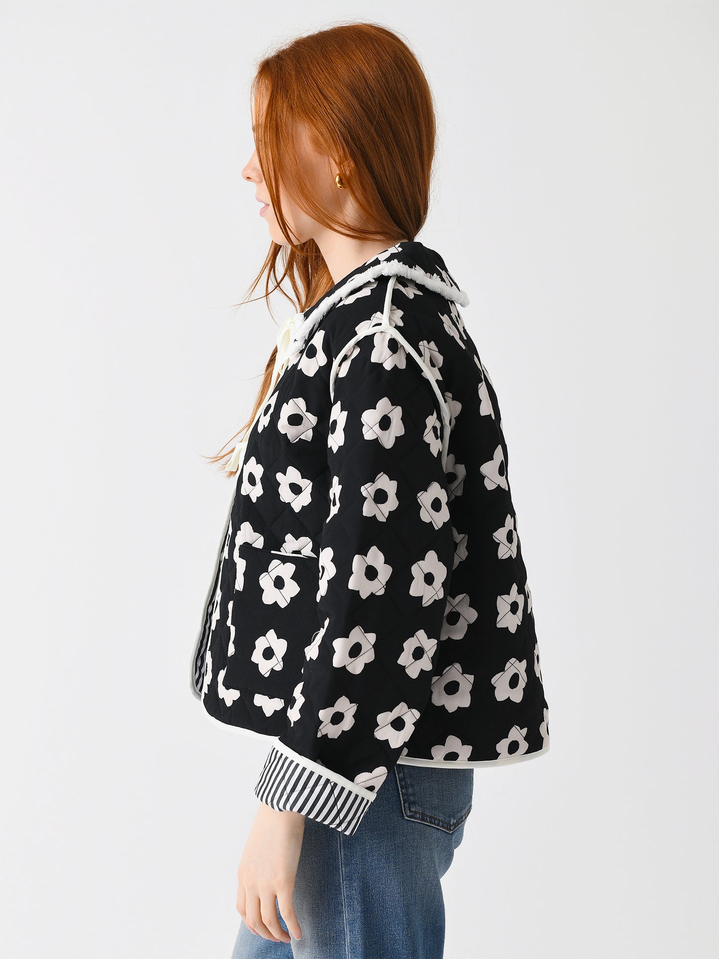 A lightweight quilted jacket featuring a retro-inspired floral print and a black and white stripe print on the reverse with chic tie closures.