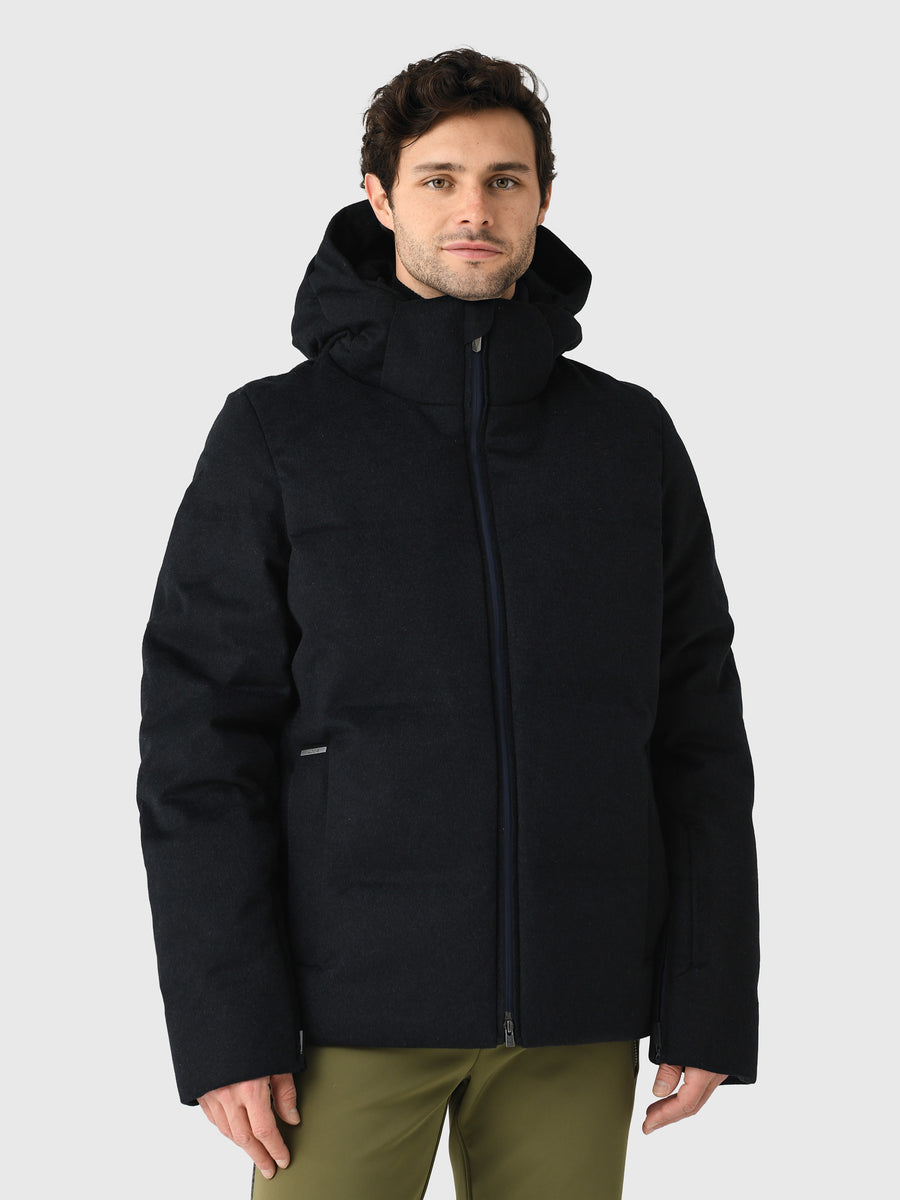 Fixed Hood Interior Pocket Ski Pass Pocket Side Zip Pockets Full Zip Closure Hideaway Ski Skirt 4-Way Stretch Water-Repellent Finish Insulation: 750-Fill Power 90% Down, 10% Feathers Shell: 100% Cashmere Classic Fit