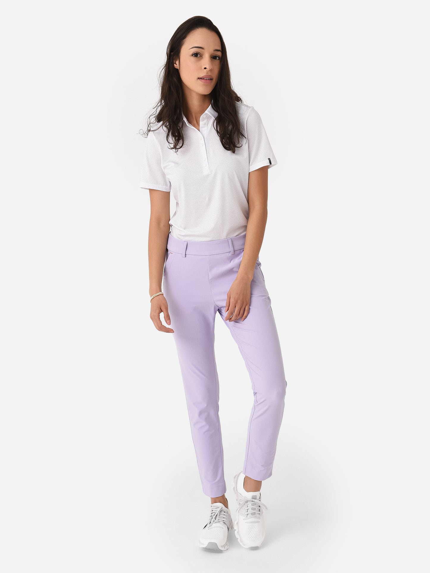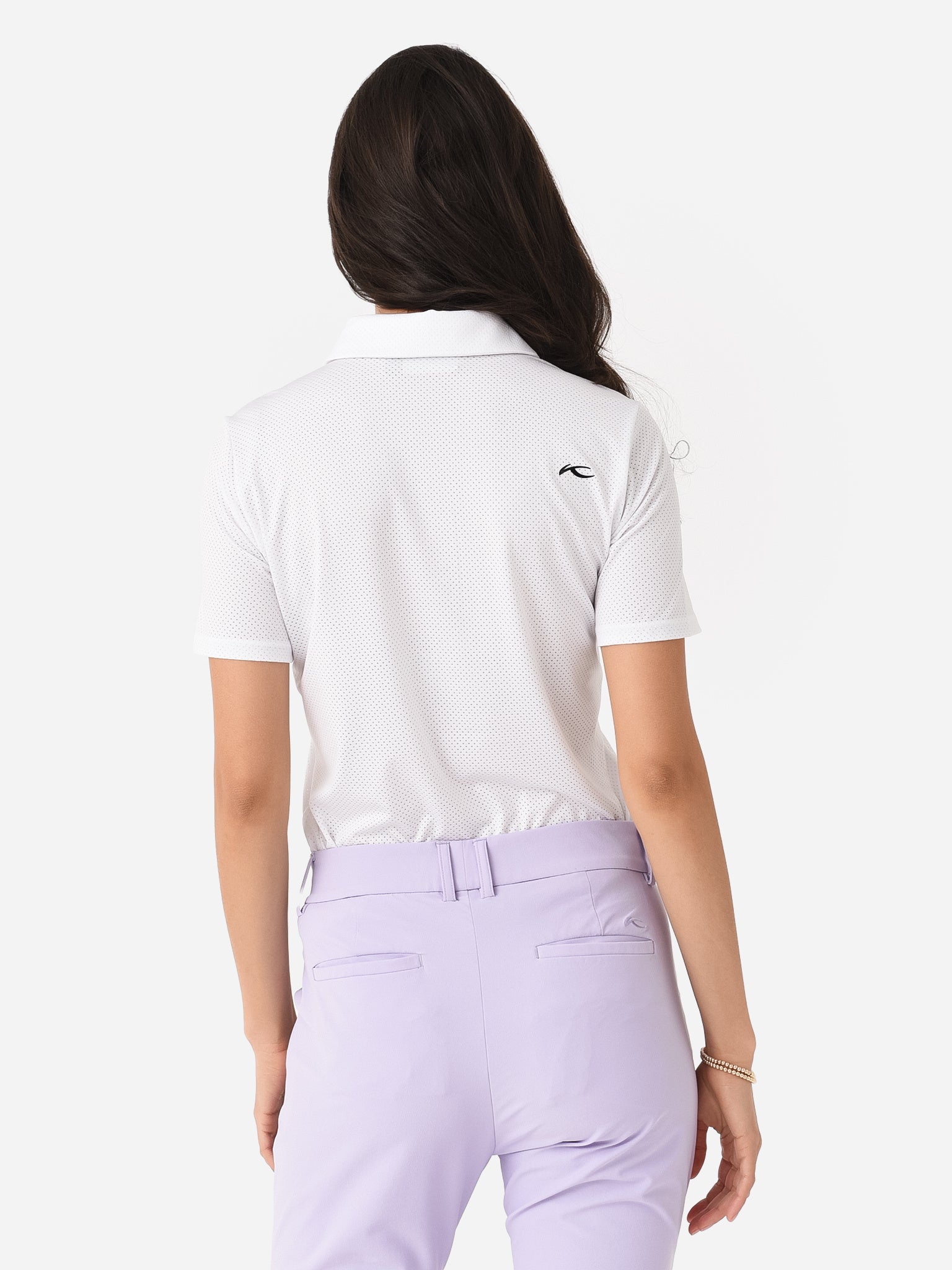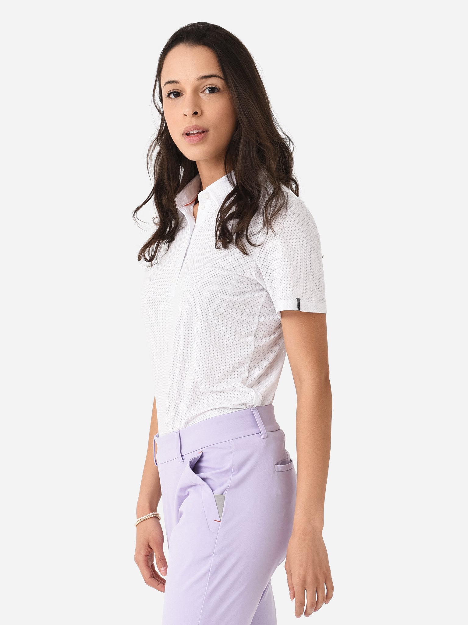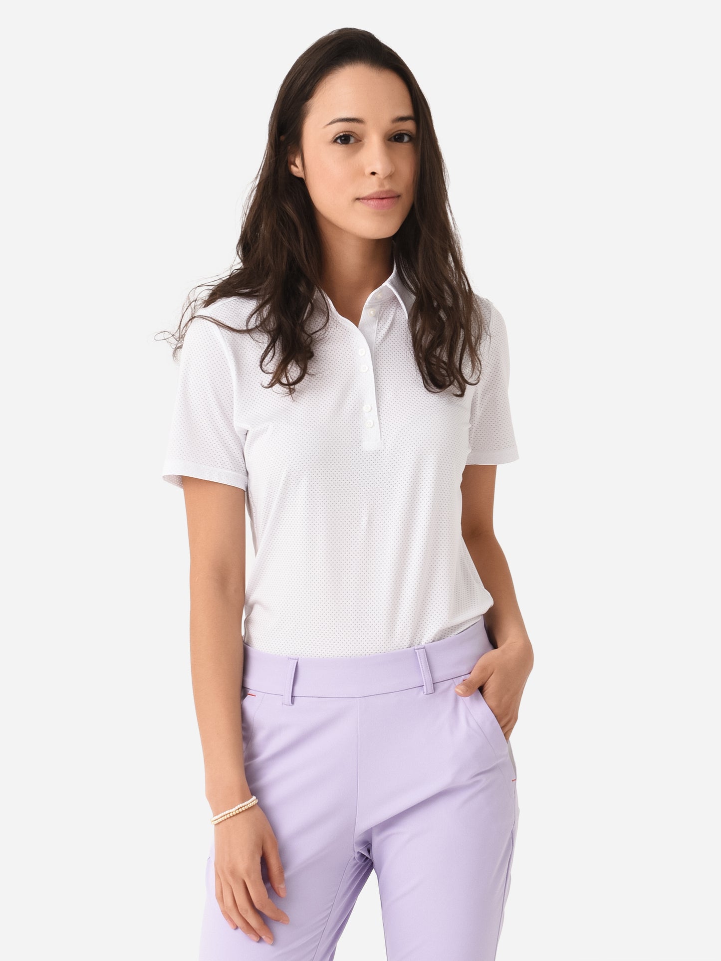 Breathable jacquard knit performance polo with a thin feminine button placket.