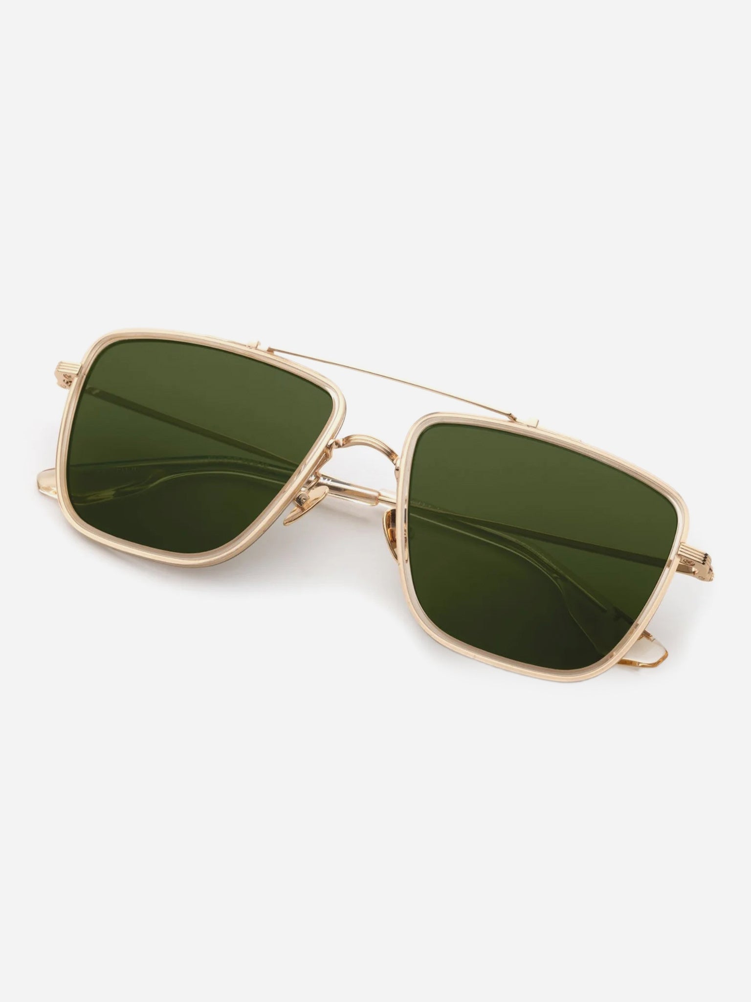 A pair of oversized sunglasses with a mixed-metal construction and a square navigator lens.