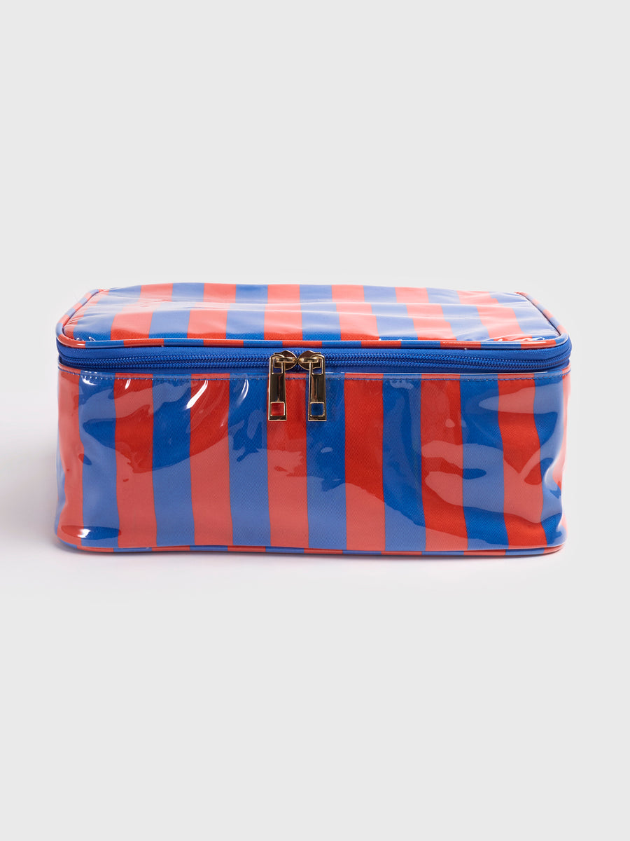 Travel-ready and styled in classic stripes, this cosmetic set is built for generous storage. With a roomy interior, secure zippered compartments, and a bonus second pouch, it easily holds and organizes your full skincare regimen.