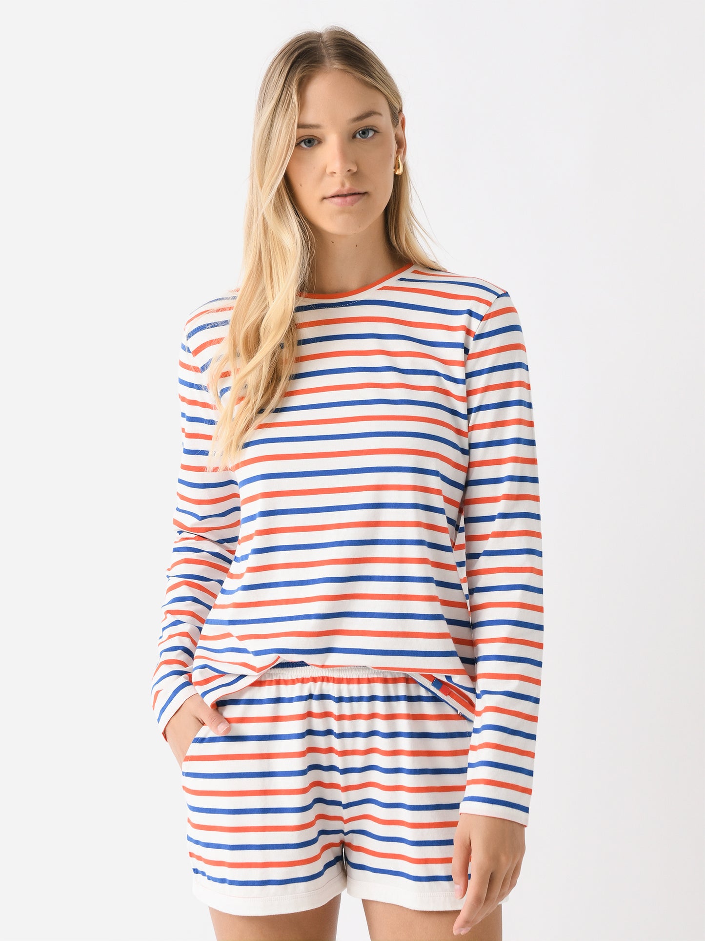 A long-sleeve cotton tee with a red, white, and blue striped design.