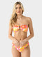 A bandeau-style bikini top with a back self-tie closure and vibrant tropical print.