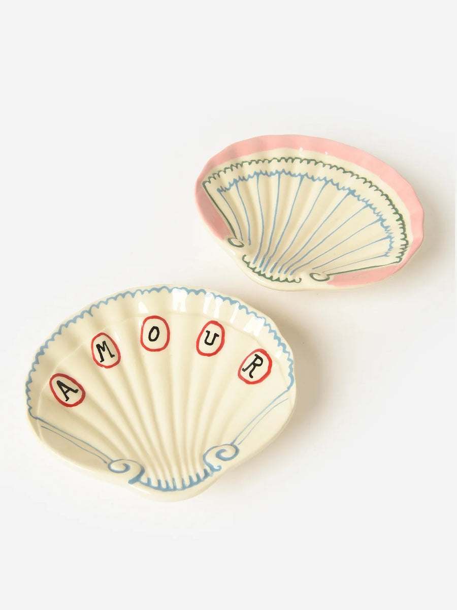 Set of two shell-shaped stoneware dishes with hand-painted designs.