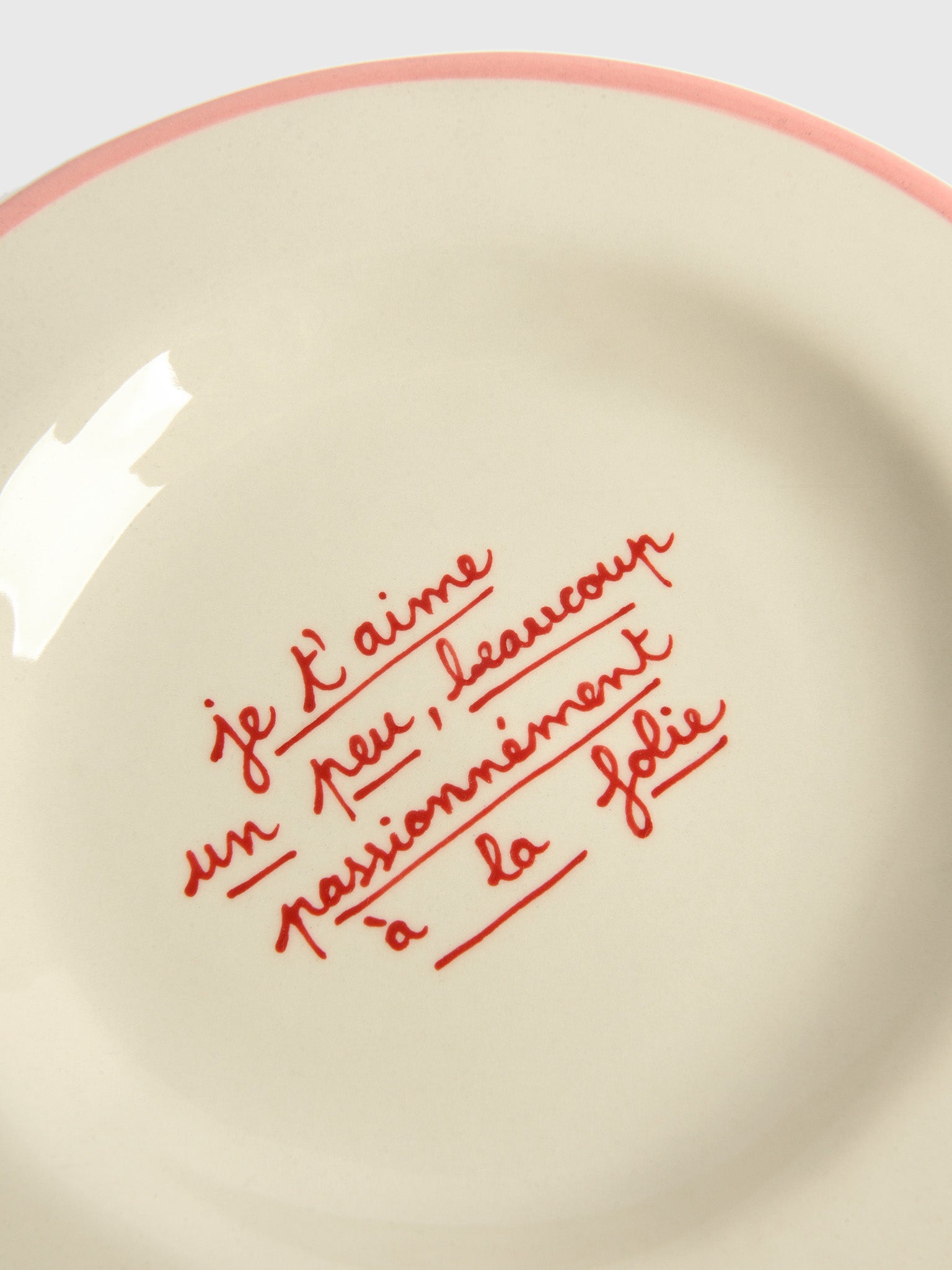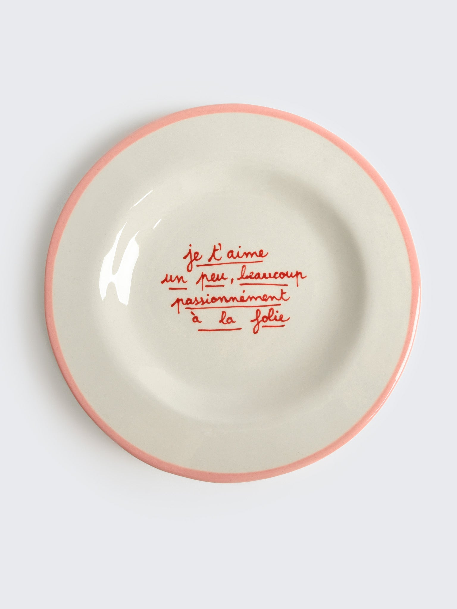 This charming dessert plate is crafted from creamy glazed stoneware. The plate features a handwritten-style inscription that reads "je t'aime un peu, beaucoup, passionnément, à la folie" – a classic French expression of love meaning "I love you a little, a lot, passionately, madly."