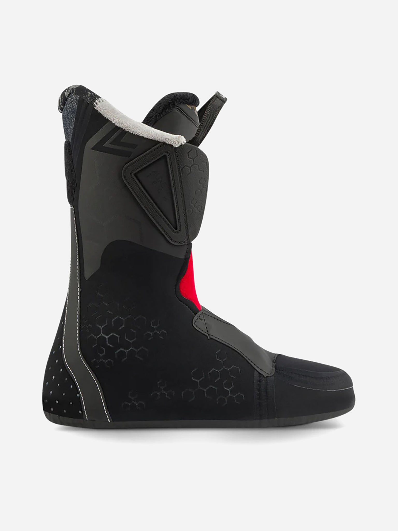 These ski boots feature a Dual Pivot design, creating a mechanical advantage for full boot engagement with less effort.