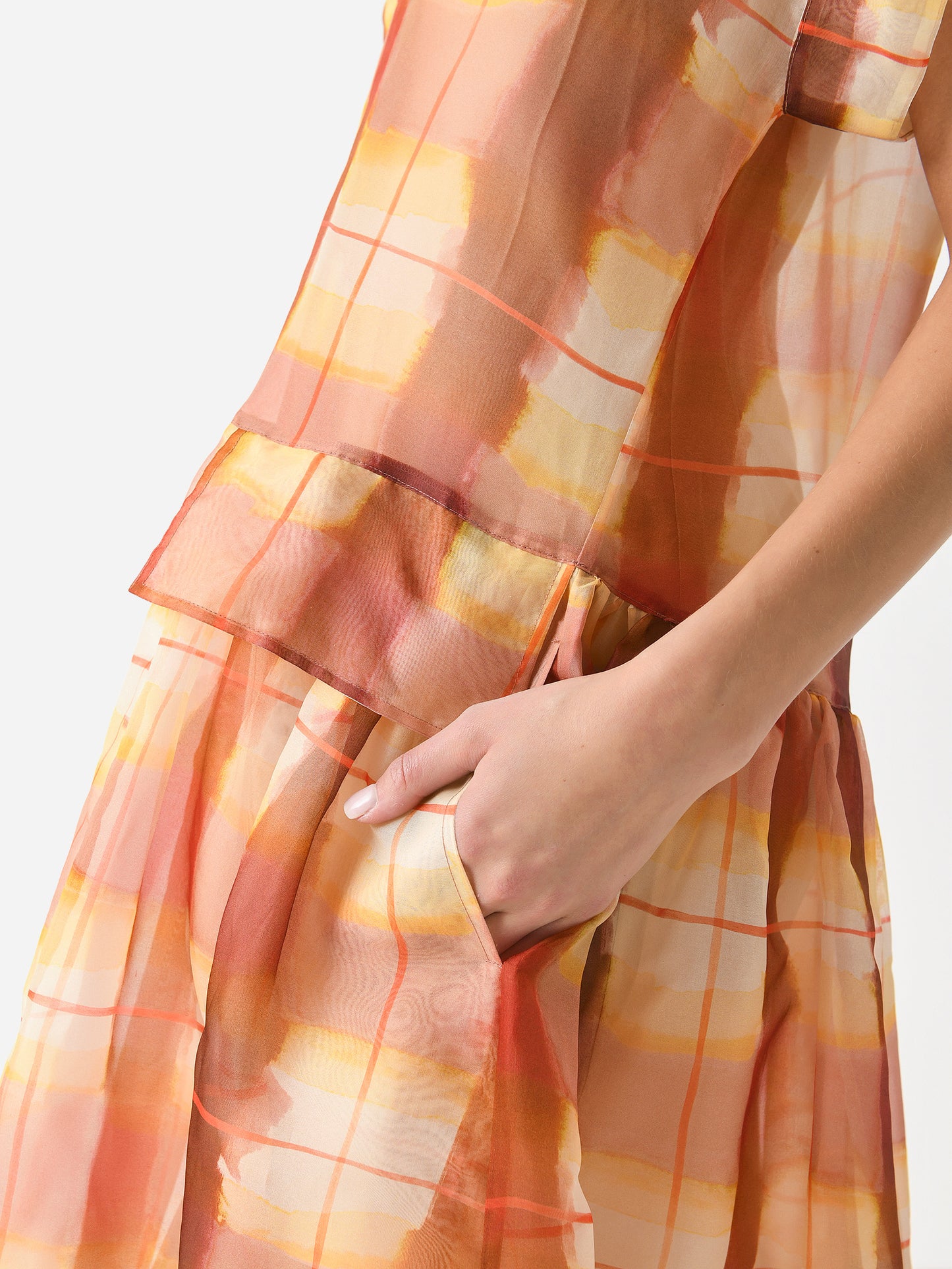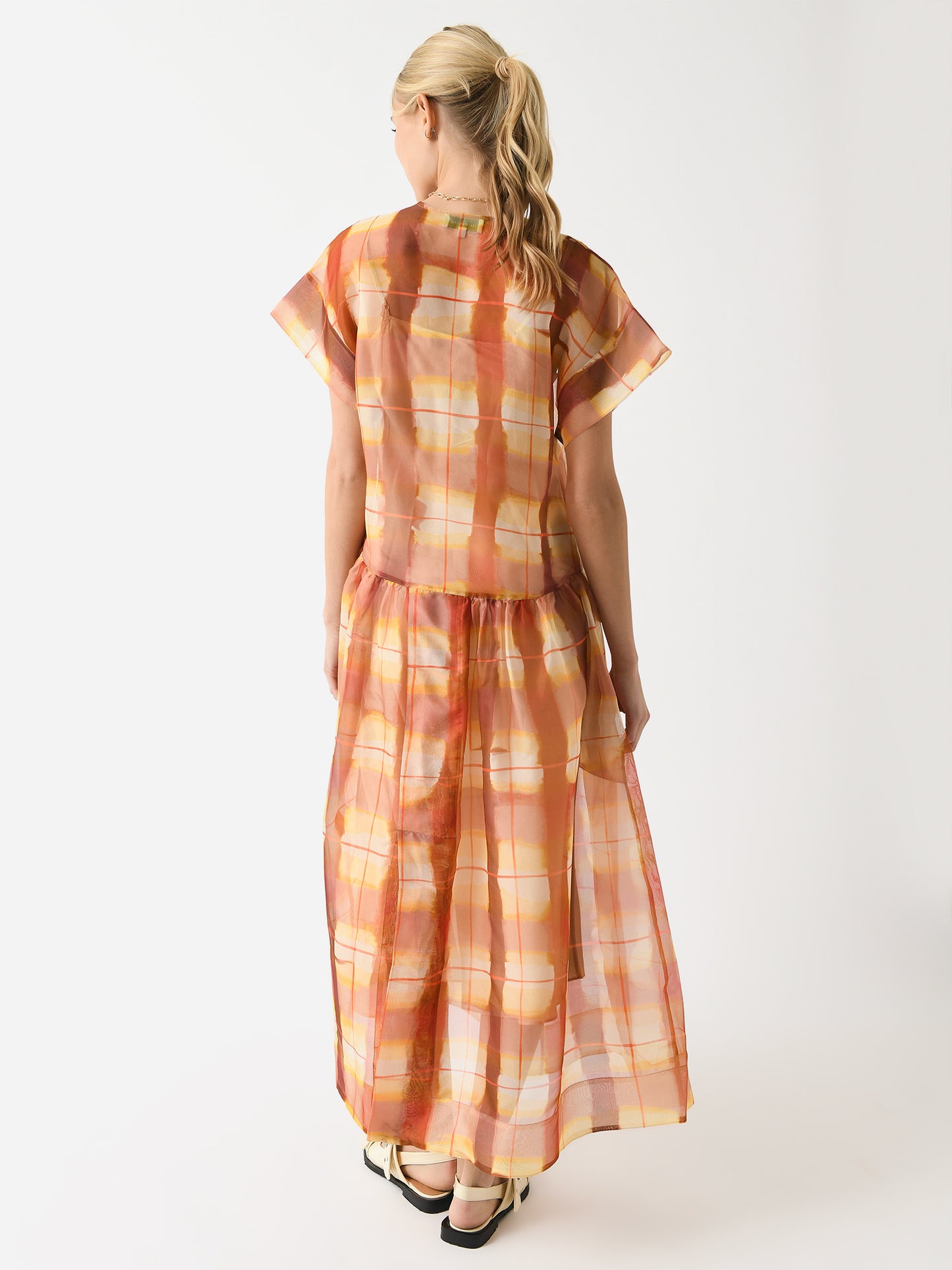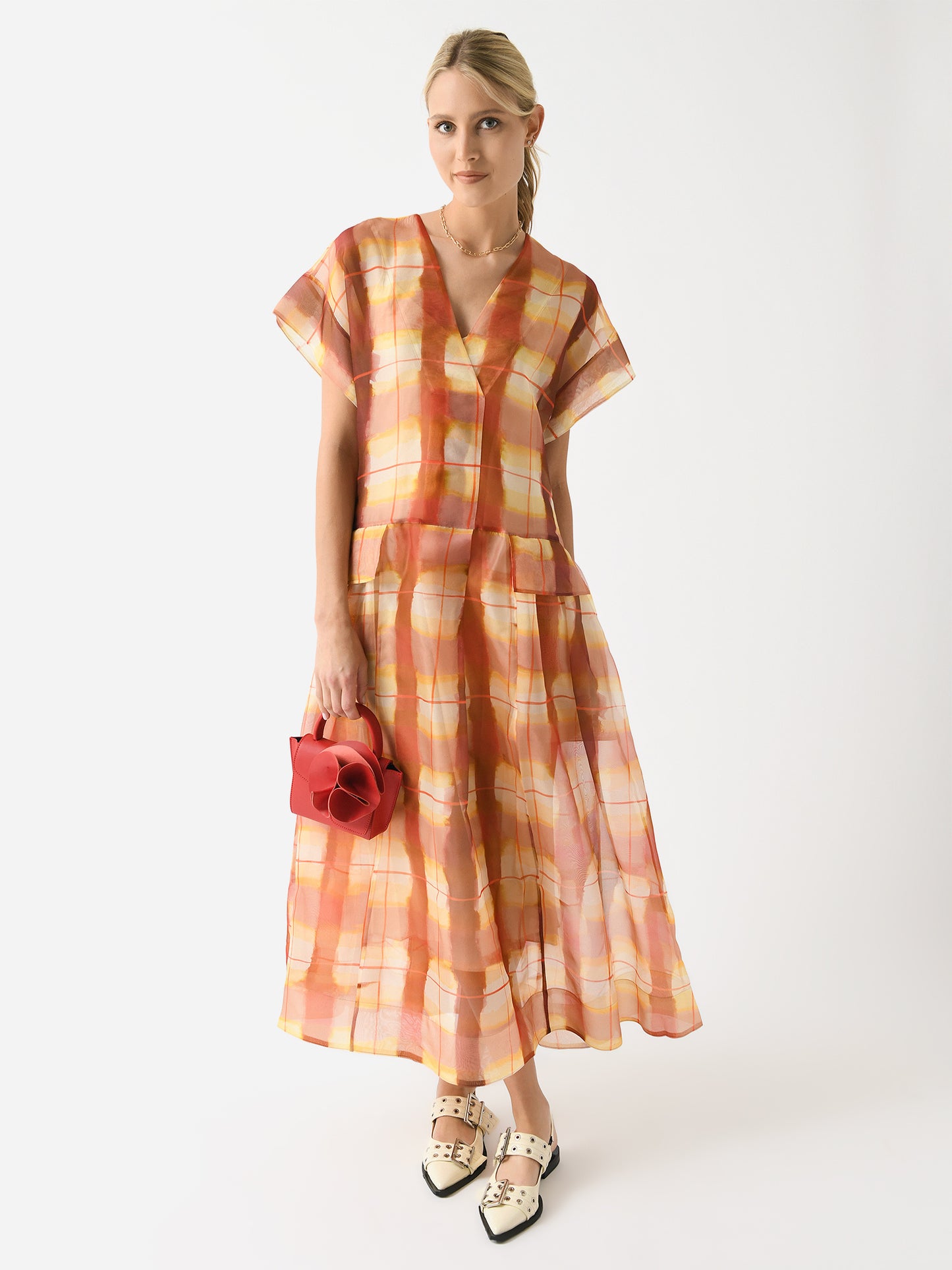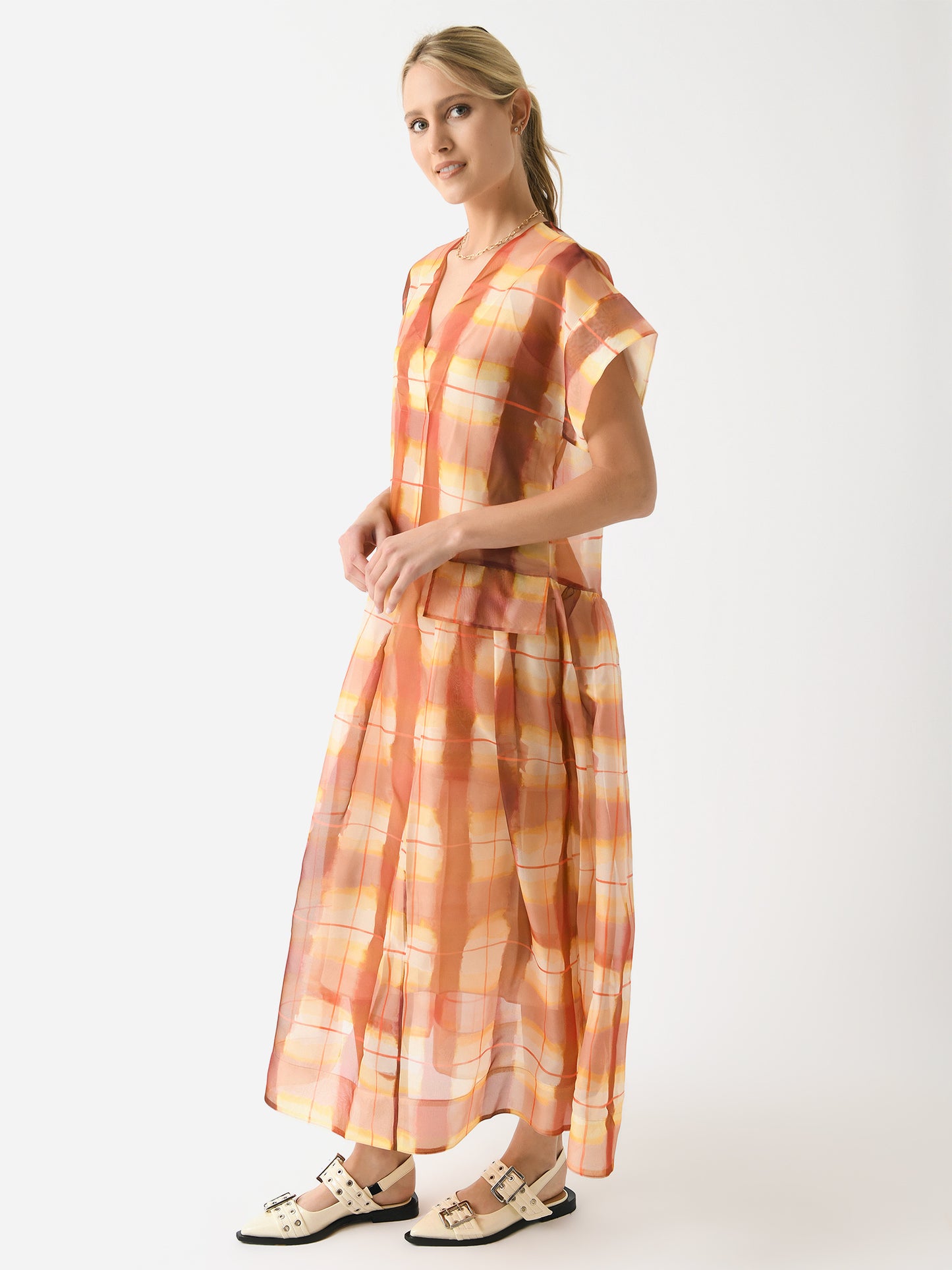 A printed maxi-length v-neck dress made from sheer silk organza fabric with a light sheen.