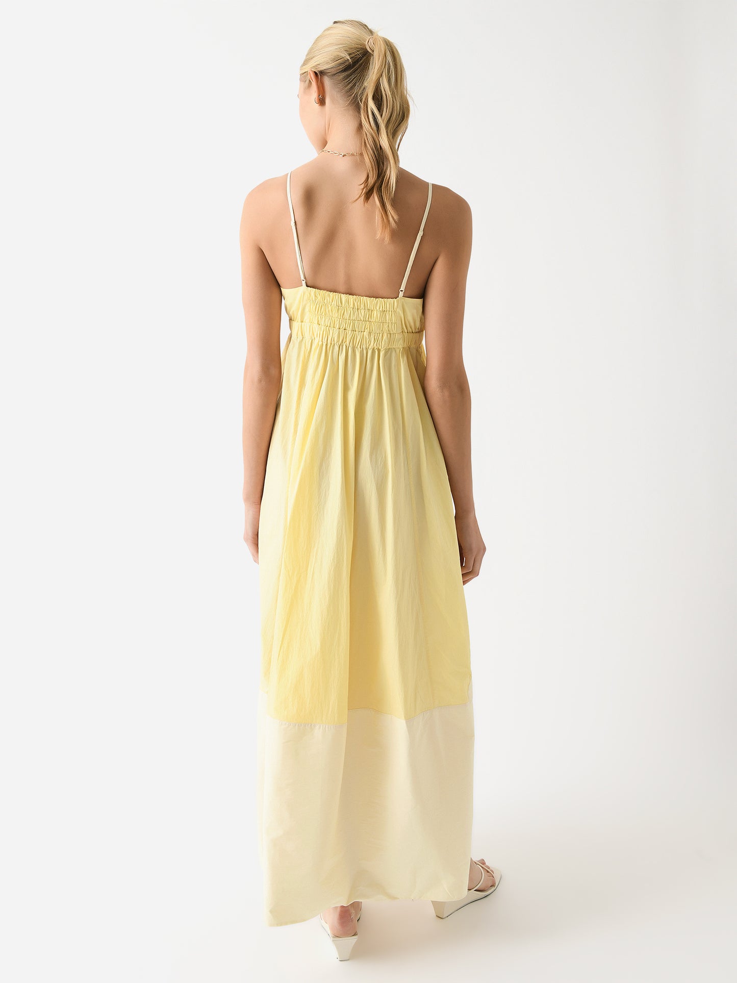 A maxi sundress made from lightweight fabric with comfortable elastic details and contrast panels at the bust and hem.