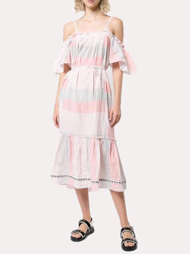 The Dera Off Shoulder Short Dress is crafted from lightweight washed cotton and features distinctly feminine details such as lurex threading, a ruffled flutter skirt and sleeves, and an off-shoulder fit for just a hint of skin
