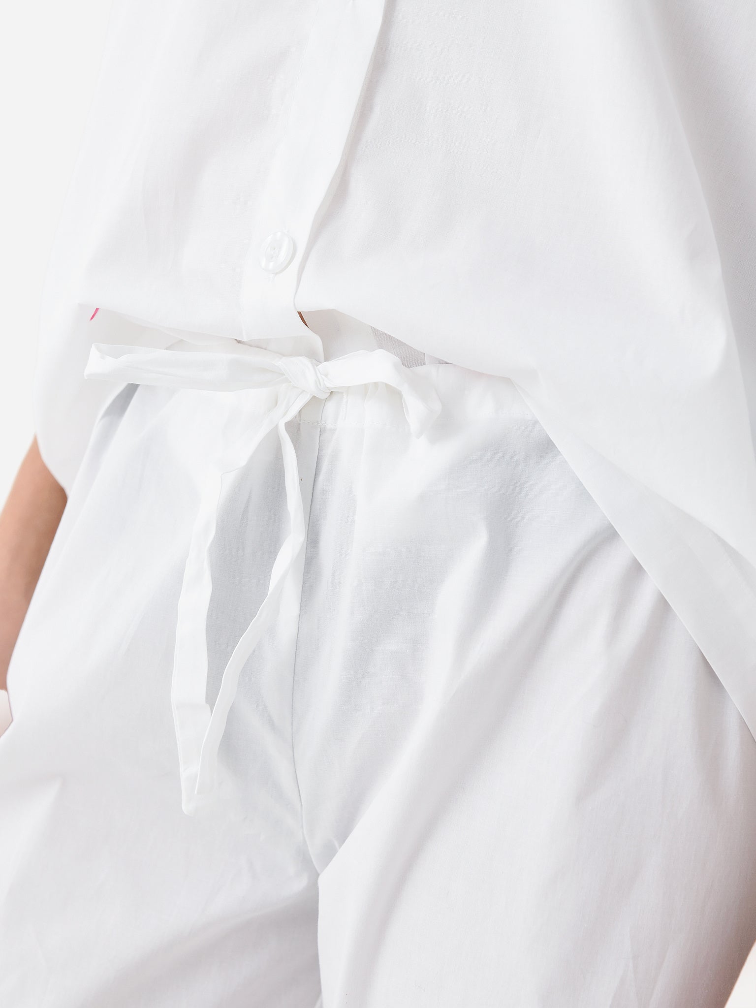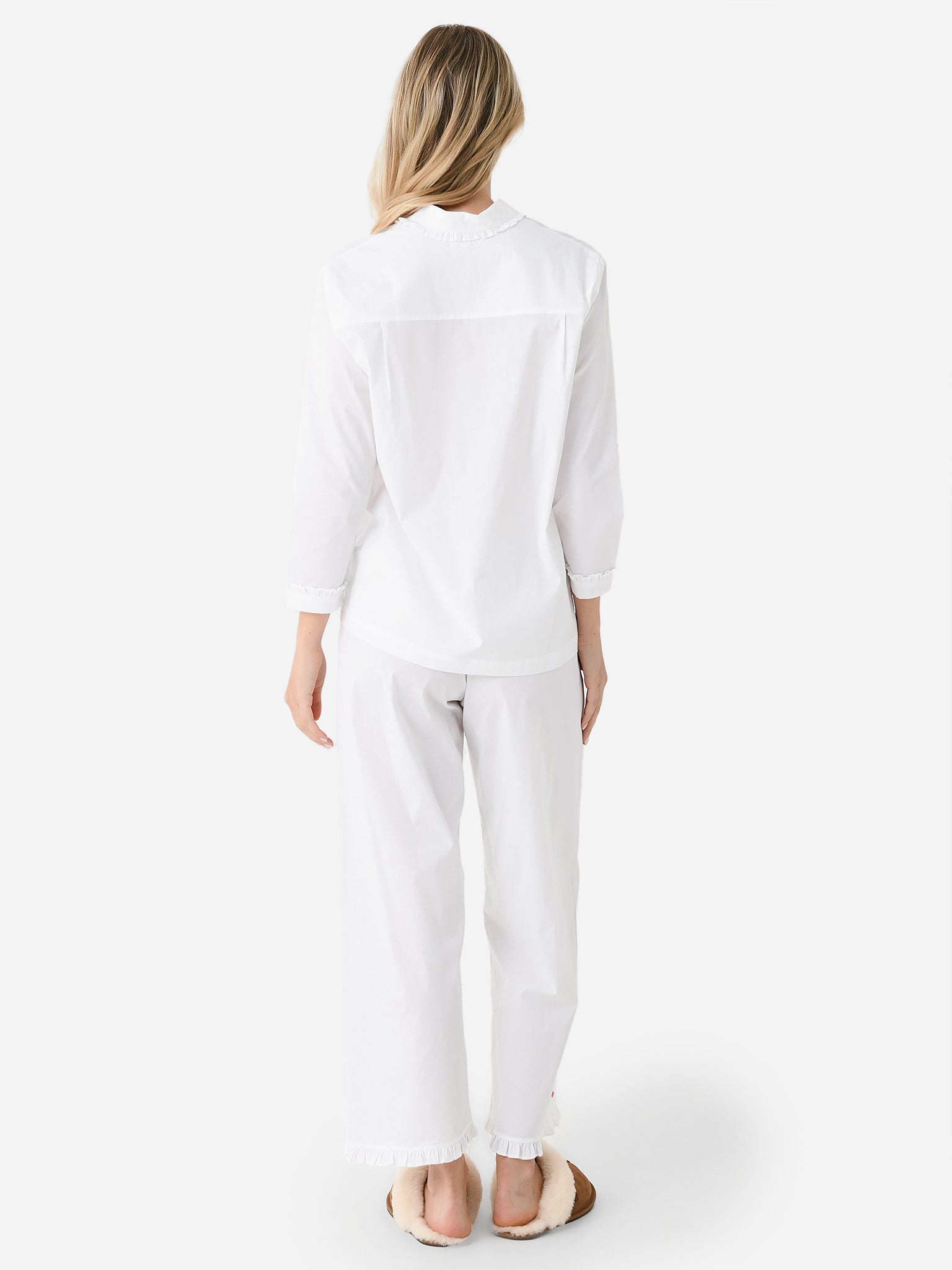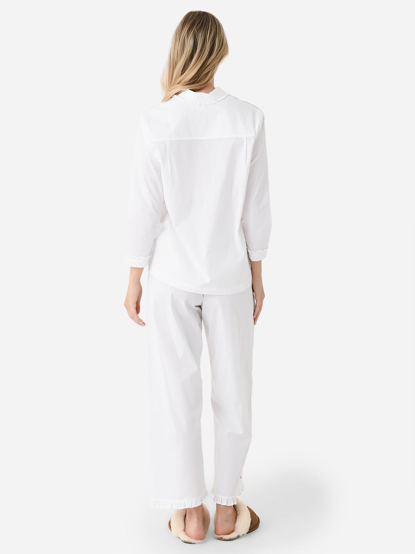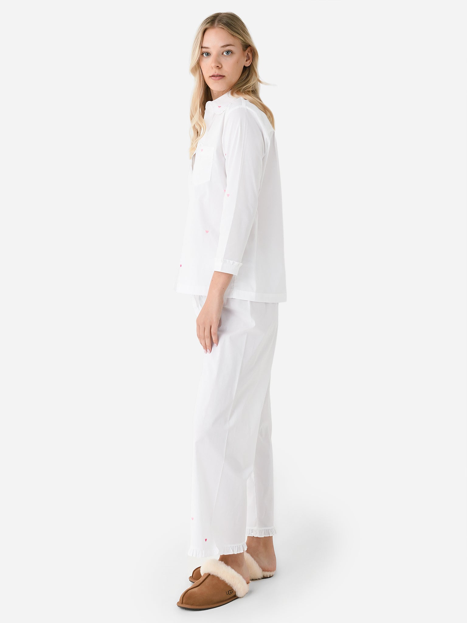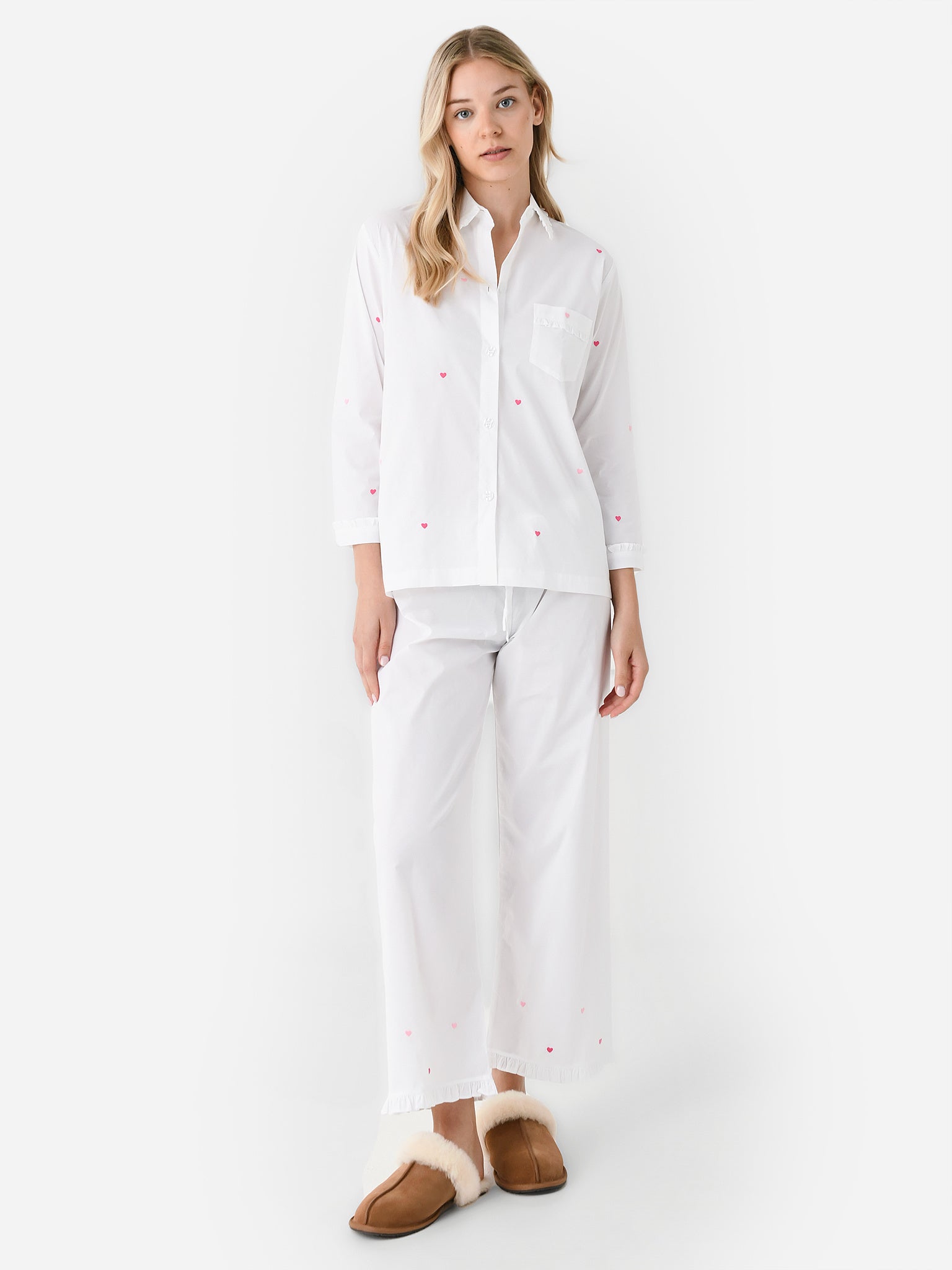 A lightweight cotton pajama set featuring ruffle trims and two-tone embroidered hearts.
