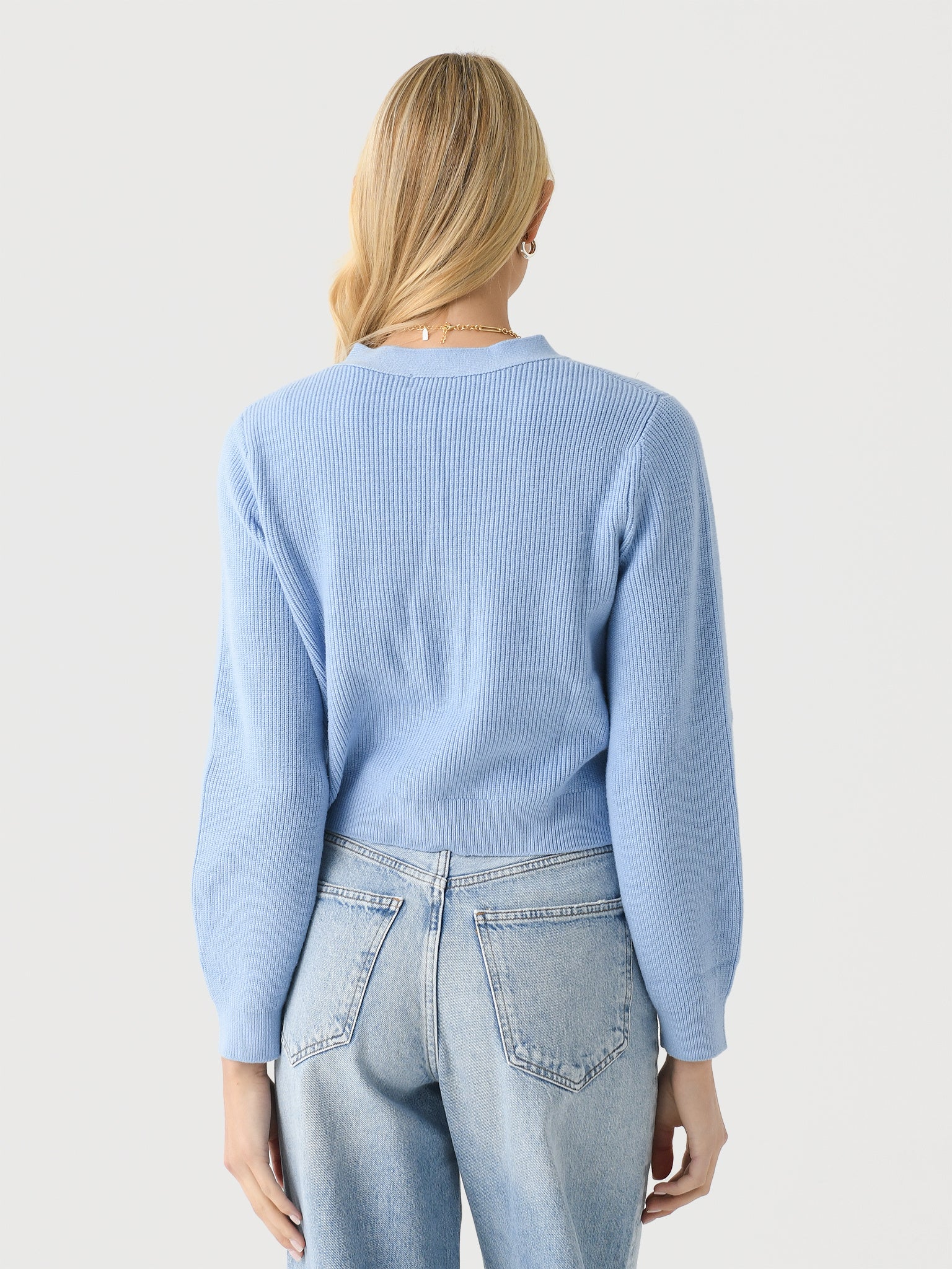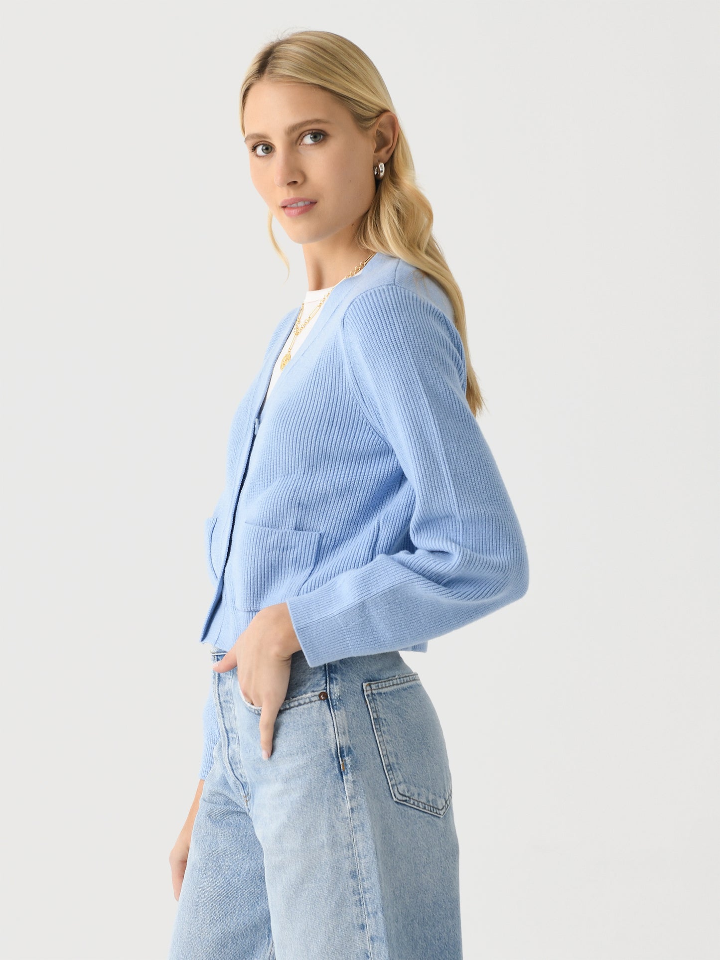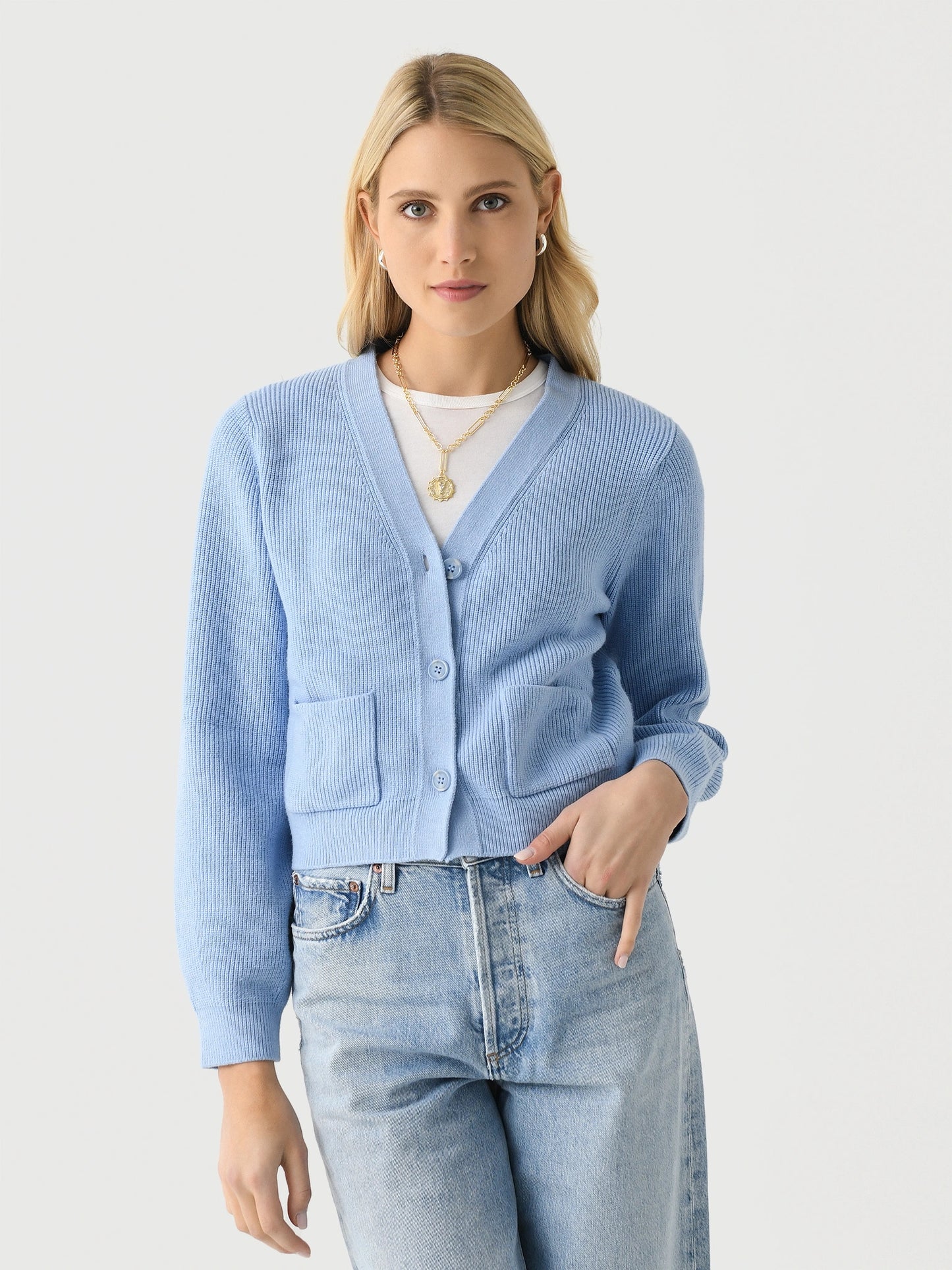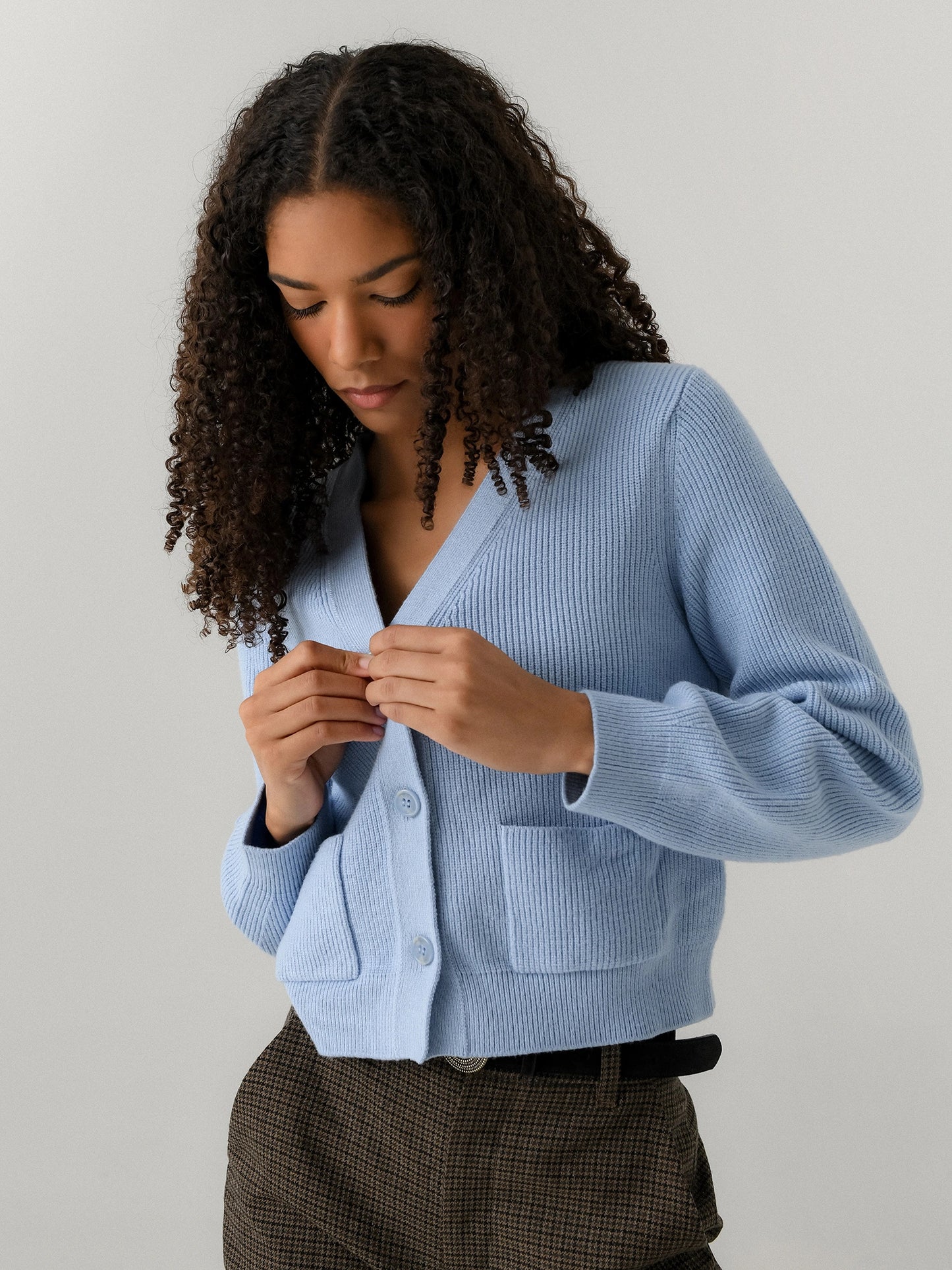 A slightly cropped cardigan made from soft ribbed knit fabric and finished with patch pockets.