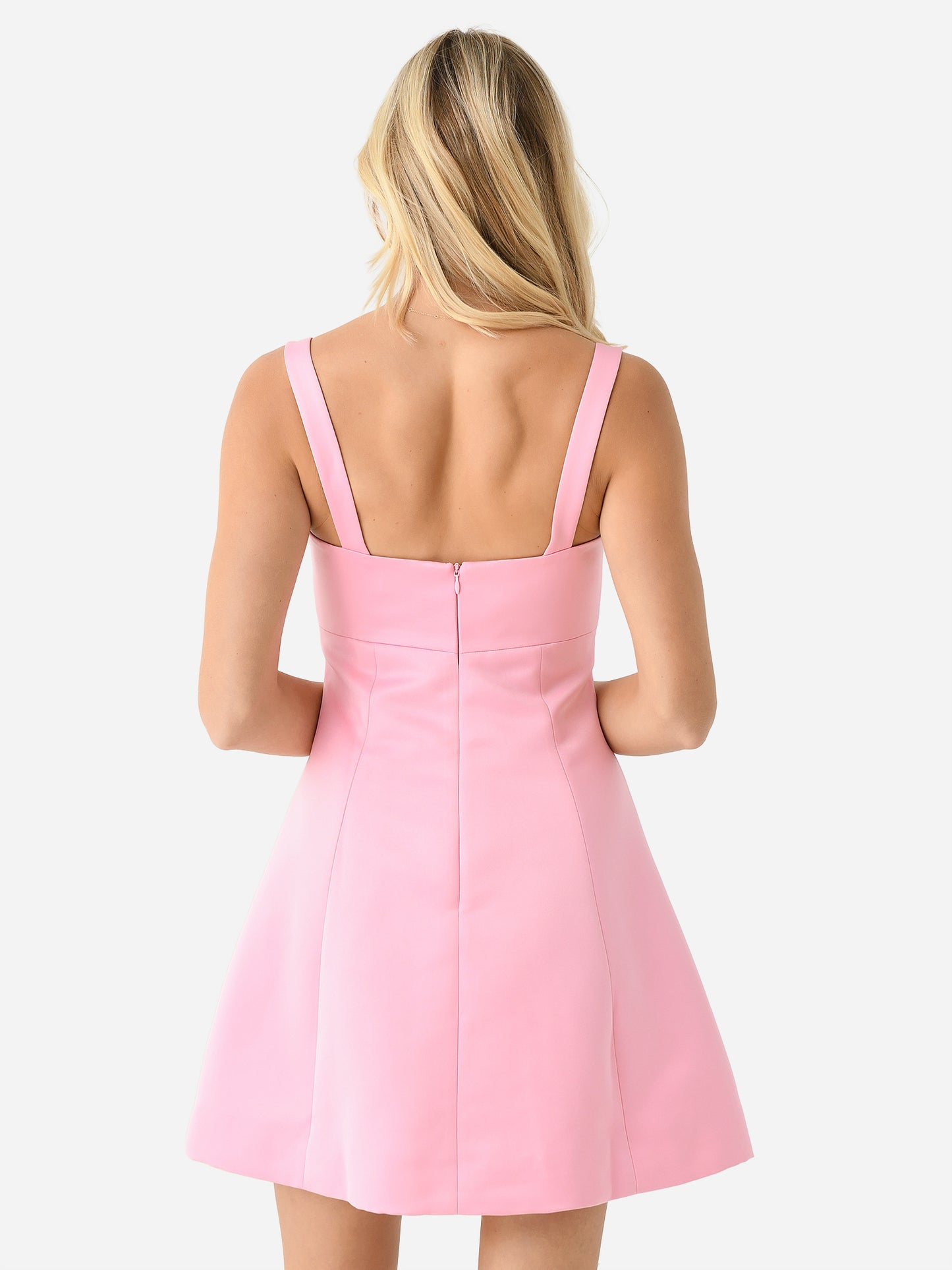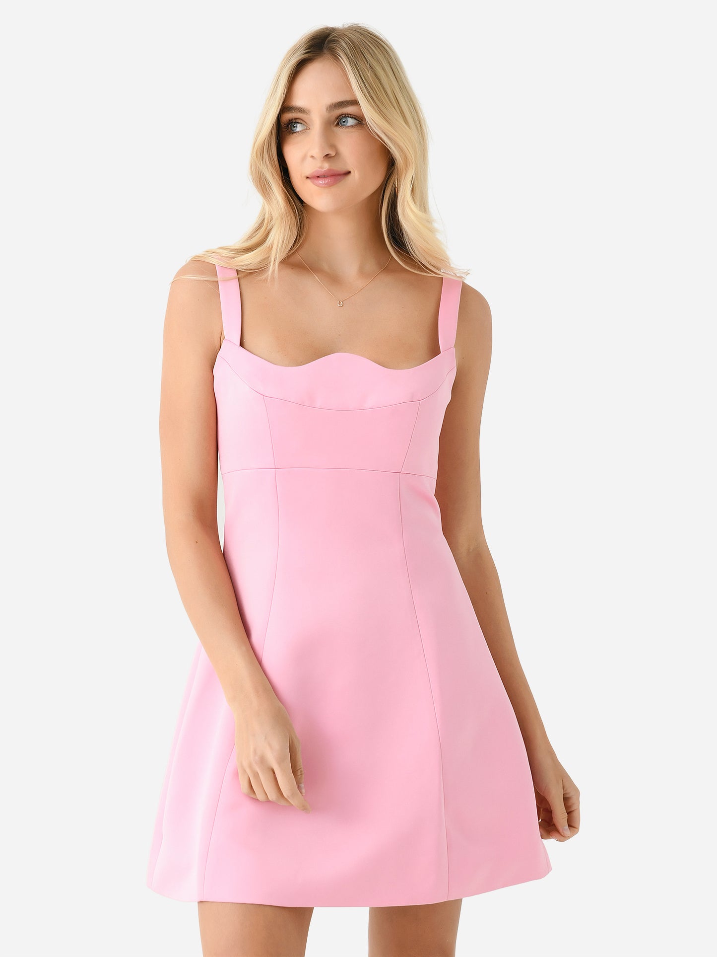 A fitted mini dress featuring a unique reverse sweetheart neckline and a-line skirt.