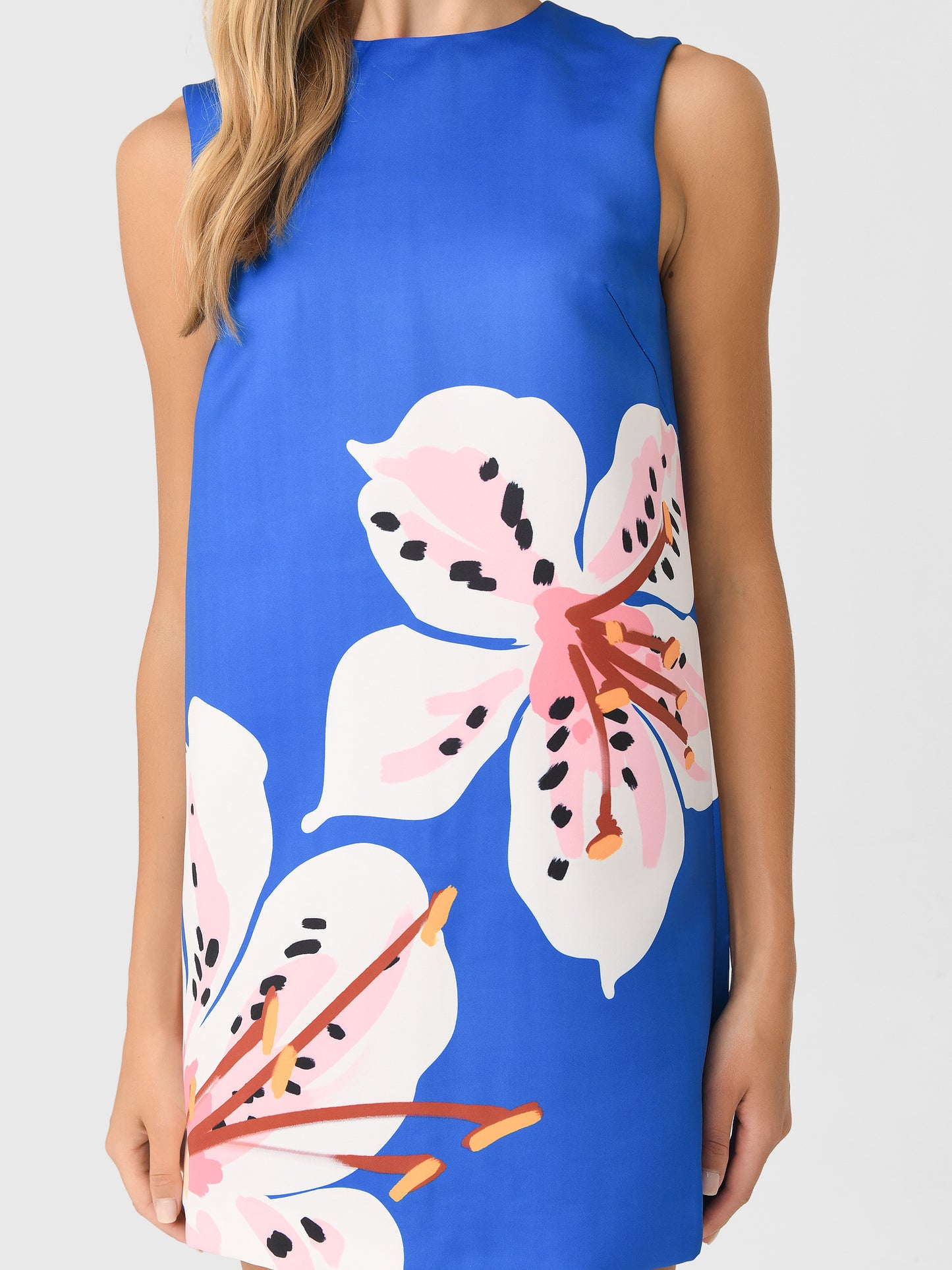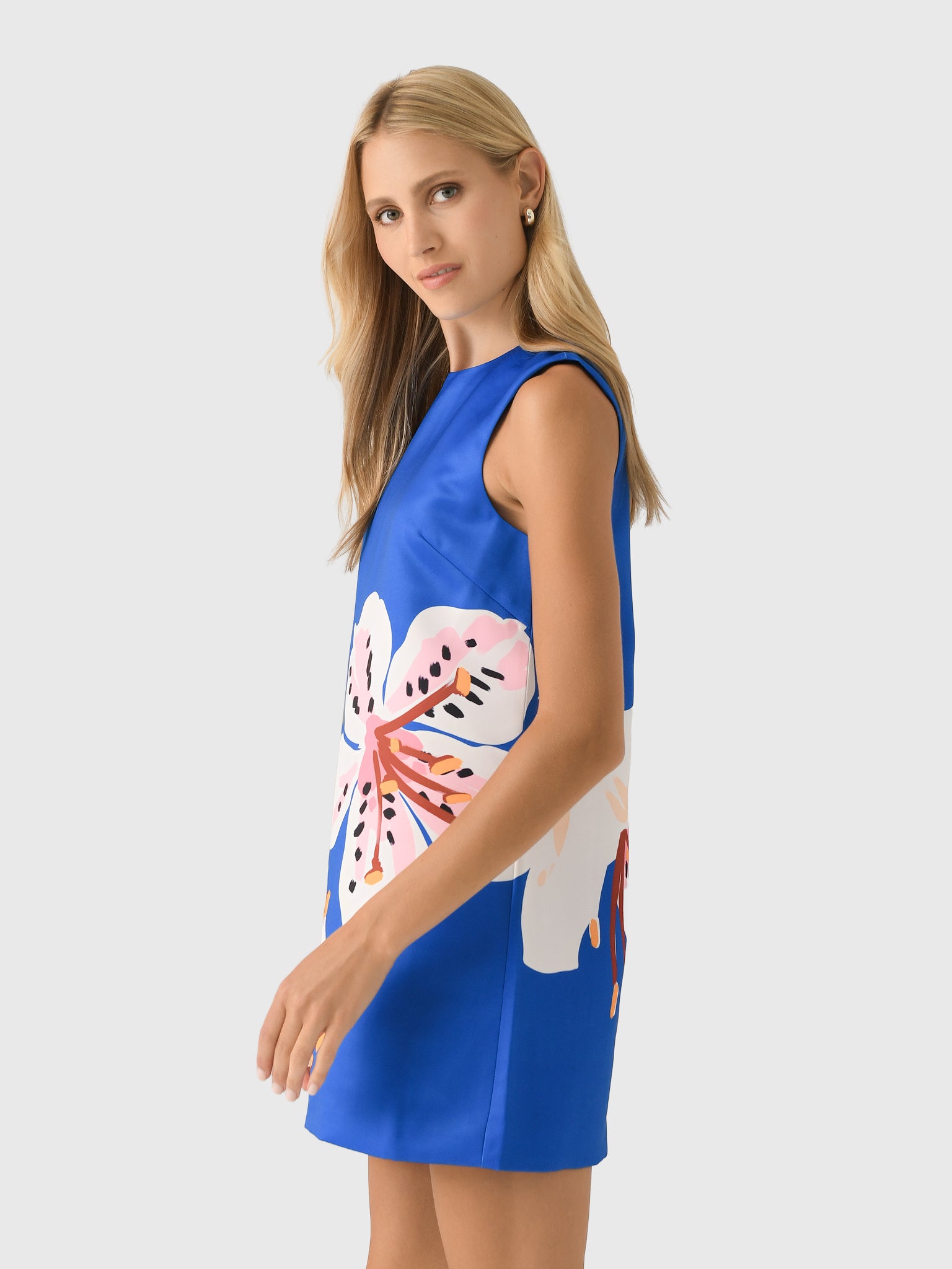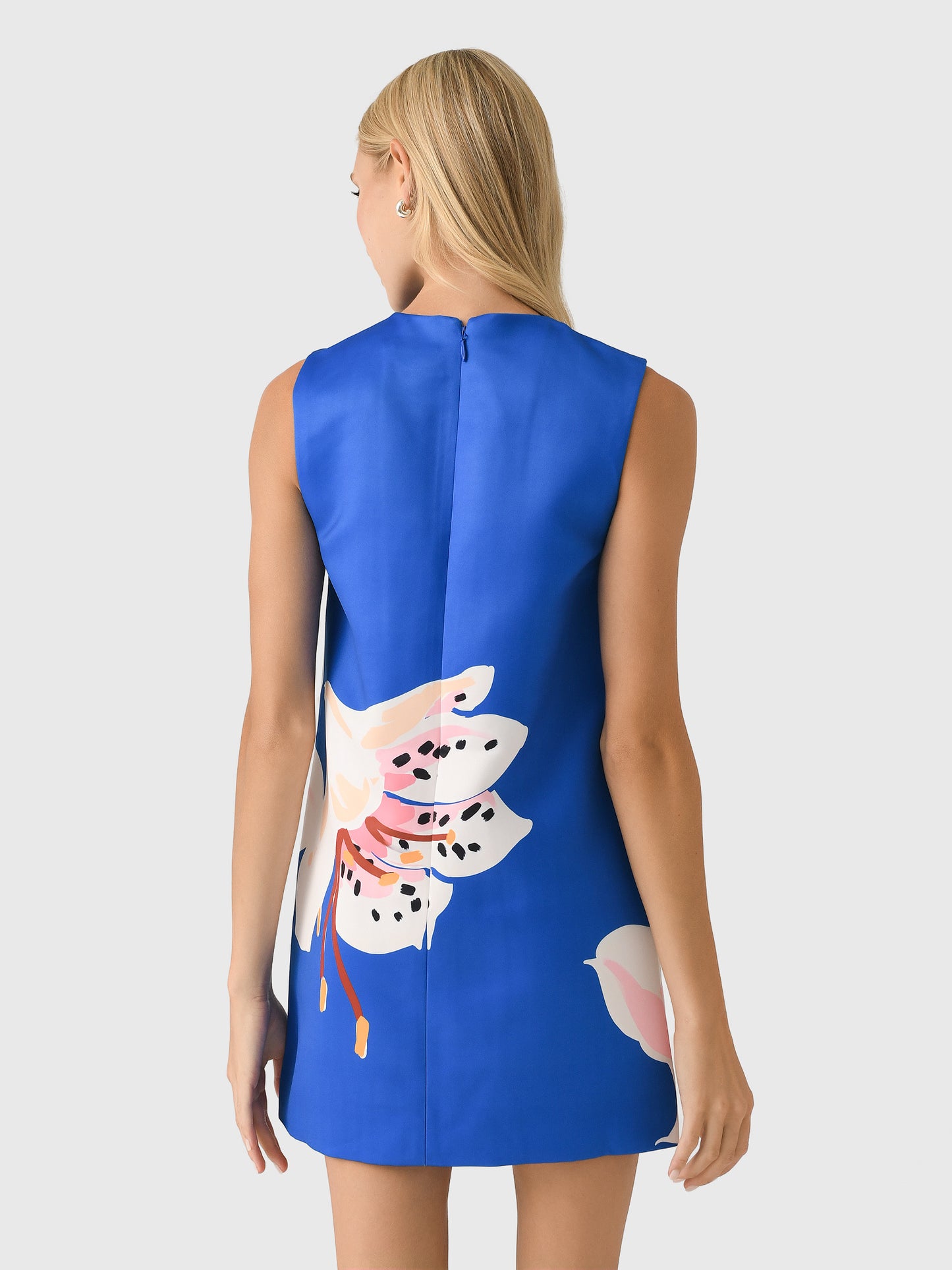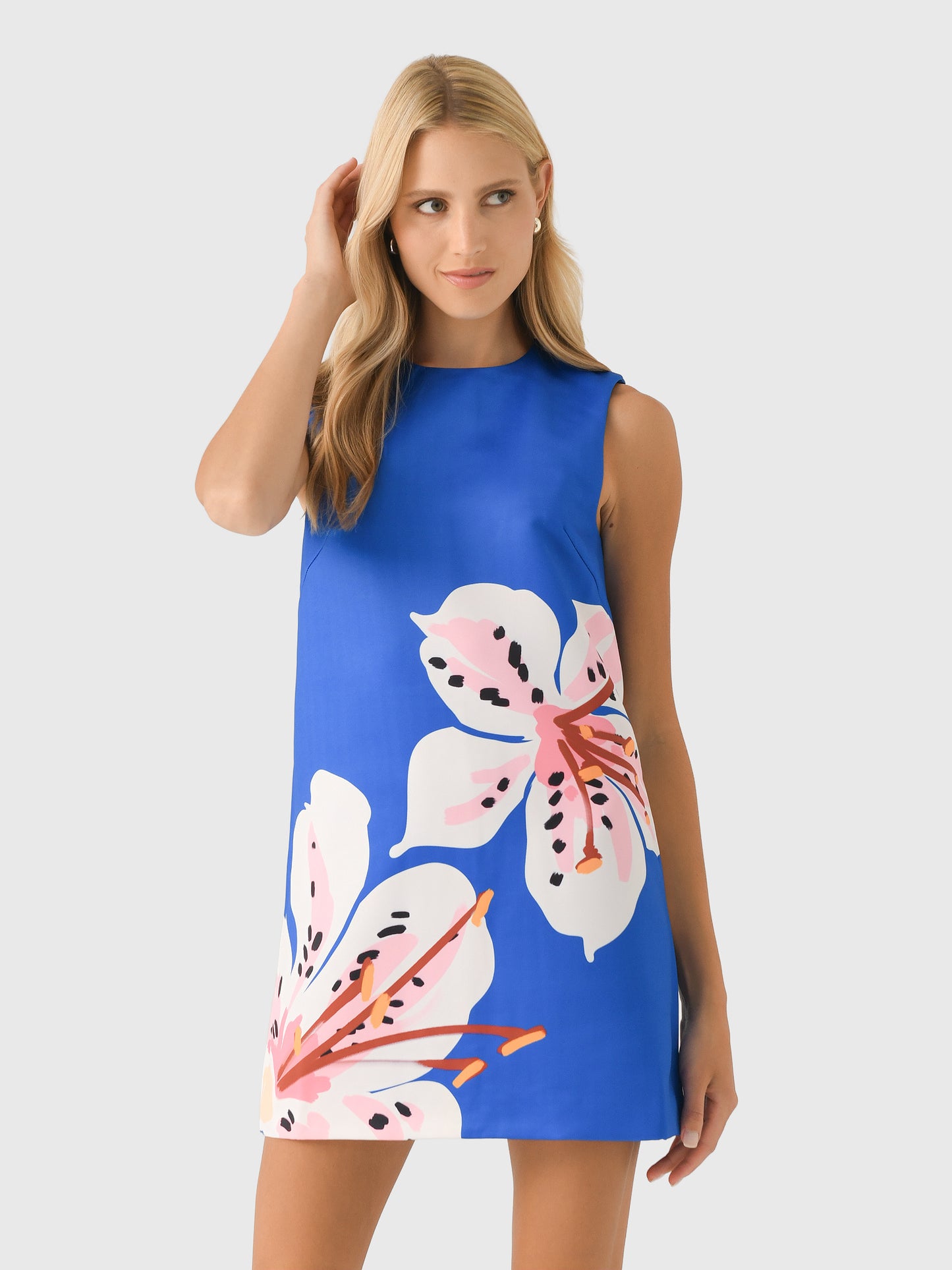 A chic mini dress featuring a custom lily print and a flattering A-line silhouette.