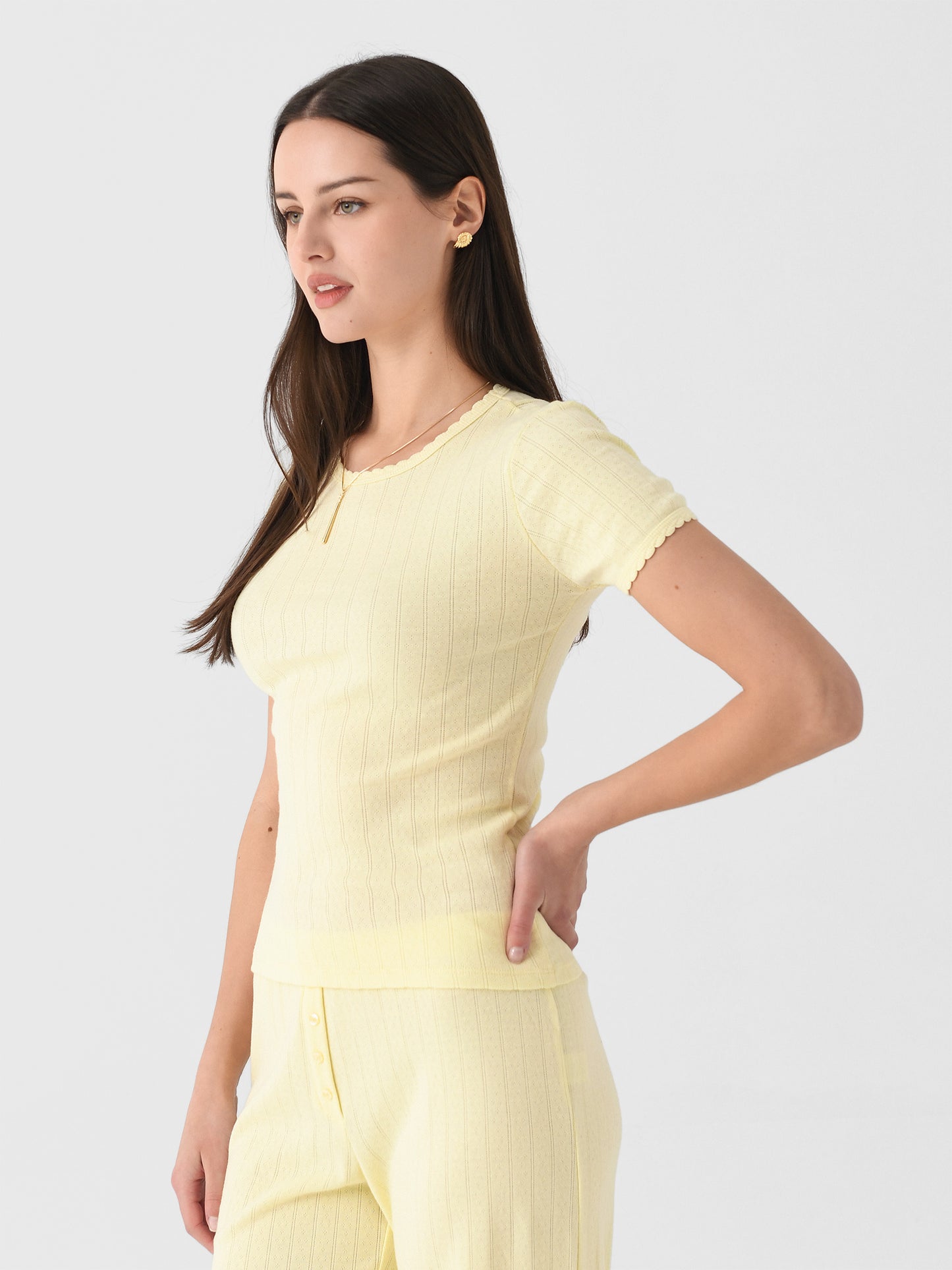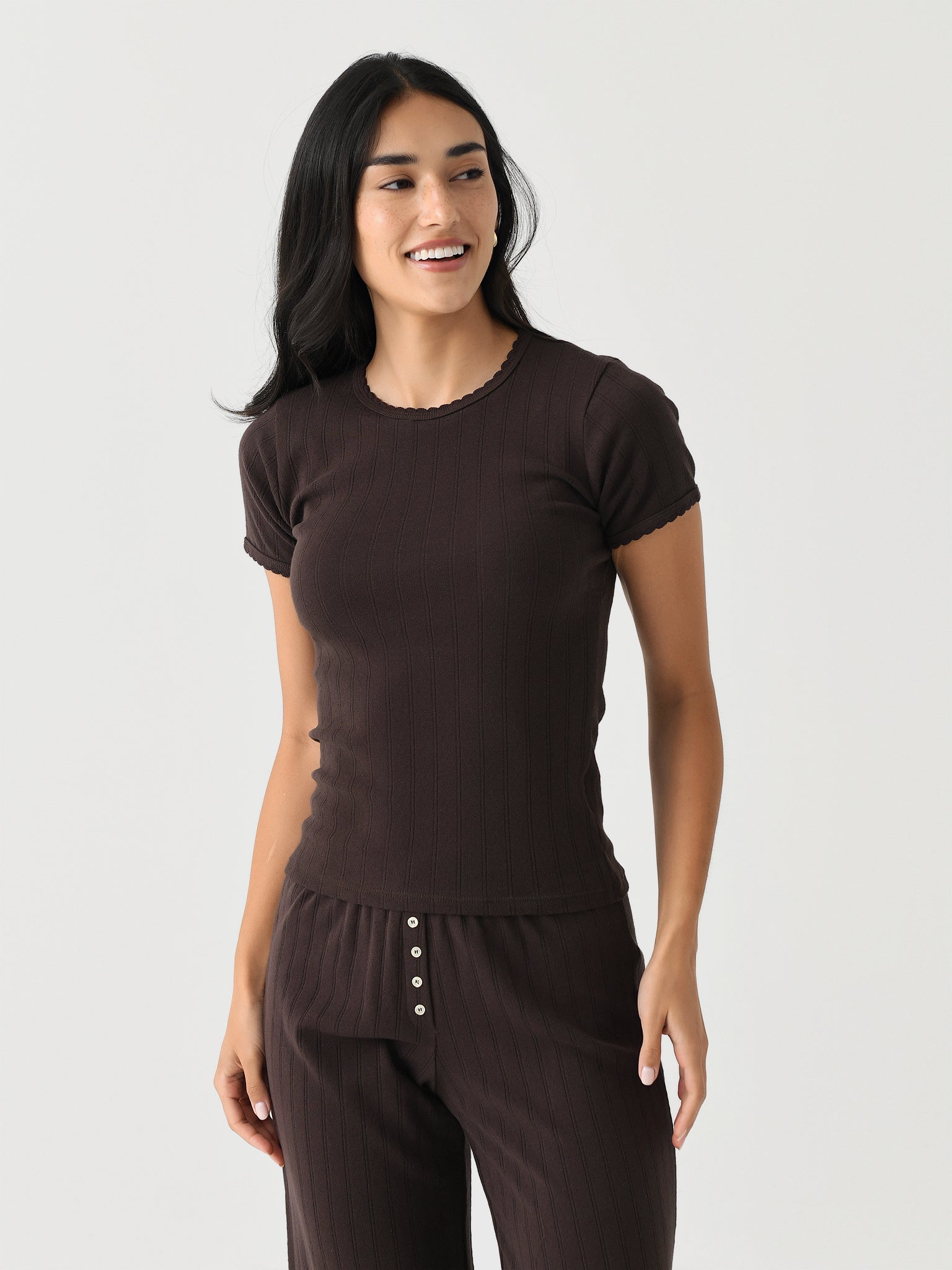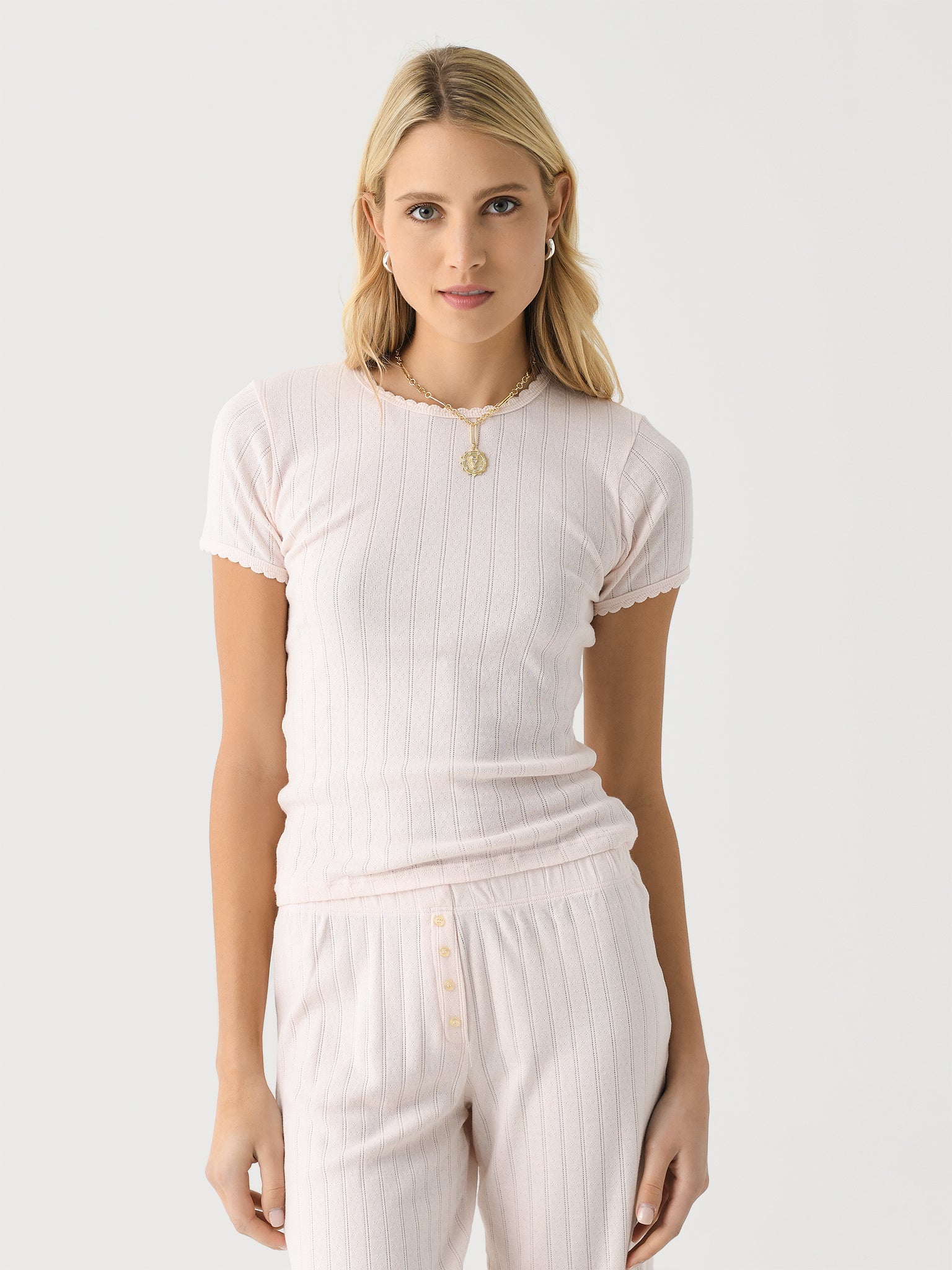 A slim-fitting crewneck tee constructed from soft cotton pointelle fabric.