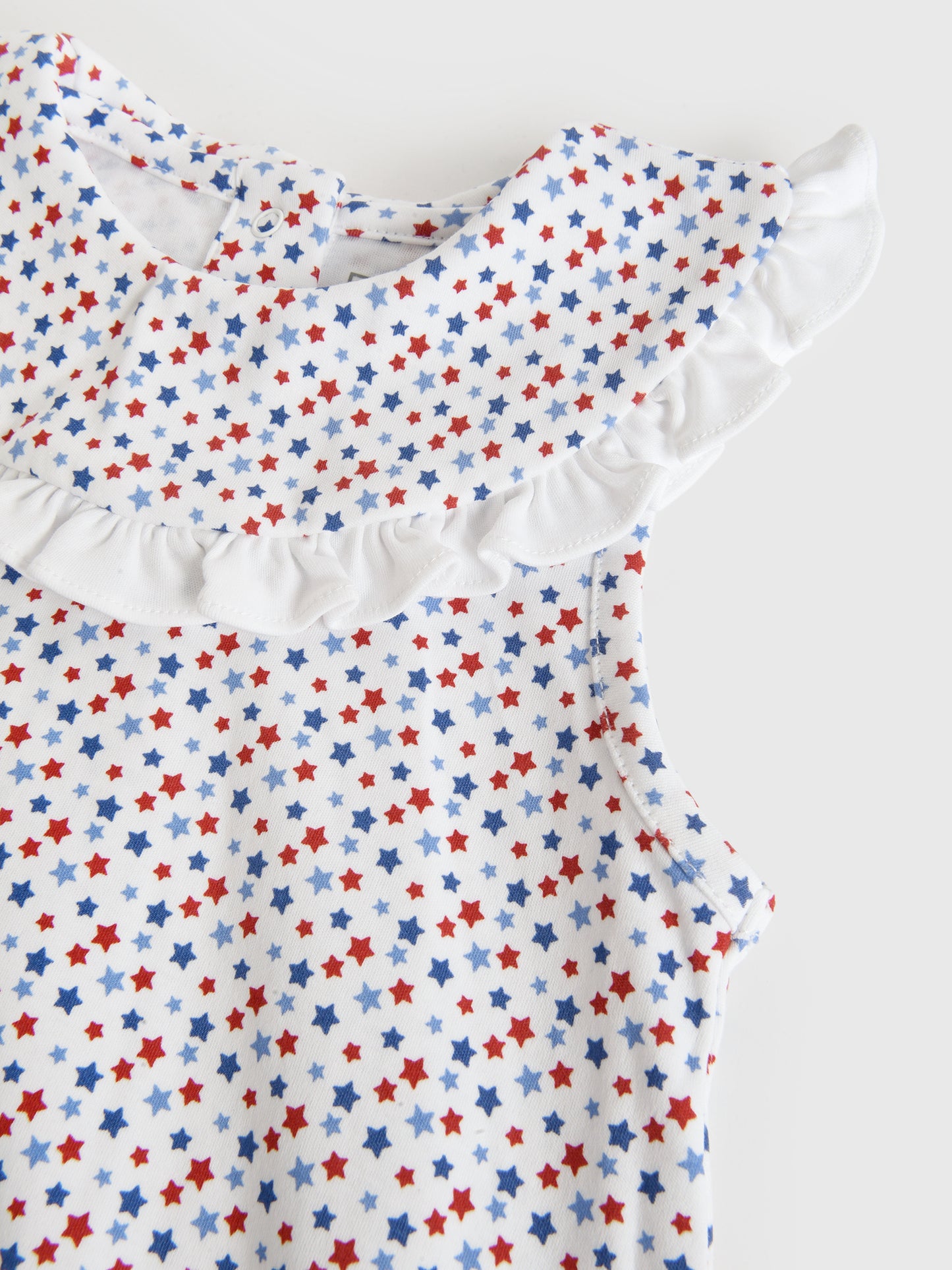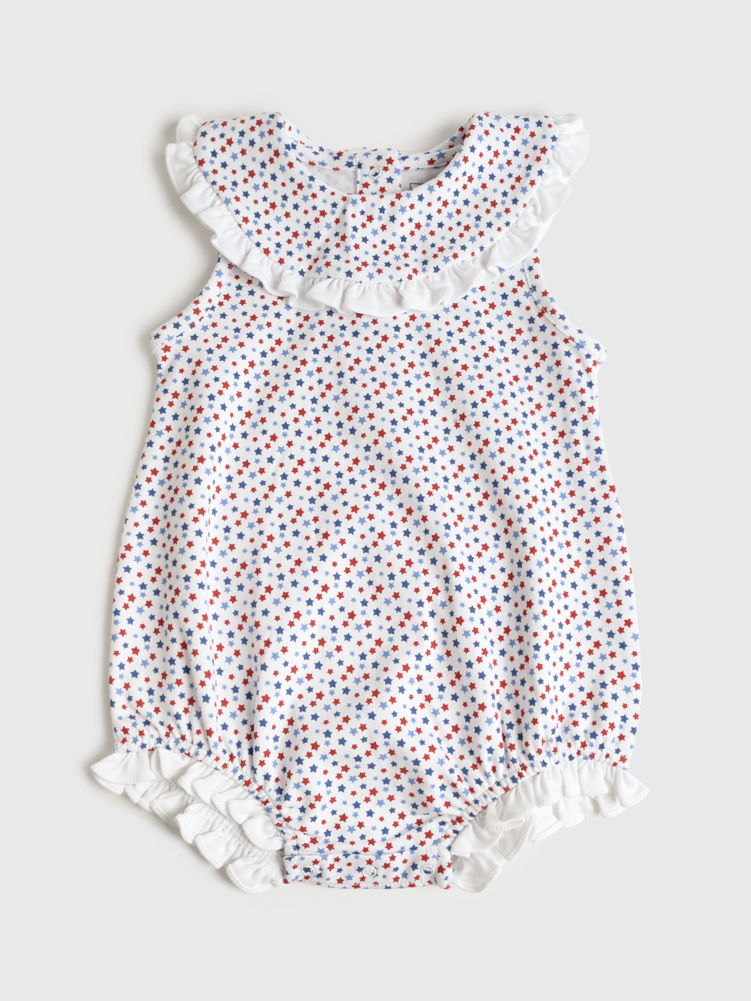 This patriotic bubble is made from soft Pima cotton and features a ruffled collar and starry print.