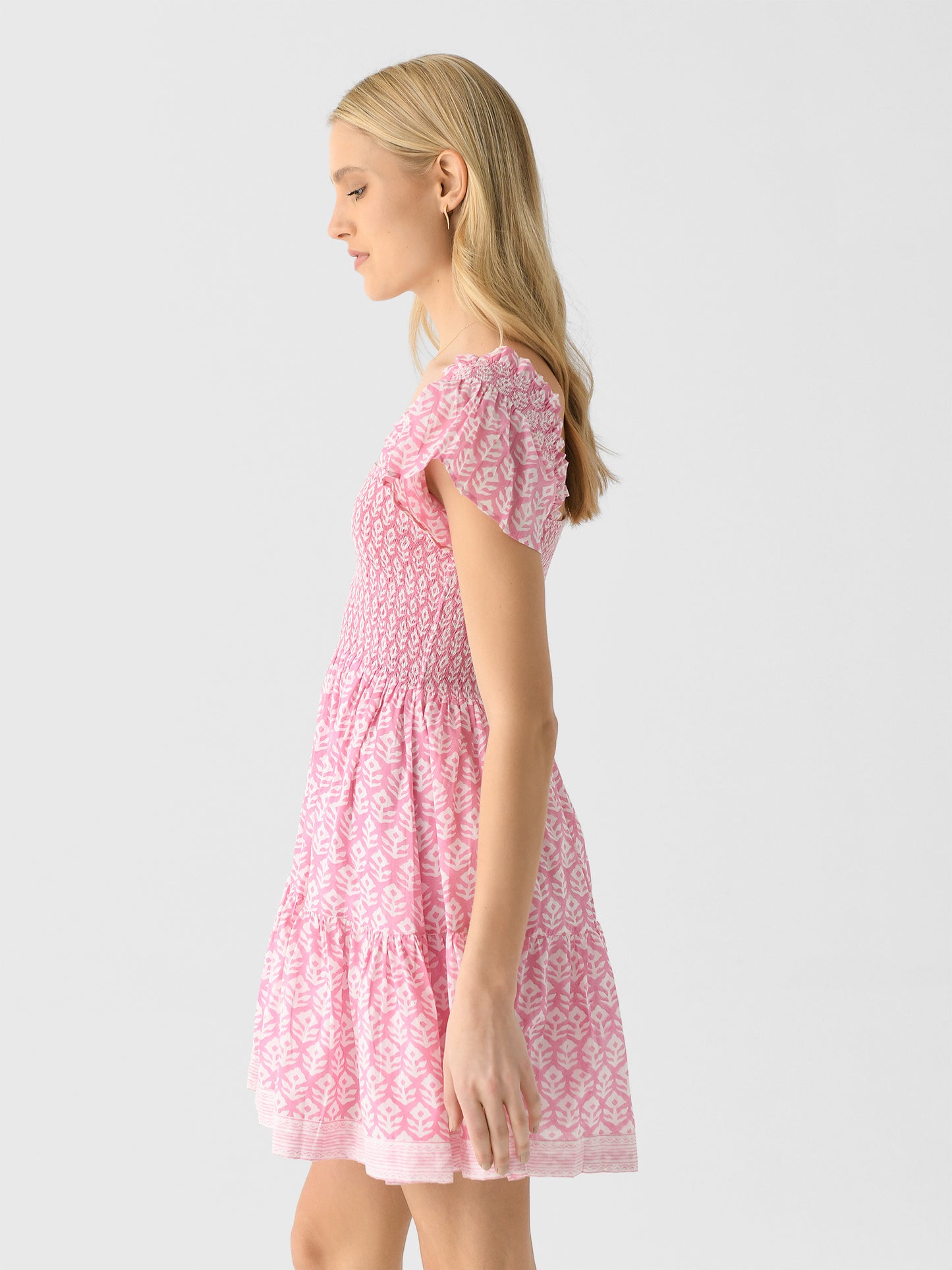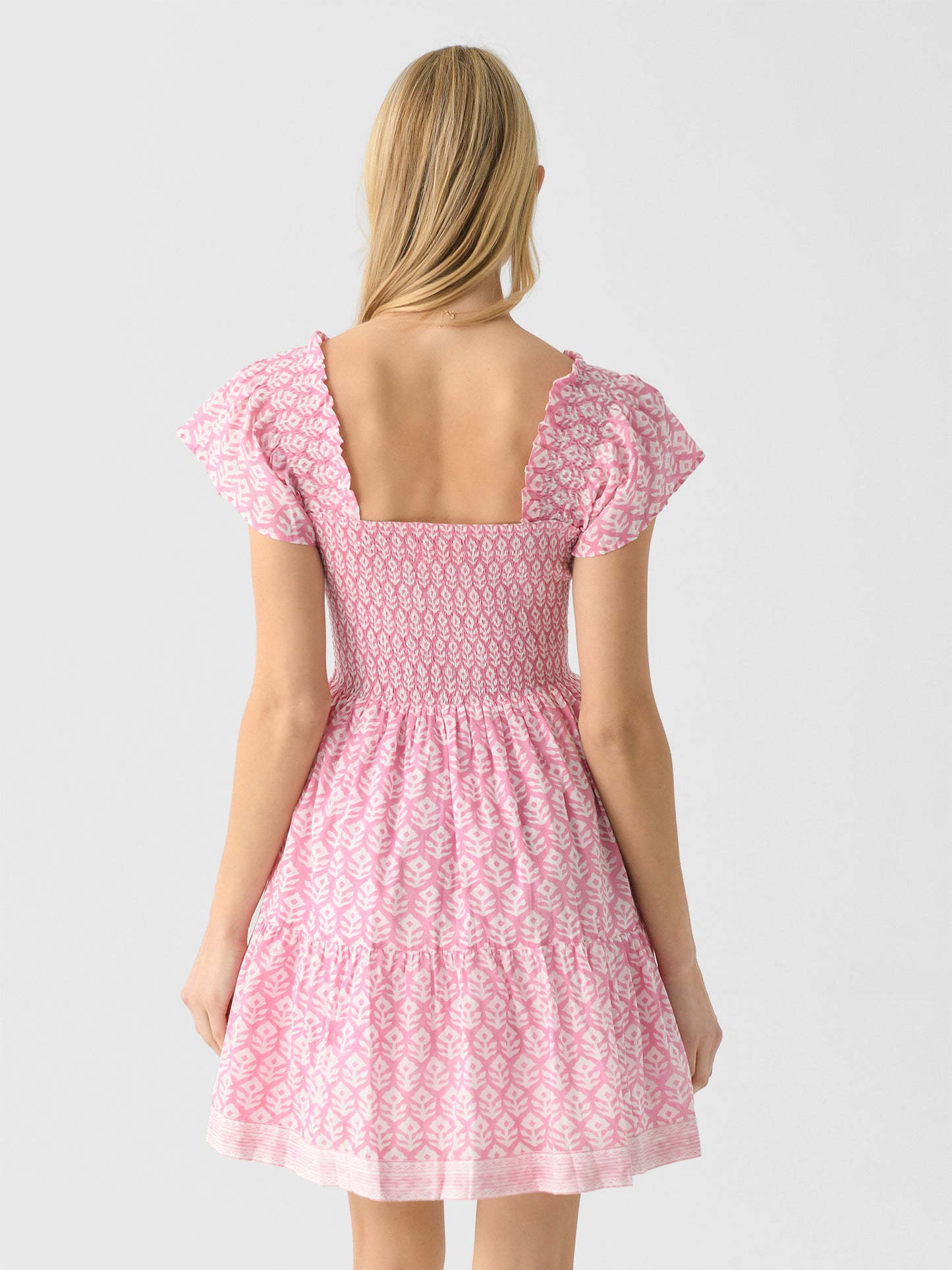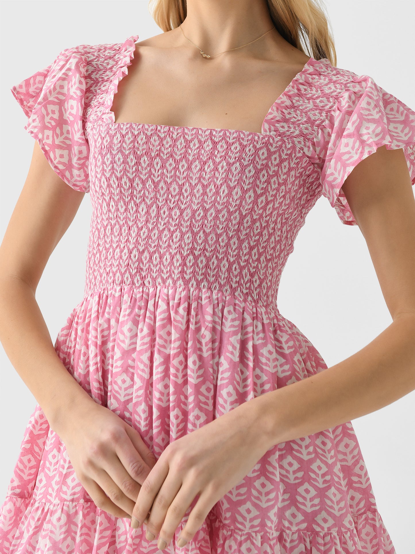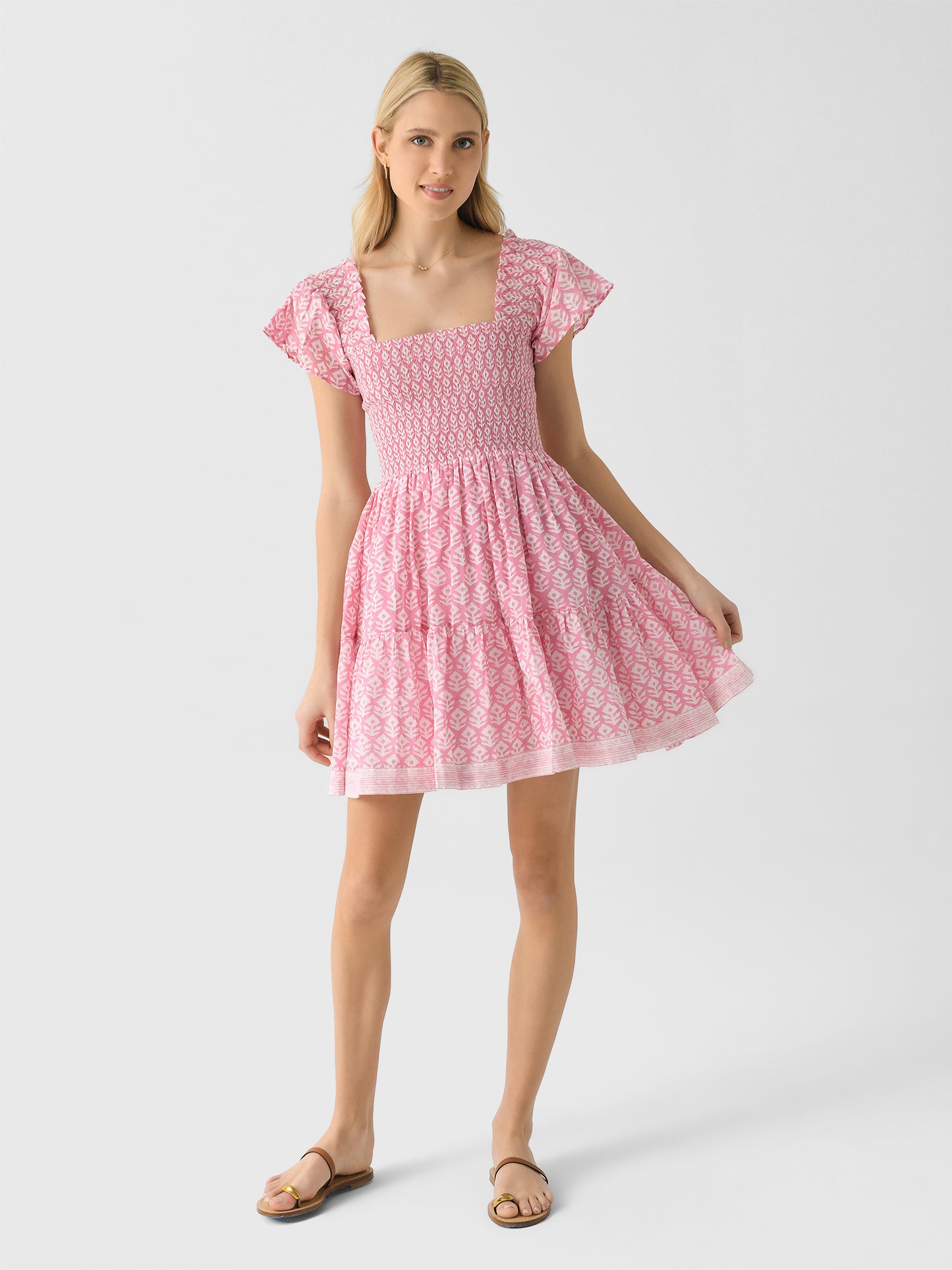 This lightweight dress is made from airy cotton and features a custom block print, flutter sleeves, and a smocked bodice.