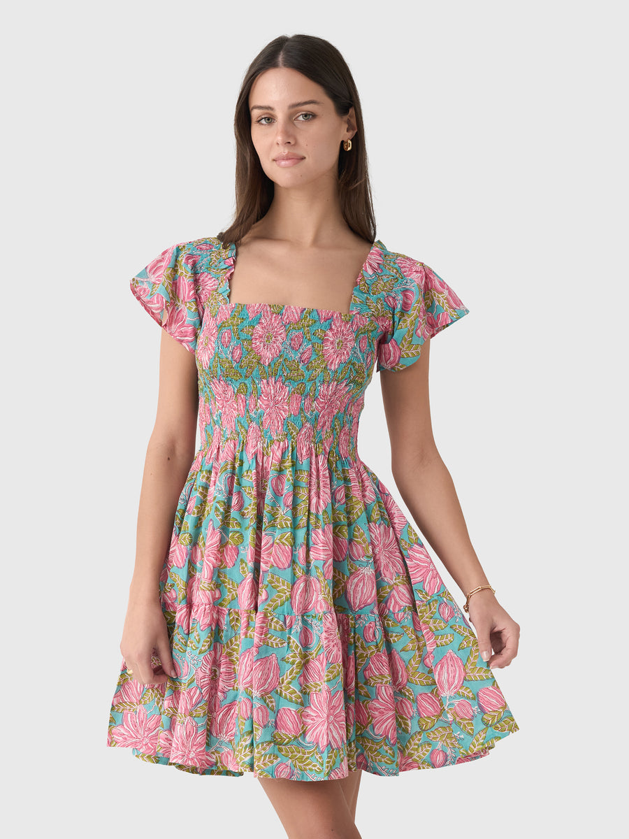 This lightweight dress is made from airy cotton and features a custom block print, flutter sleeves, and a smocked bodice.