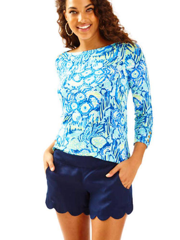 The Dahlia Short has a 4 inch inseam and a scallopped hem. You'll love this soft flat front short if you're looking for a shorter option of your favorite Lilly scallopped shorts.