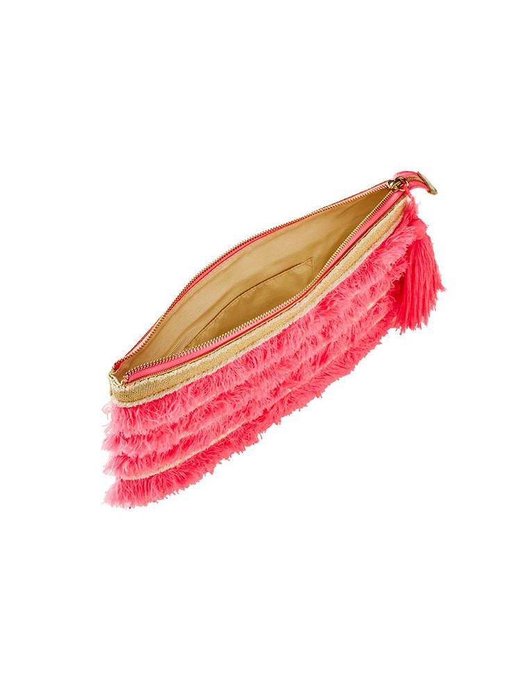 - Neon Fringe Beach Clutch With Gold Trim And Tassel Detail.