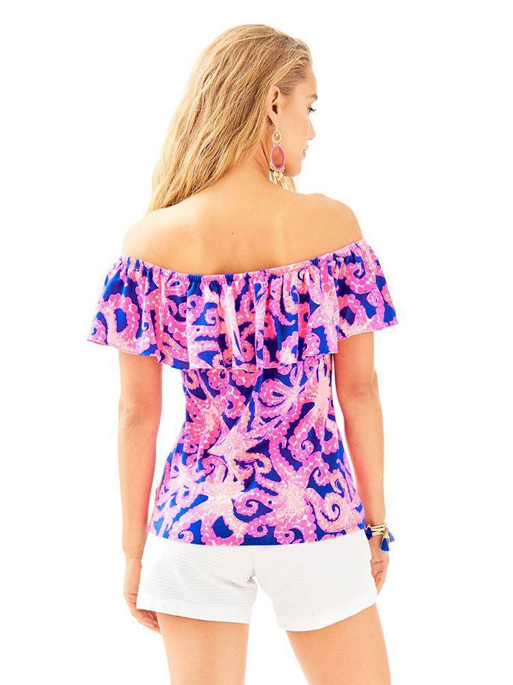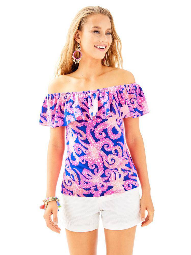 The La Fortuna Top is a flounced top that has a logo embroidery at the hem. Thisprinted off-the-shoulder top is the perfect complement to solid shorts.