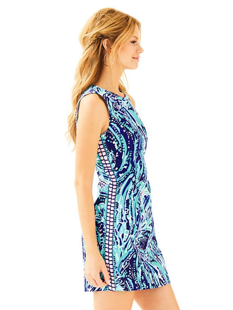- Straight Fit Shift Dress With Multi Colored Crochet Details.