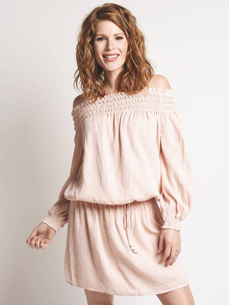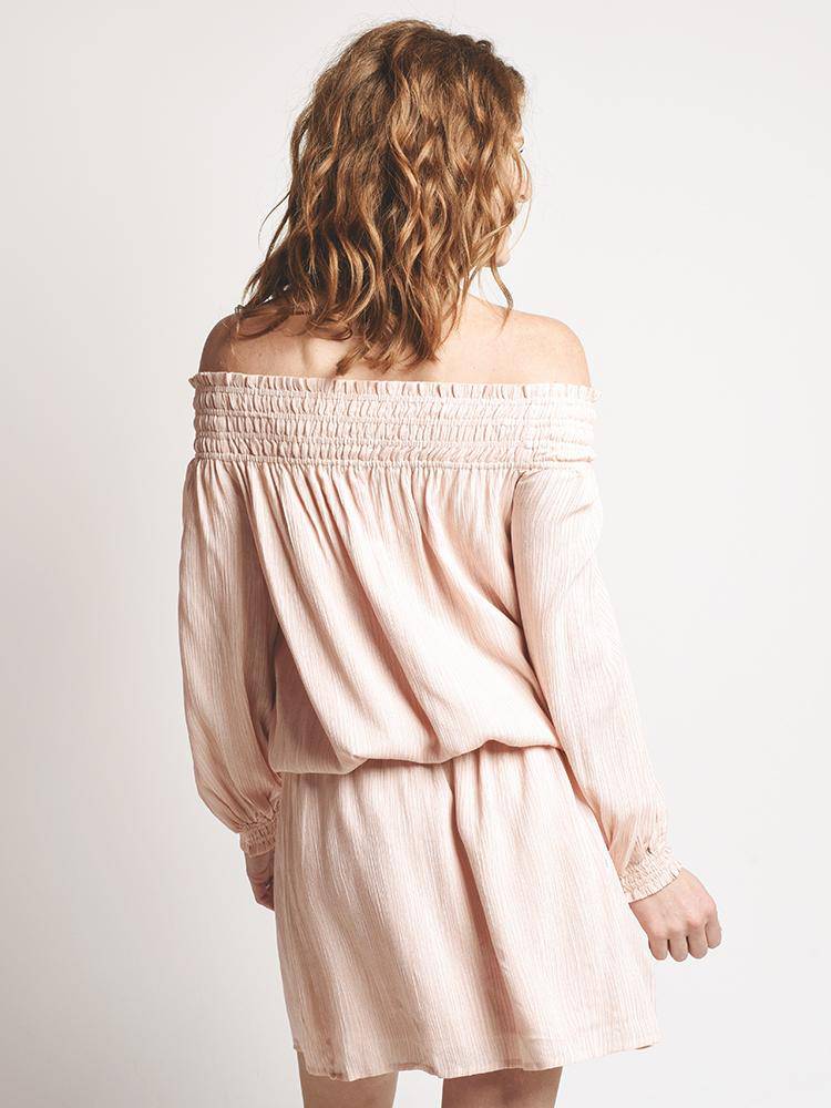 The Line and Dot Inez Off Shoulder Dress is right on trend with a smocked waistband and off the shoulder neckline.