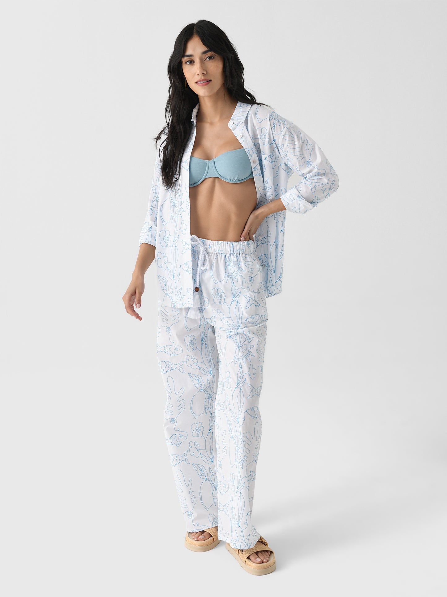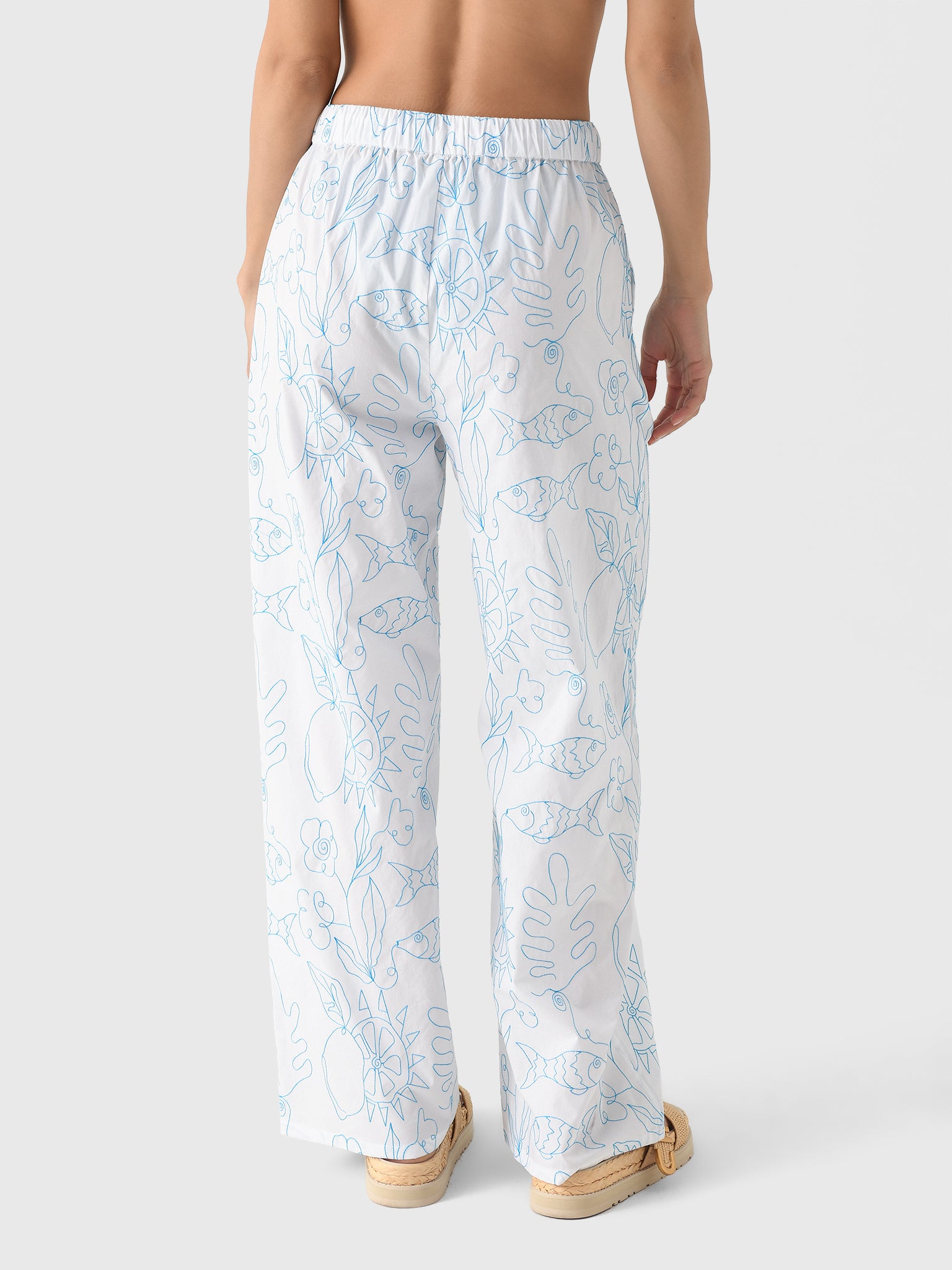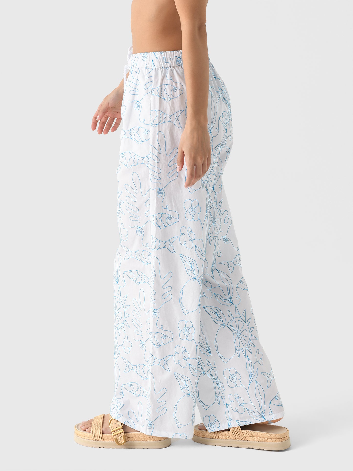 This cotton drawstring pant is adorned with hand-embroidered motifs, inspired by Patmos, Greece. The fish, lemons, and lush botanical elements celebrate the island's culture and nature.