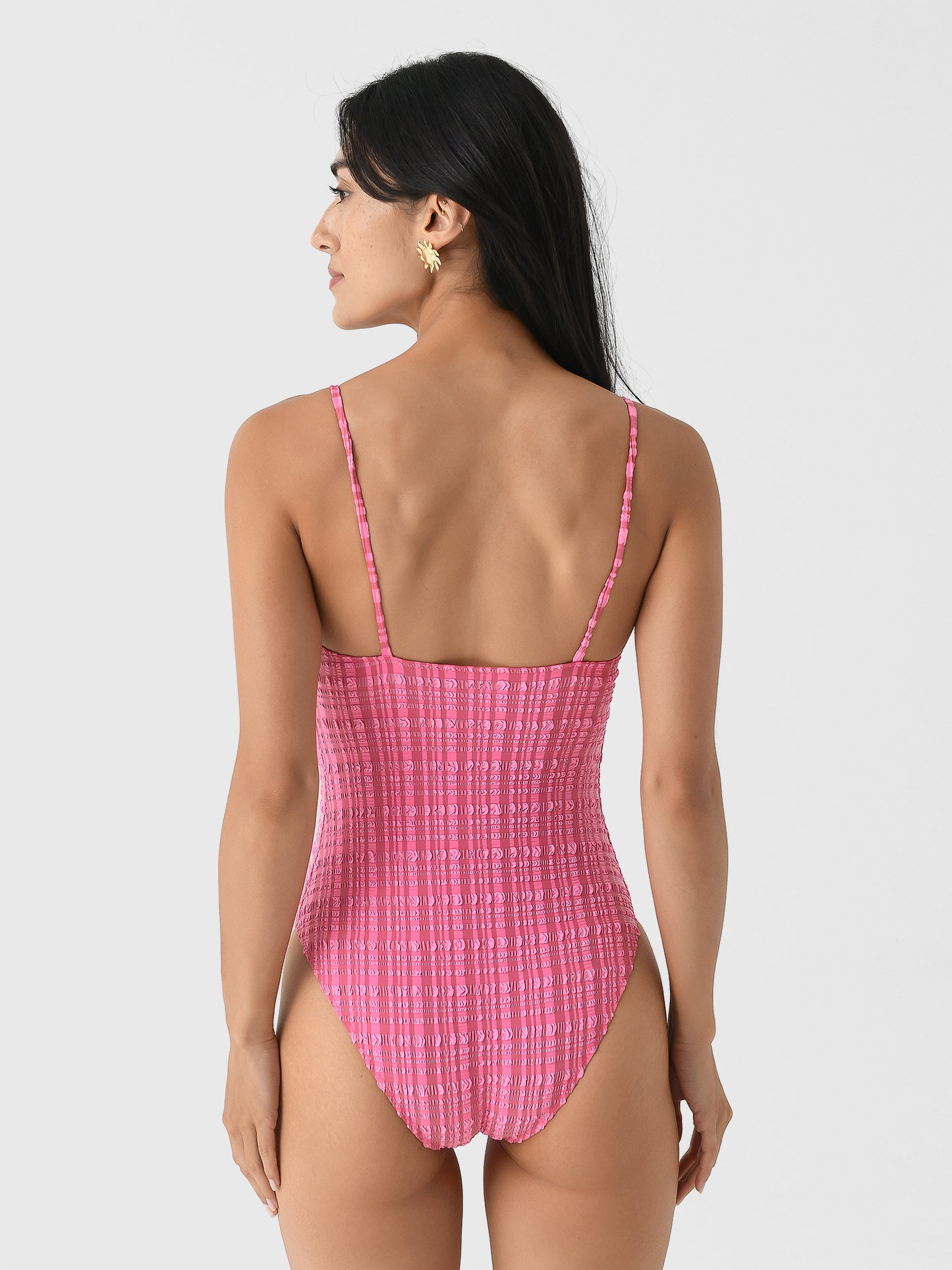This retro-inspired swimsuit is made from printed seersucker fabric and features a flattering décolleté with self-tie details.