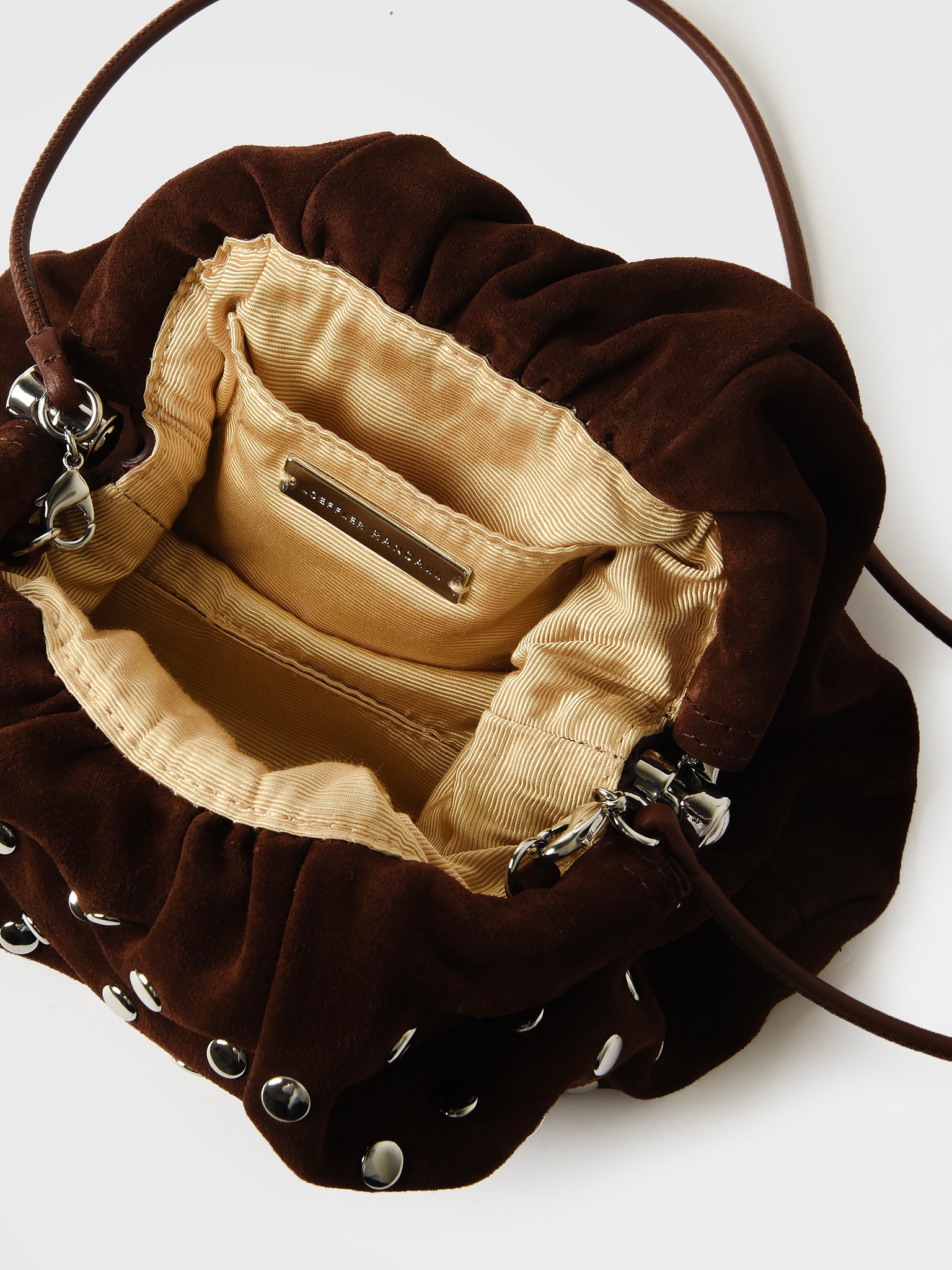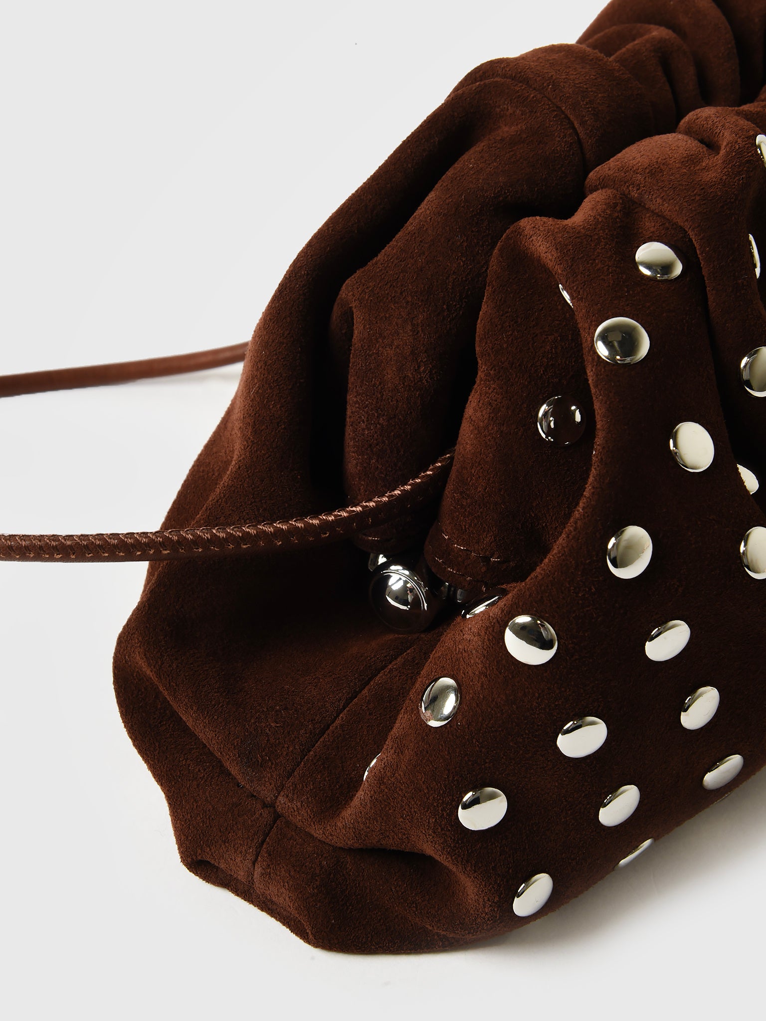 A dome-shaped clutch made from velvet suede and finished with silver stud embellishments and a removable strap.