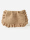 Natural, crocheted raffia clutch with ruffle trim detailing and a removable chain strap.